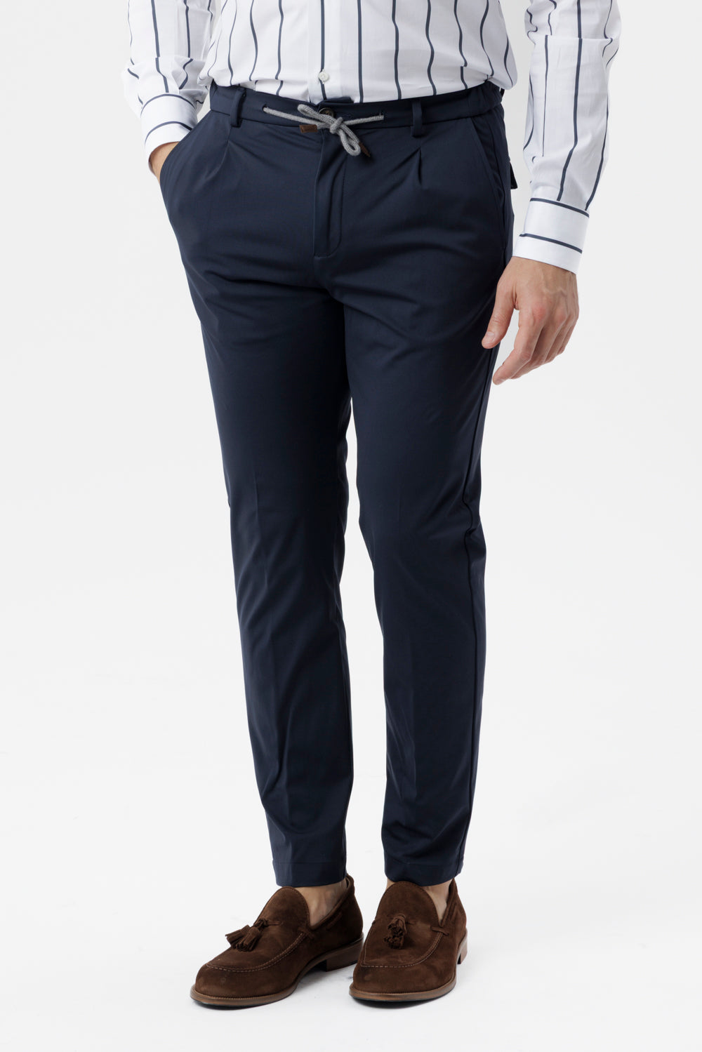 Questo pantalone in pregiato tessuto tecnico è pensato per chi cerca un capo versatile, leggero e senza compromessi sullo stile. Il design contemporaneo, arricchito dalla coulisse in vita, garantisce una vestibilità regolabile e confortevole, mentre la pences frontale dona struttura e movimento alla silhouette. I dettagli come le tasche America, e le tasche posteriori con bottone e pattina conferiscono un tocco sartoriale senza rinunciare alla funzionalità.