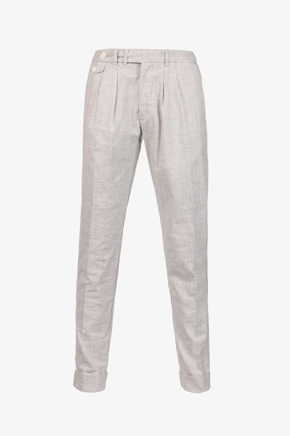 Pantalone realizzato in pregiato cotone, definito dal motivo pied de poule che interpreta con equilibrio la tradizione sartoriale e dona profondità visiva alla silhouette.