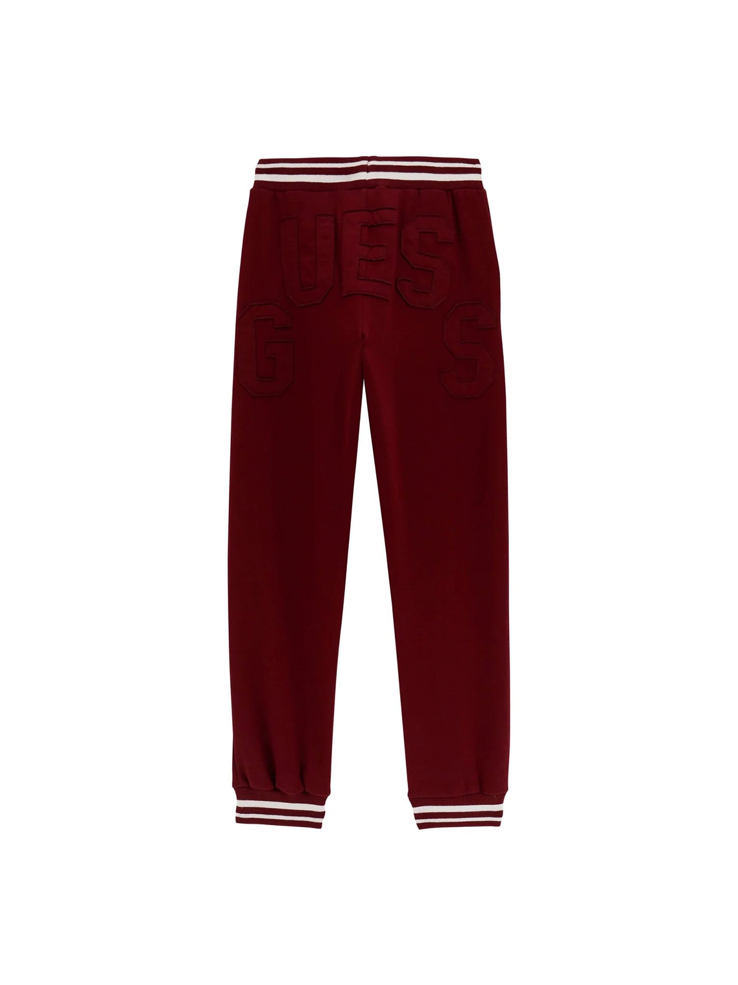Pantalone jogger Guess bambino in morbida felpa, perfetto per un look sportivo e di tendenza. I profili a contrasto aggiungono un tocco varsity contemporaneo, mentre il maxi logo tono su tono sul retro completa il design.