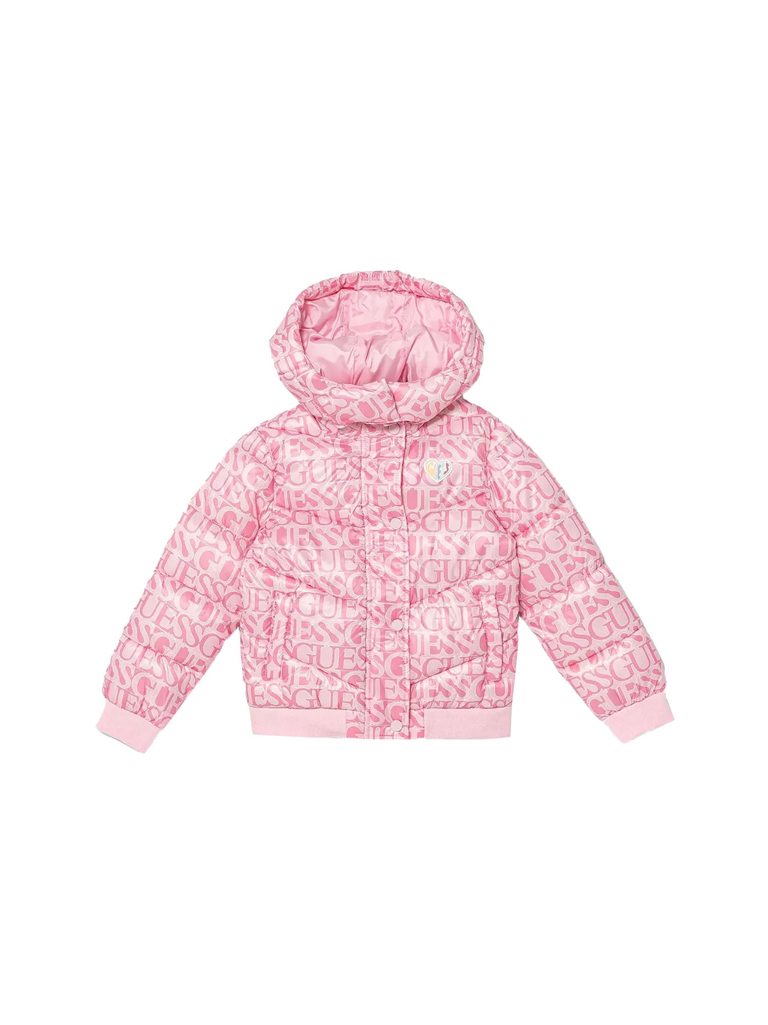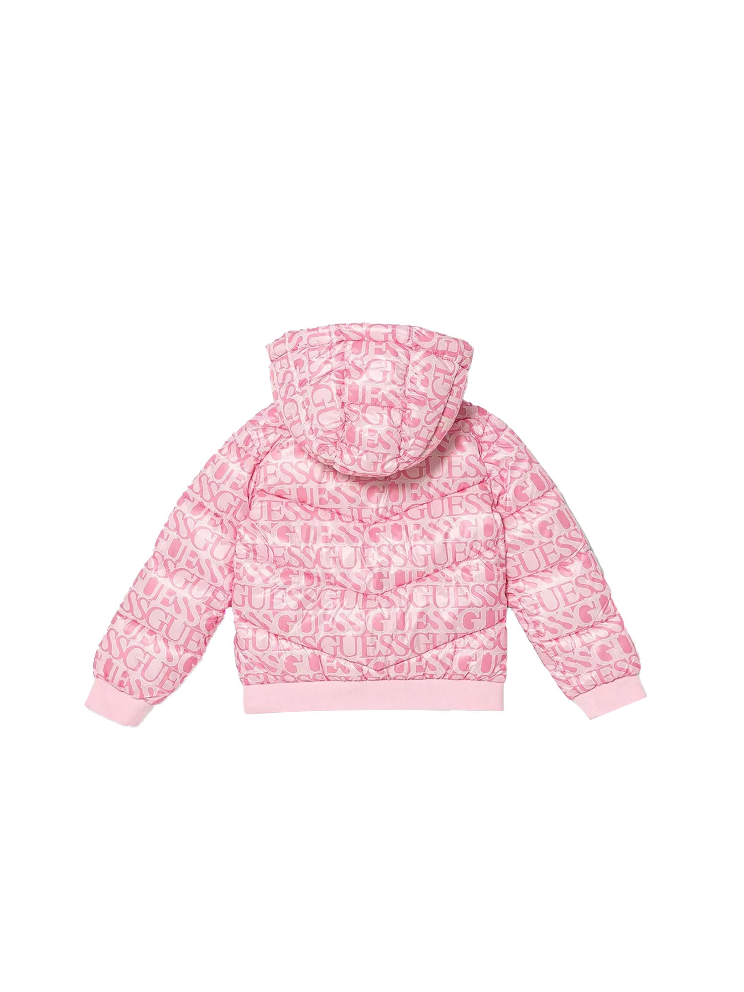 Piumino Guess con cappuccio con logo allover fucsia