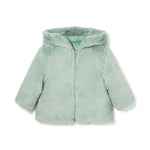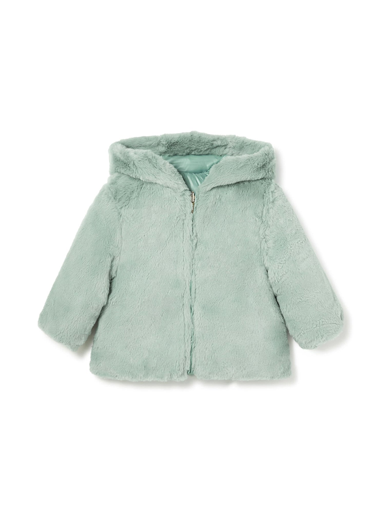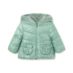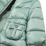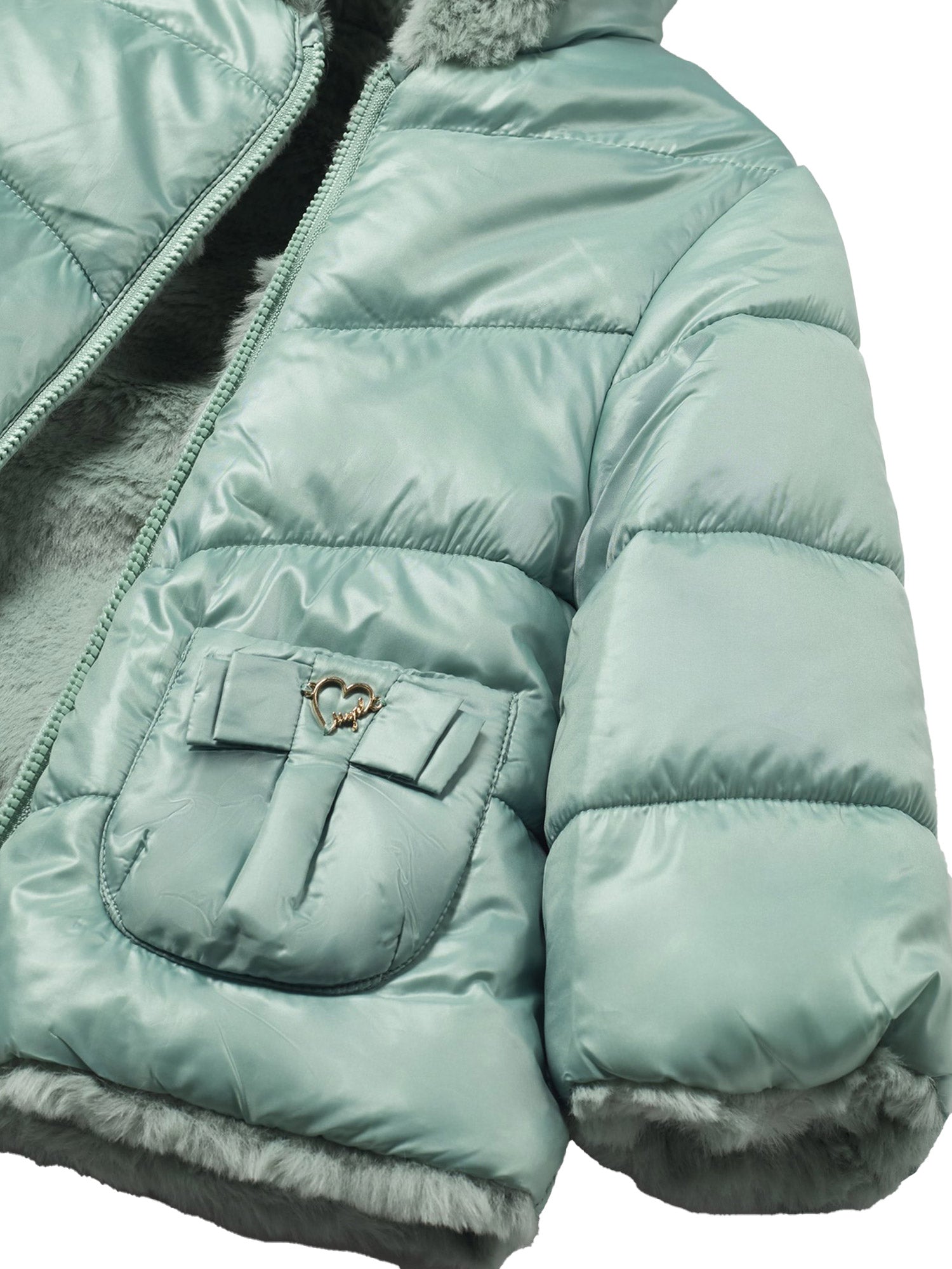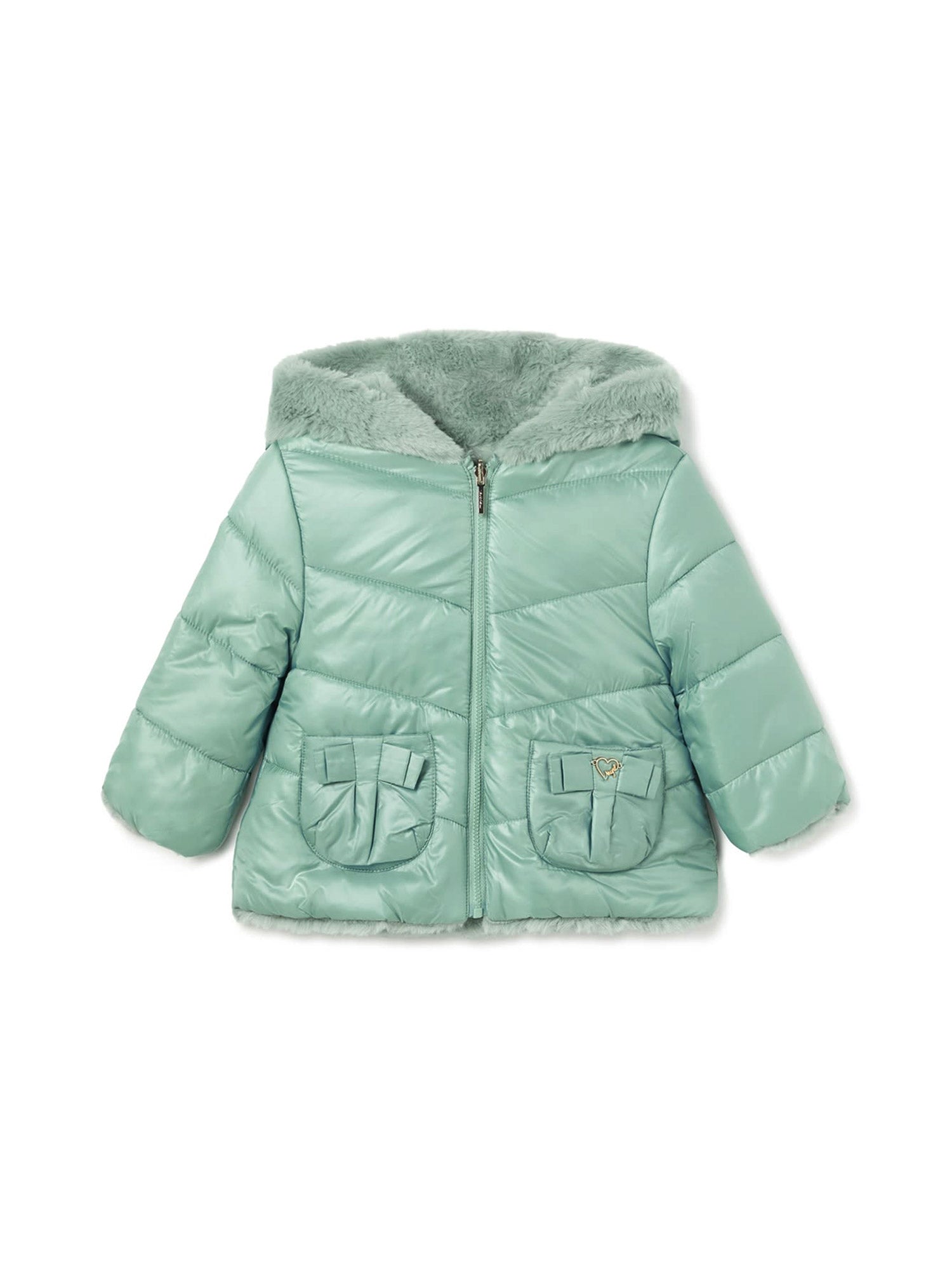 Piumino neonata reversibile Mayoral in tessuto imbottito di colore verde acqua, con un design trapuntato che dona un tocco di dolcezza e femminilità. Il cappotto ha un cappuccio bordato in soffice pelliccia sintetica, come il lato interno del piumino che aggiunge calore e morbidezza.