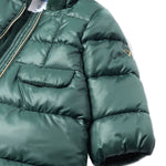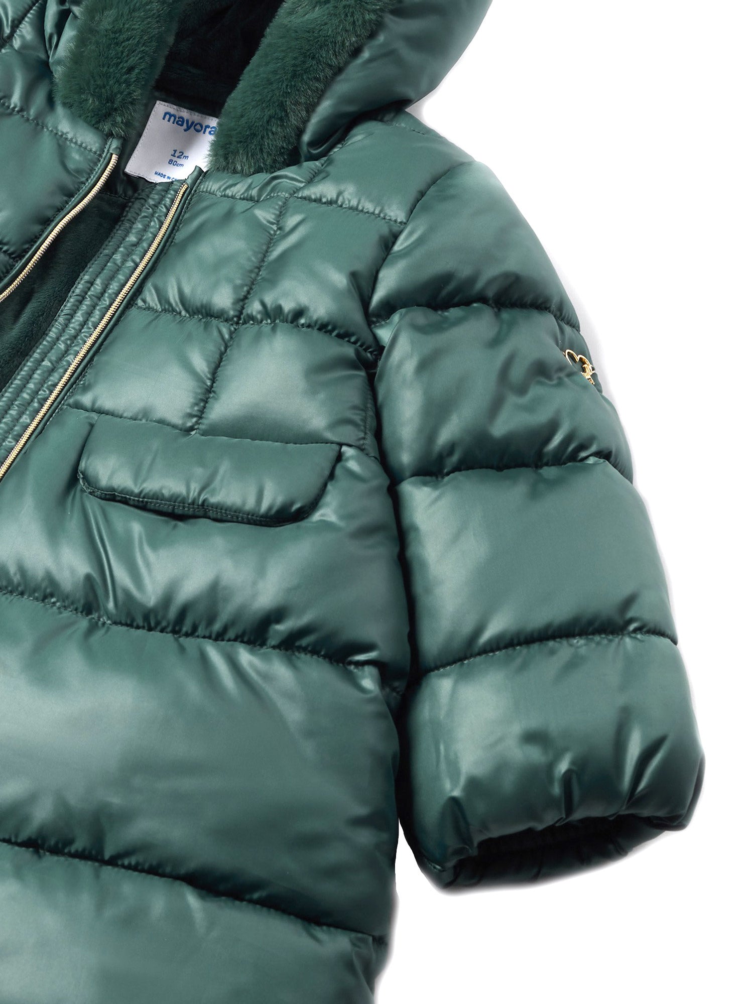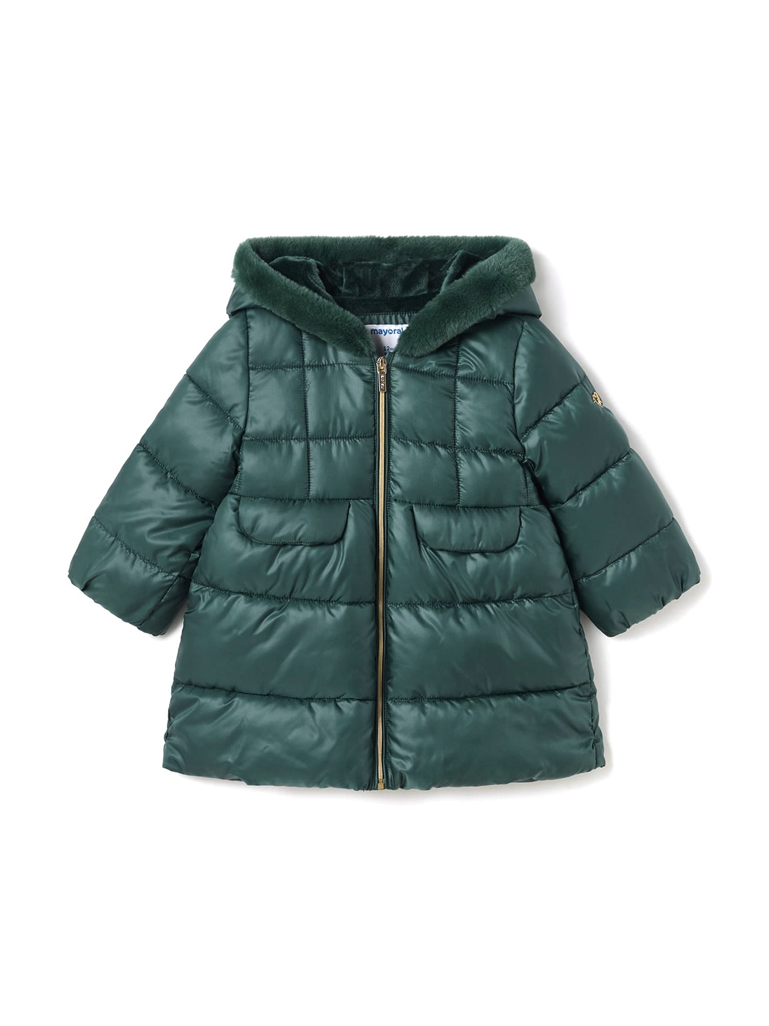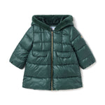 Giubbino imbottito lungo per neonata Mayoral, realizzato in un tessuto trapuntato di colore verde scuro, perfetto per la stagione invernale. L'imbottitura volumizzata lo rende particolarmente adatto a proteggere dal freddo mentre il taglio leggermente svasato fa si che sia comodo e stiloso, perfetto per essere indossato sia in occasioni casual che più formali.