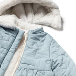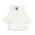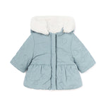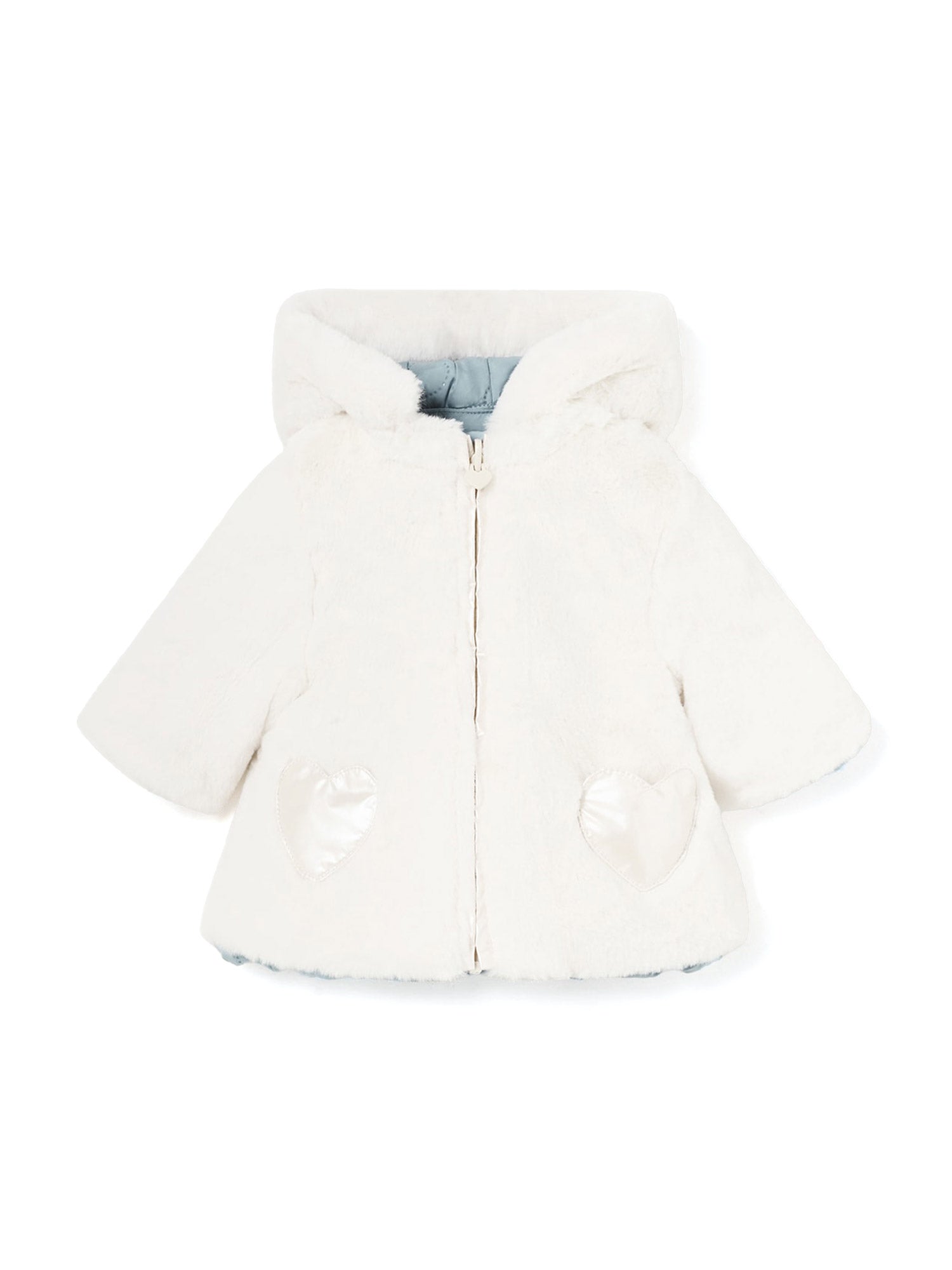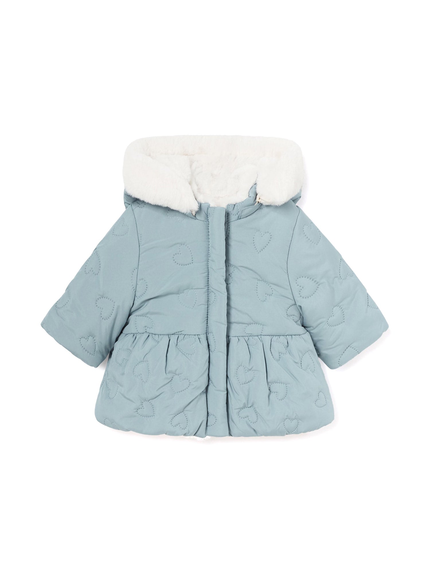 Piumino neonata reversibile Mayoral in tessuto imbottito di colore azzurro chiaro, con un design trapuntato a cuori che dona un tocco di dolcezza e femminilità. Il cappotto ha un cappuccio bordato in soffice pelliccia sintetica bianca, come il lato interno del piumino che aggiunge calore e morbidezza.