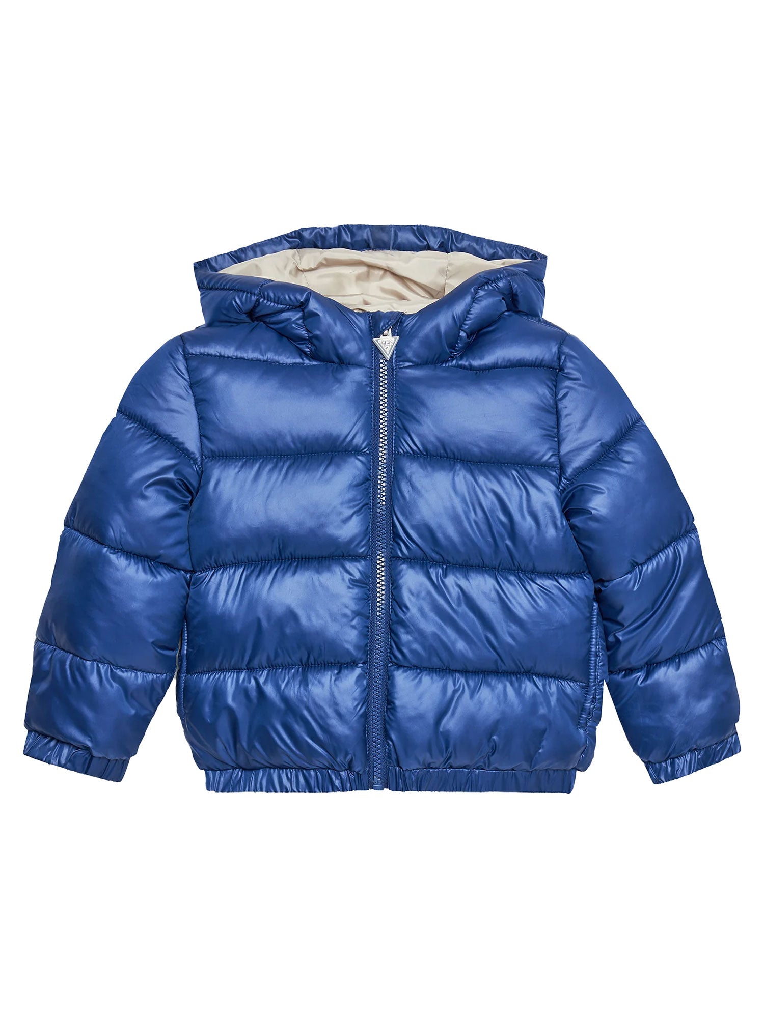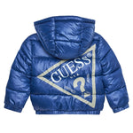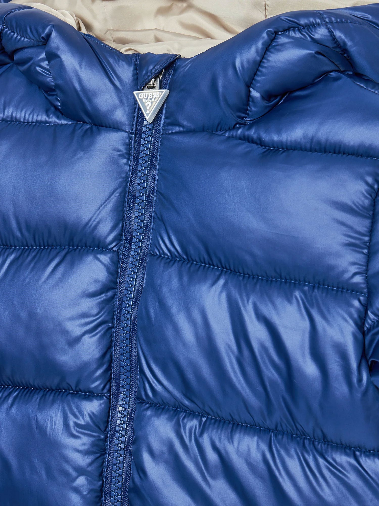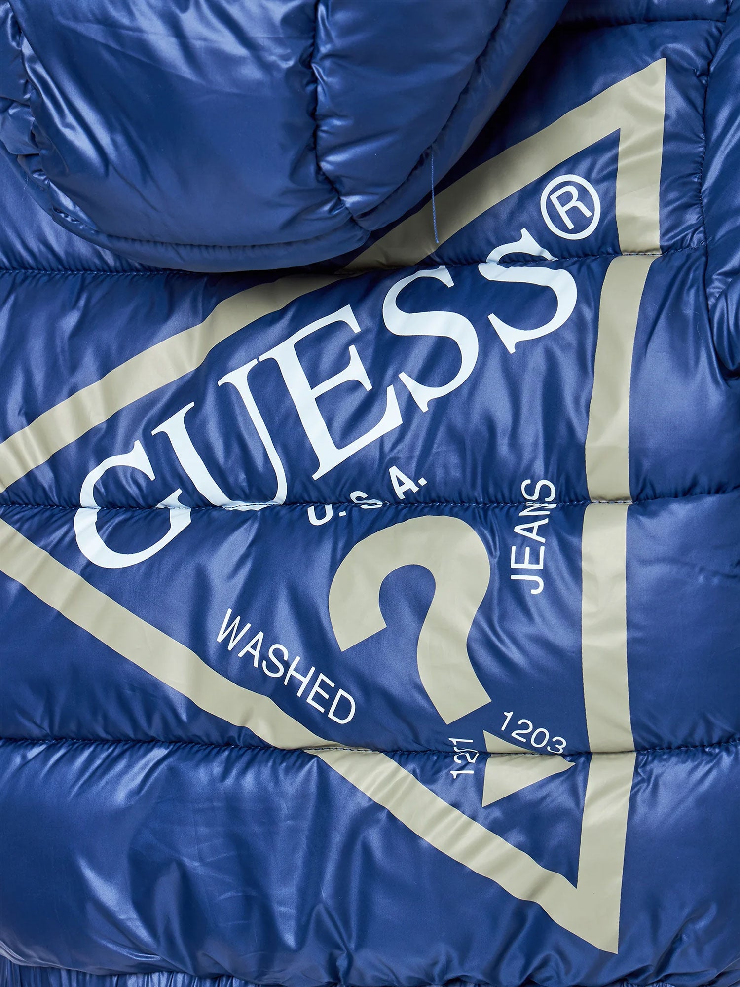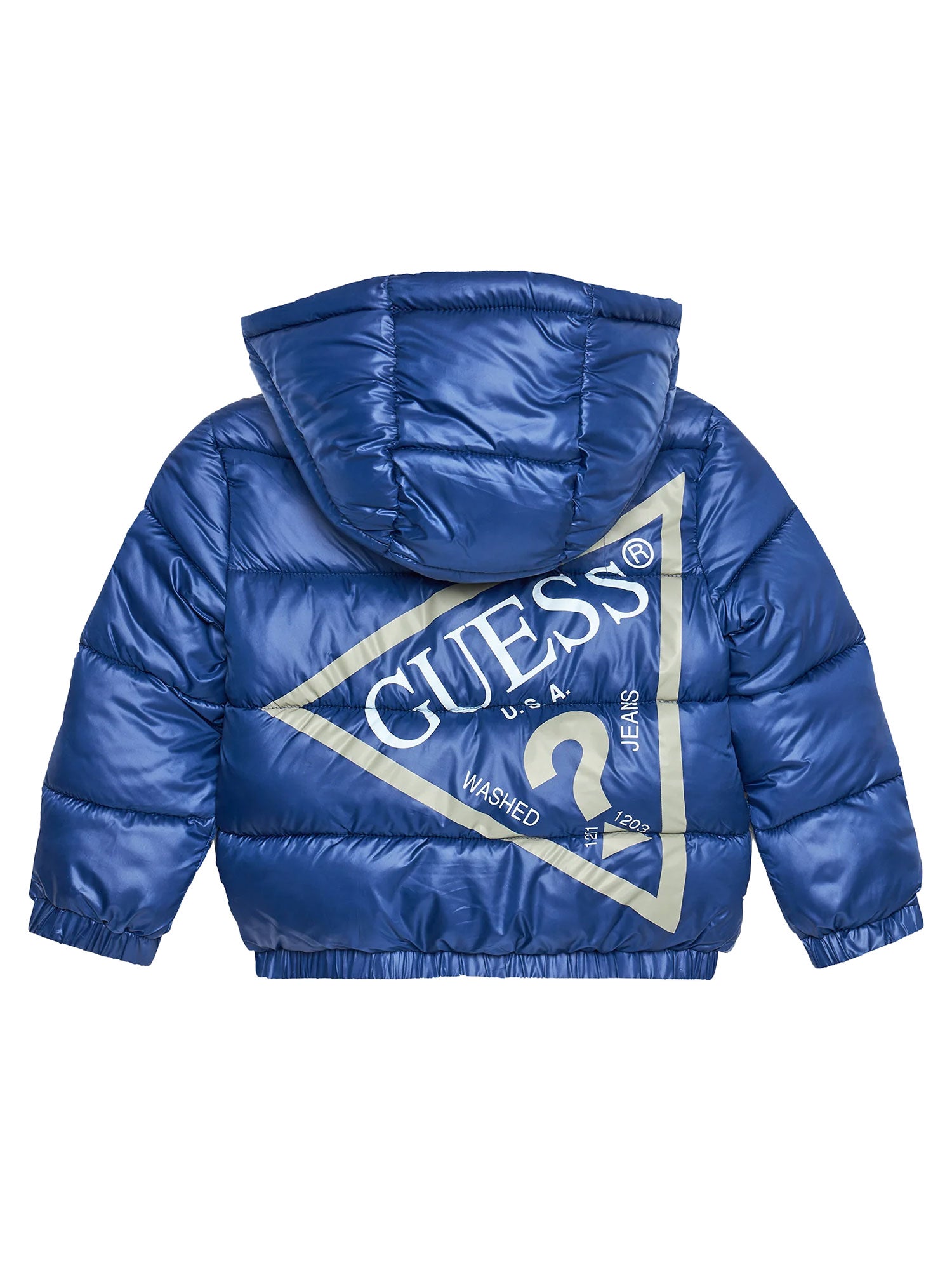 Piumino Guess bambino, modello imbottito con trapuntatura orizzontale. Si carartterizza per la stampa logo sulla parte posteriore.