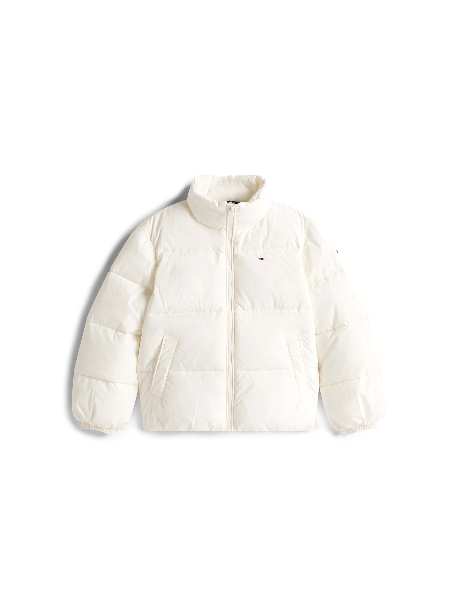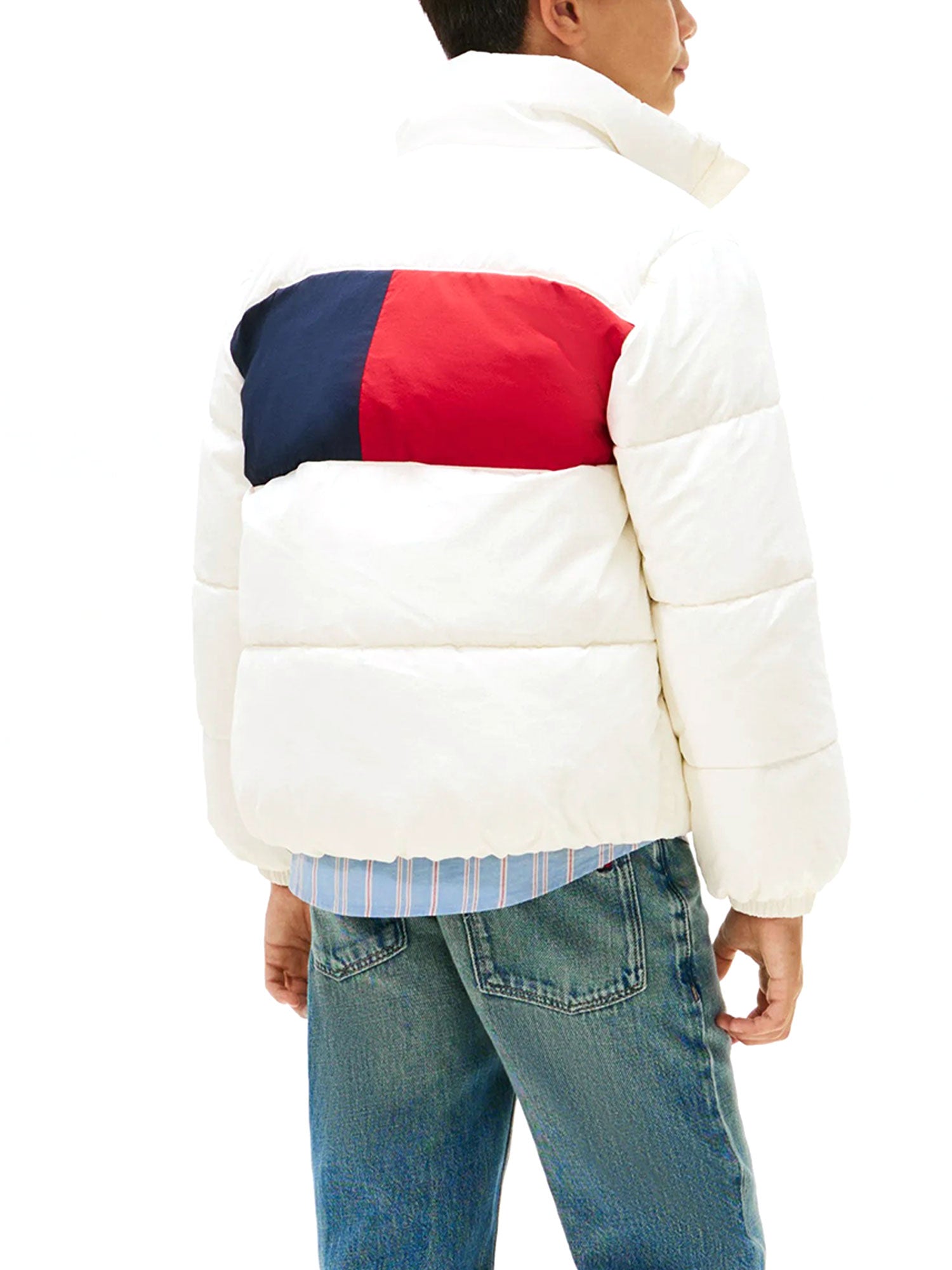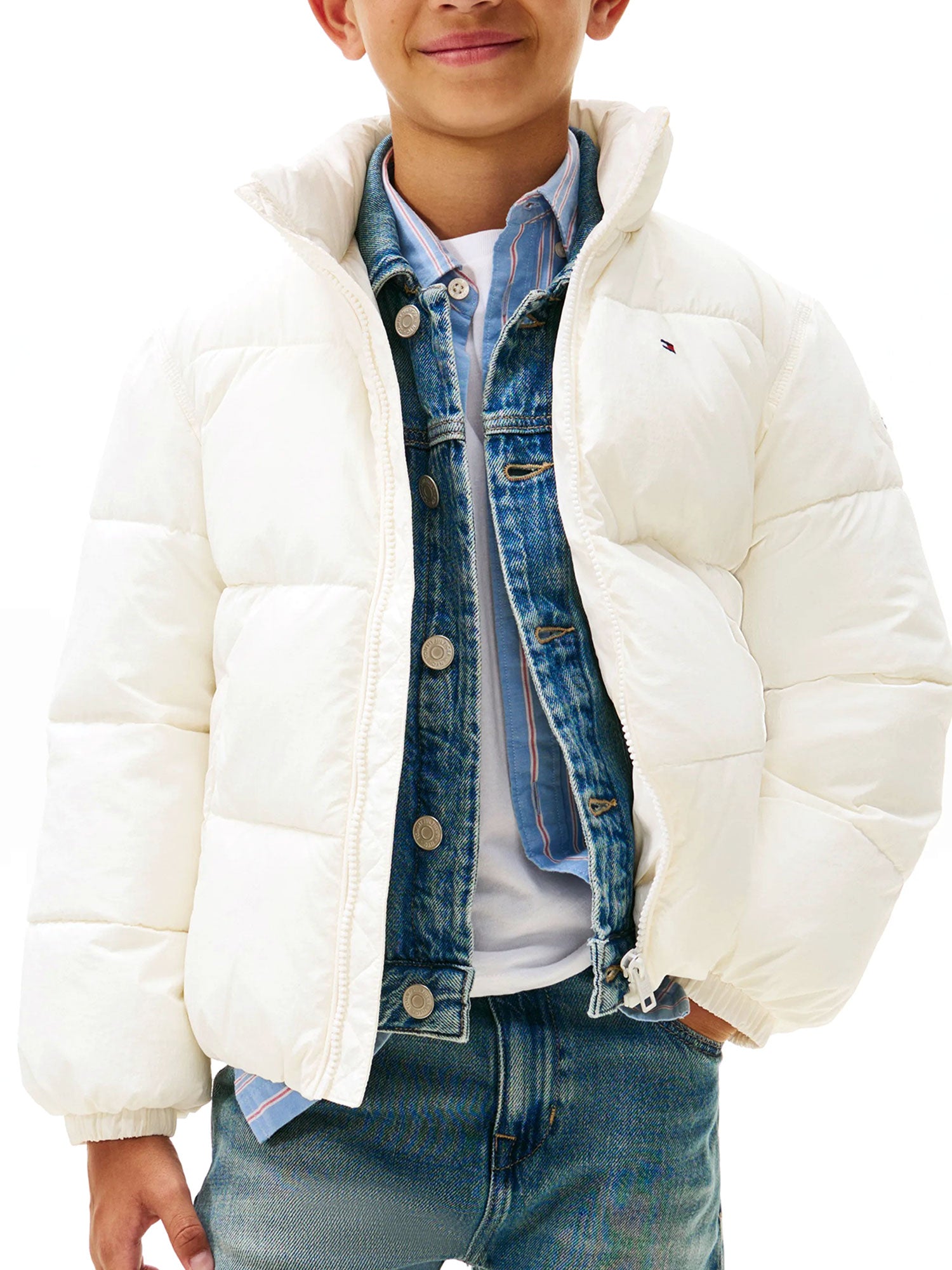 Giubbotto con zip Tommy Hilfiger bambino in nylon con stampa bandiera posteriore. Un capo iconico e versatile, perfetto per affrontare la stagione fredda con stile. L'imbottitura calda e la struttura leggera garantiscono comfort quotidiano, mentre il design ispirato al mondo heritage del brand aggiunge un tocco distintivo ai look dei più giovani.