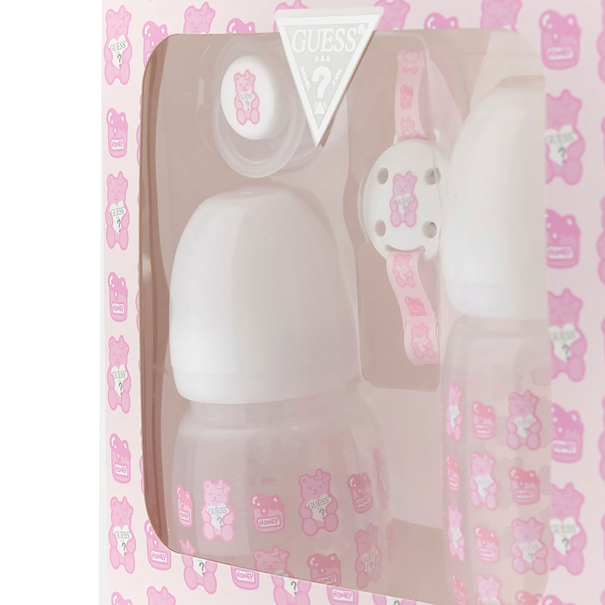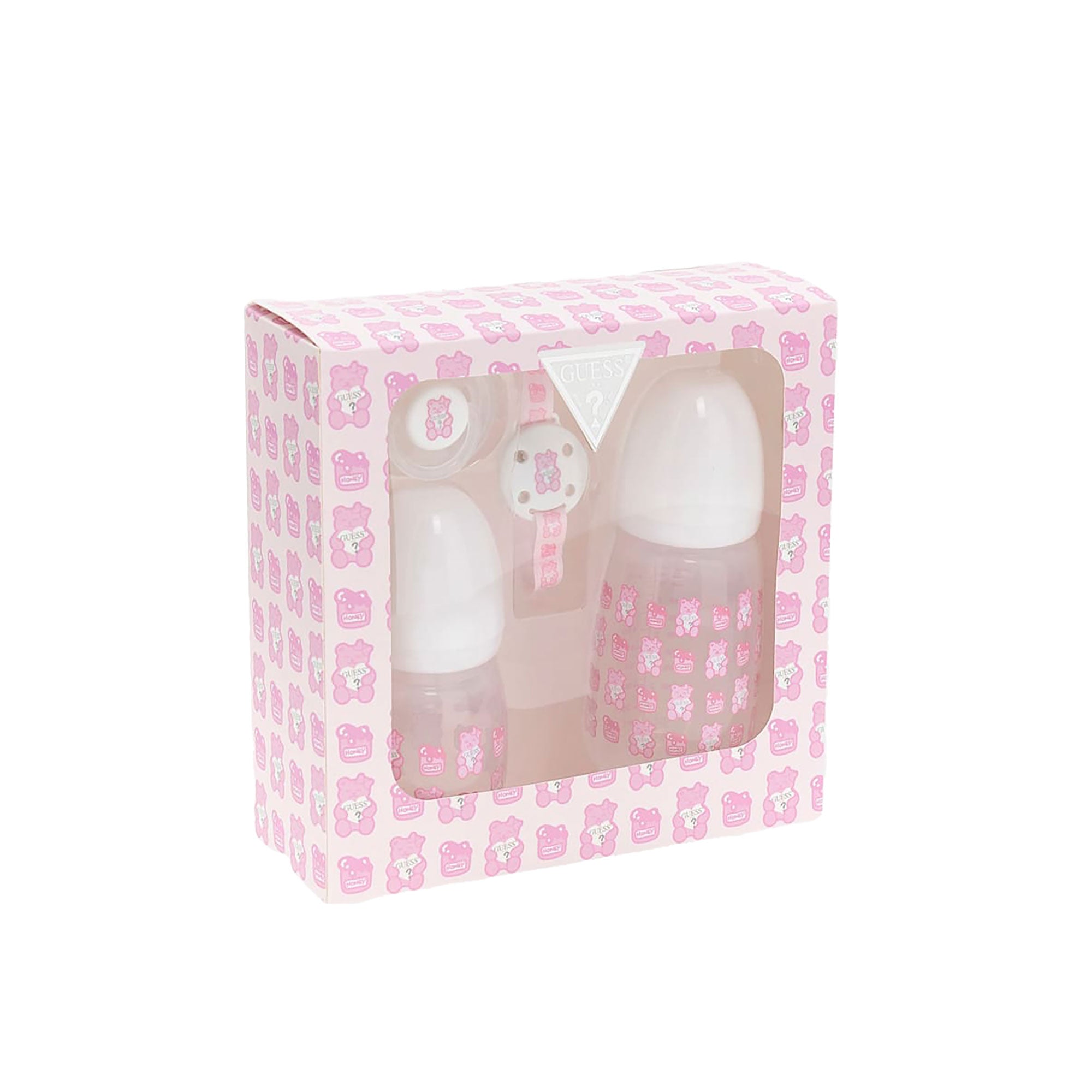 Set da quattro pezzi Guess per la tua piccola , composto dal necessario : 2 biberon, un ciuccetto e una baby clip per la massima comodità.