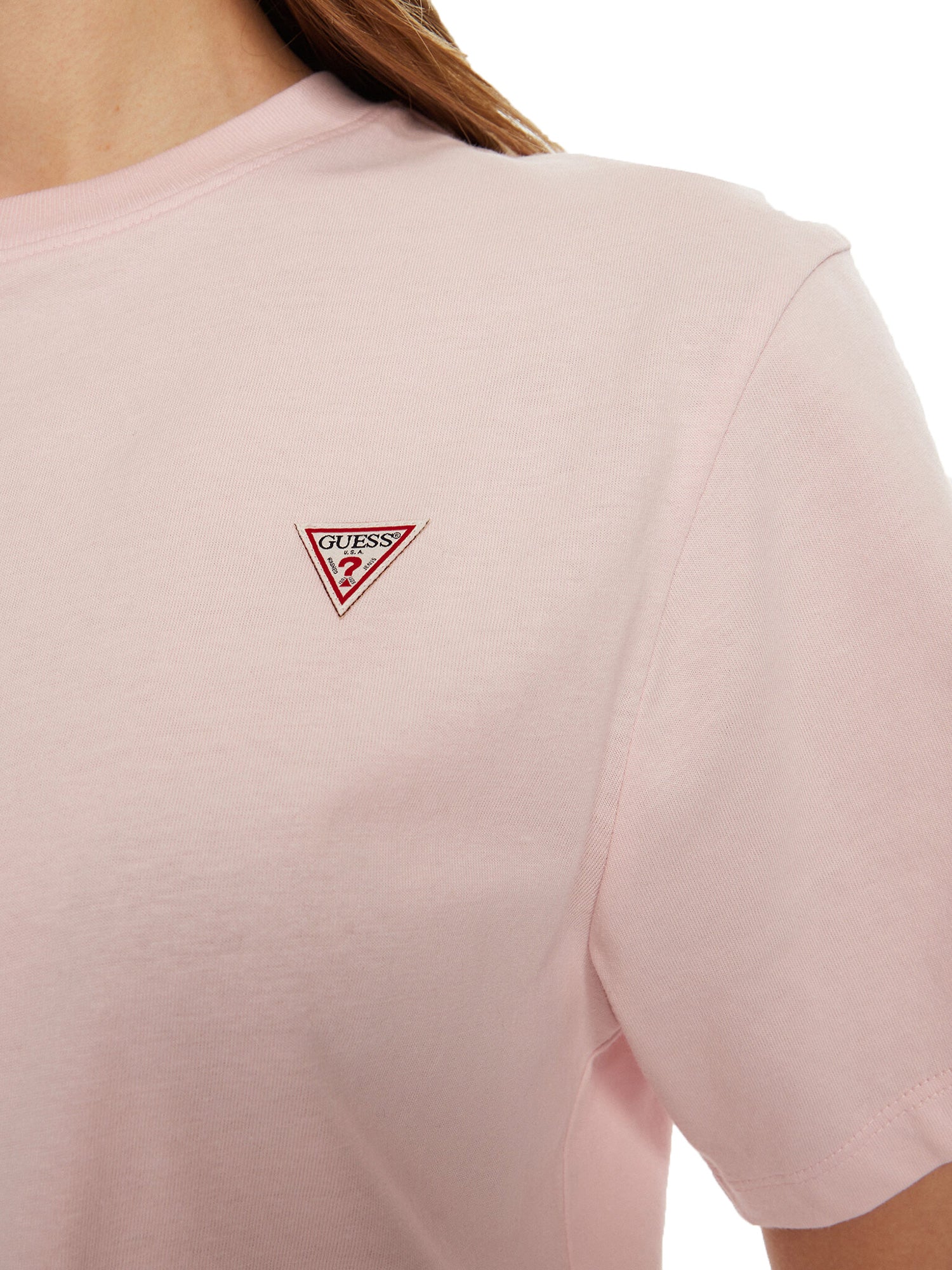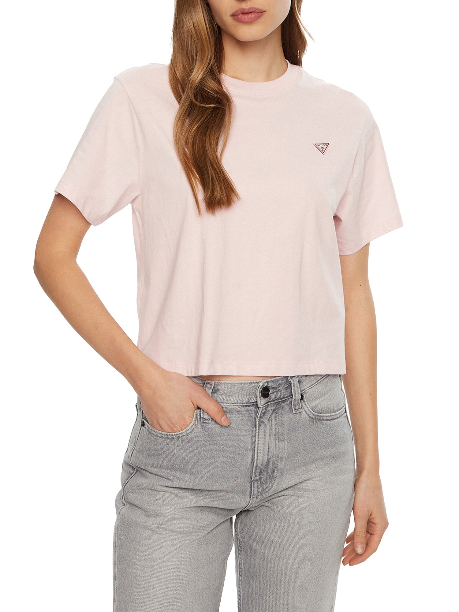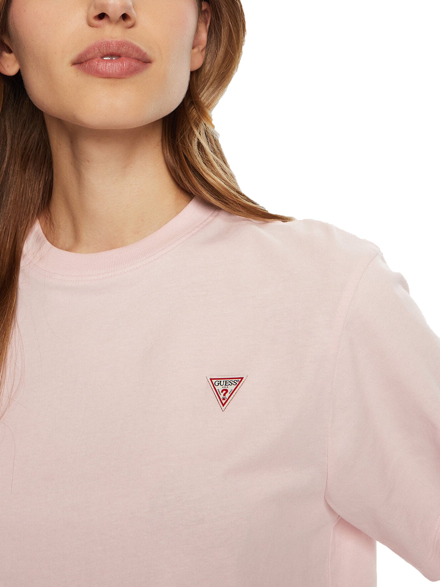 T-shirt manica corta Guess Jeans donna. Modello basic in cotone organico, questo capo presenta l’iconico logo triangolo rosso in formato mini sul petto.