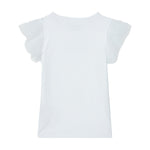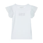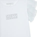 Aggiungi un tocco di eleganza e freschezza al guardaroba della tua bambina con questa t-shirt Guess, realizzata in cotone organico. La maglia è caratterizzata da un'elegante scritta "GUESS" in strass, che cattura la luce con il suo brillante effetto. Le maniche a volant in tulle aggiungono un tocco di femminilità e leggerezza, perfette per le occasioni speciali o per un look casual-chic. Questa t-shirt è la scelta ideale per le giornate più calde, offrendo sia comfort che stile.