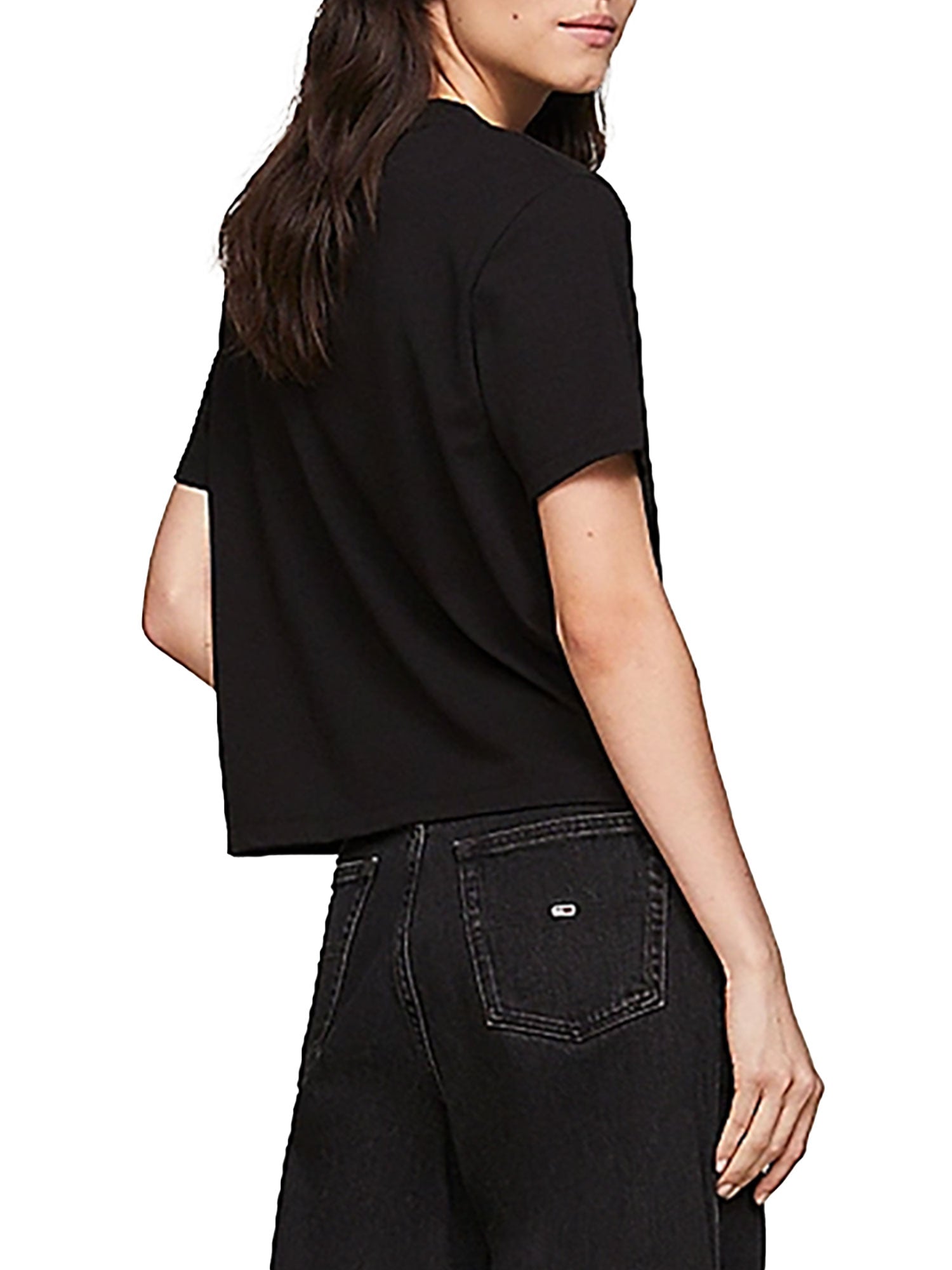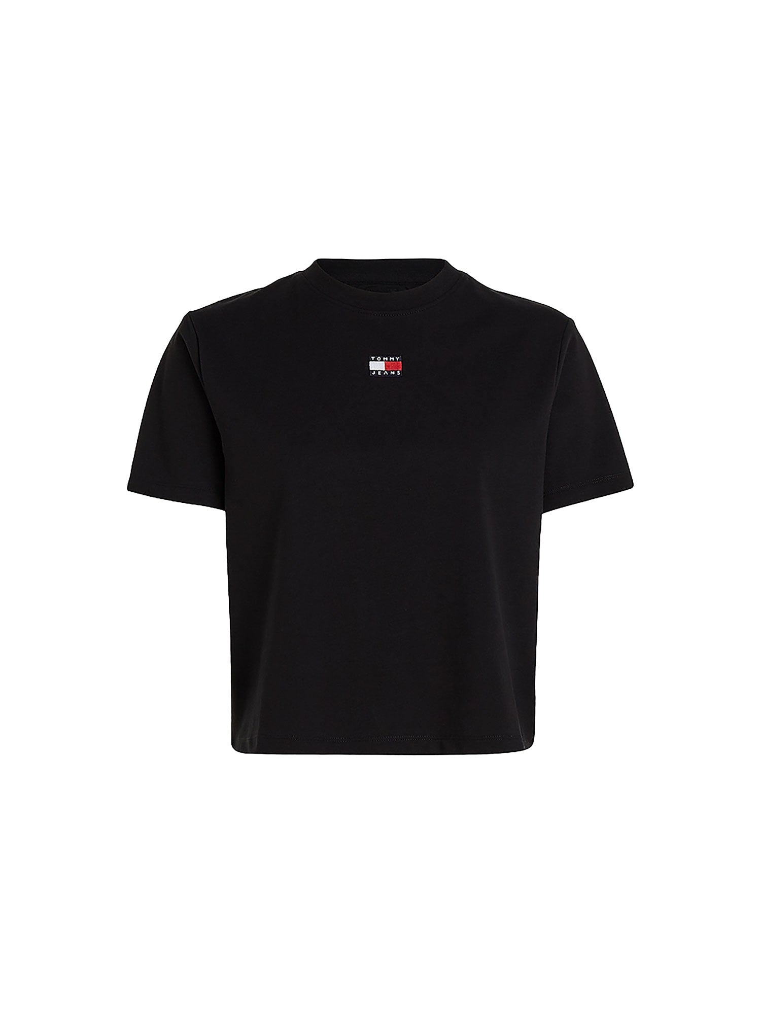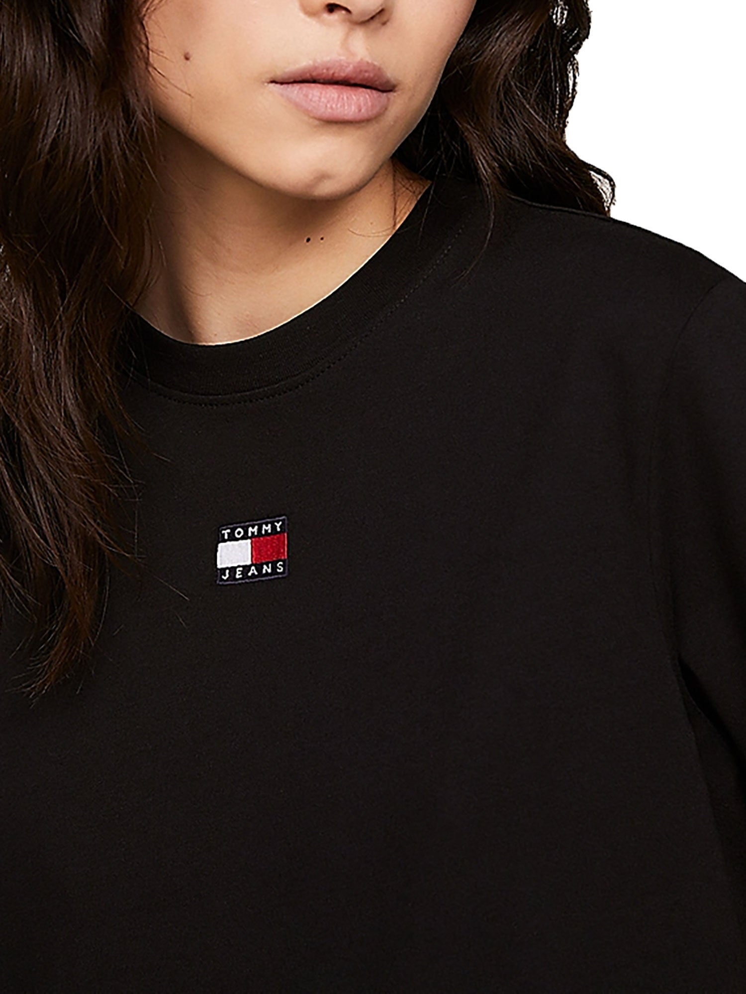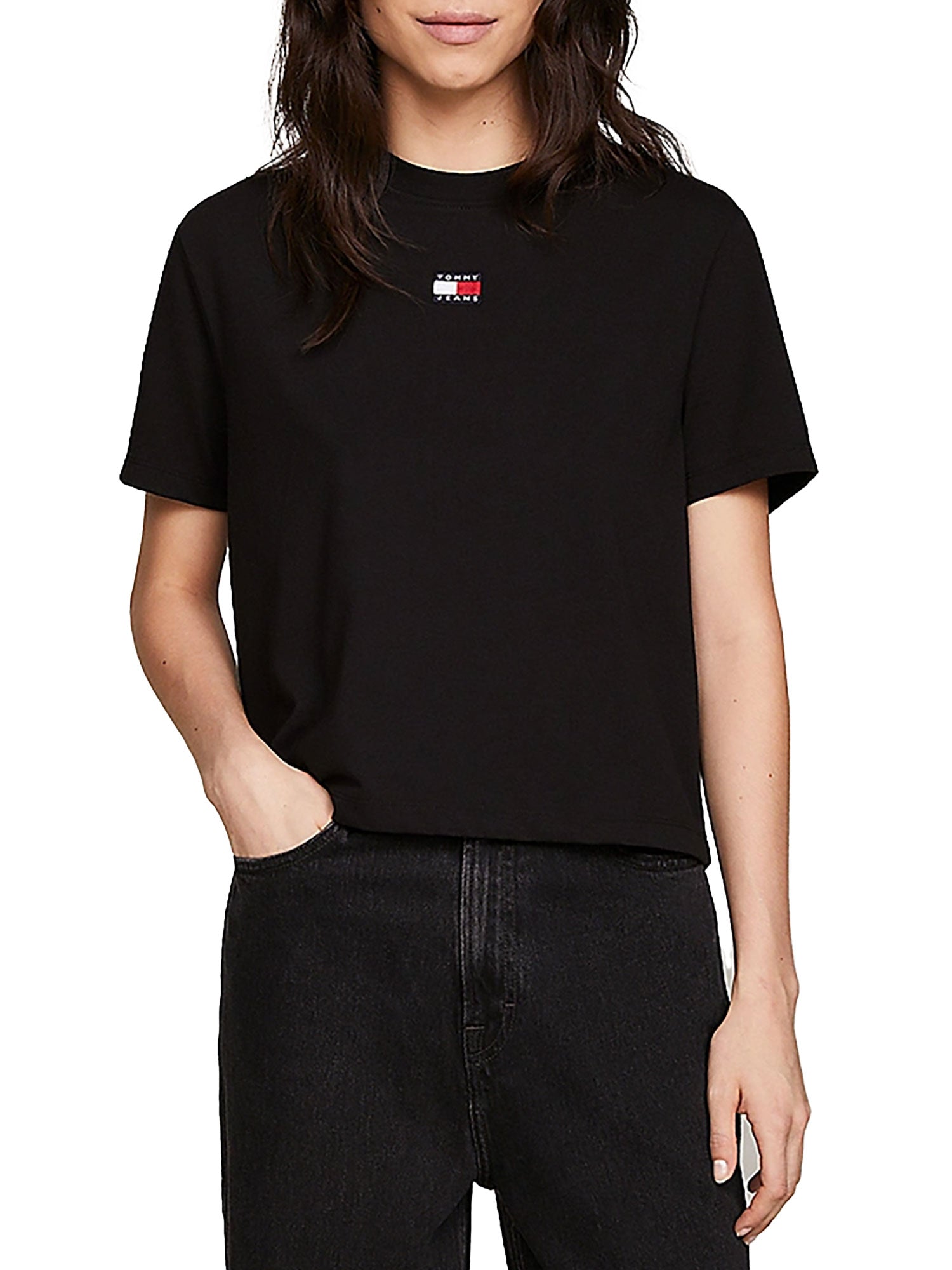 T-shirt nera Tommy Jeans squadrata con distintivo. Un capo intramontabile, utile per ogni occasione, impreziosita dall'intramontabile distintivo Tommy sul petto.