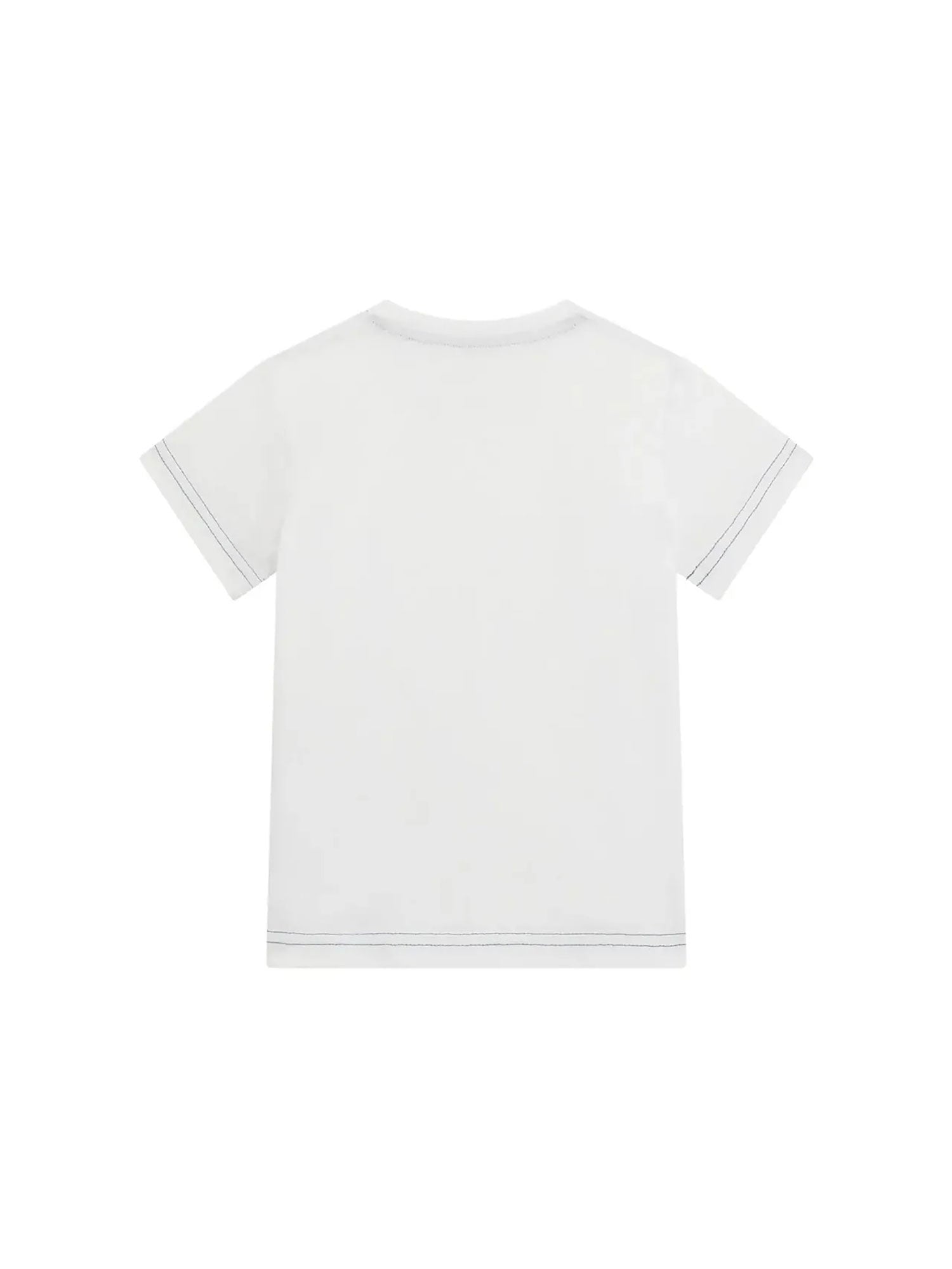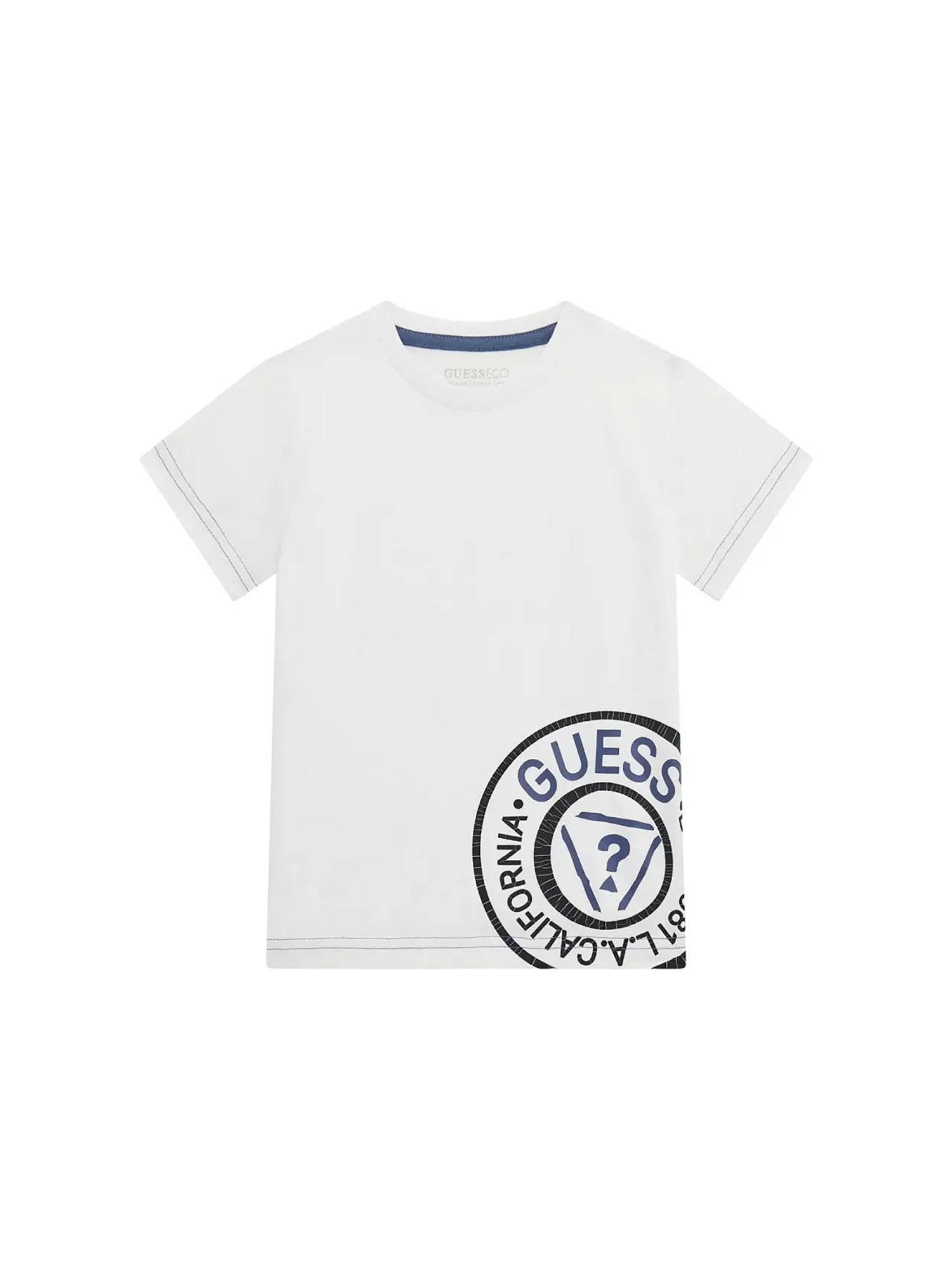 Questa t-shirt per bambino è un must-have versatile e di qualità, perfetta per ogni occasione casual. Realizzata in morbido cotone organico, garantisce comfort e traspirabilità per tutta la giornata. Il design minimalista è impreziosito da una grande stampa circolare del logo Guess, posizionata strategicamente sul lato inferiore sinistro, che aggiunge un tocco di stile e personalità discreta.