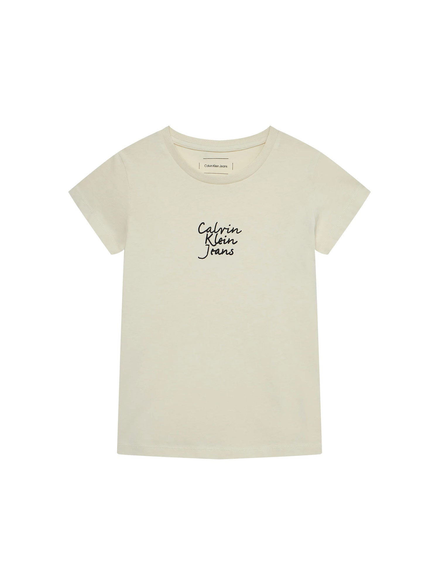 T-shirt Calvin Klein Jeans per bambina dal design semplice ma stiloso. Realizzata in morbido cotone, offre un comfort eccezionale, perfetto per l'uso quotidiano. Il logo "Calvin Klein Jeans" è stampato in un elegante stile calligrafico bianco sul davanti, dando un tocco di classe al capo.