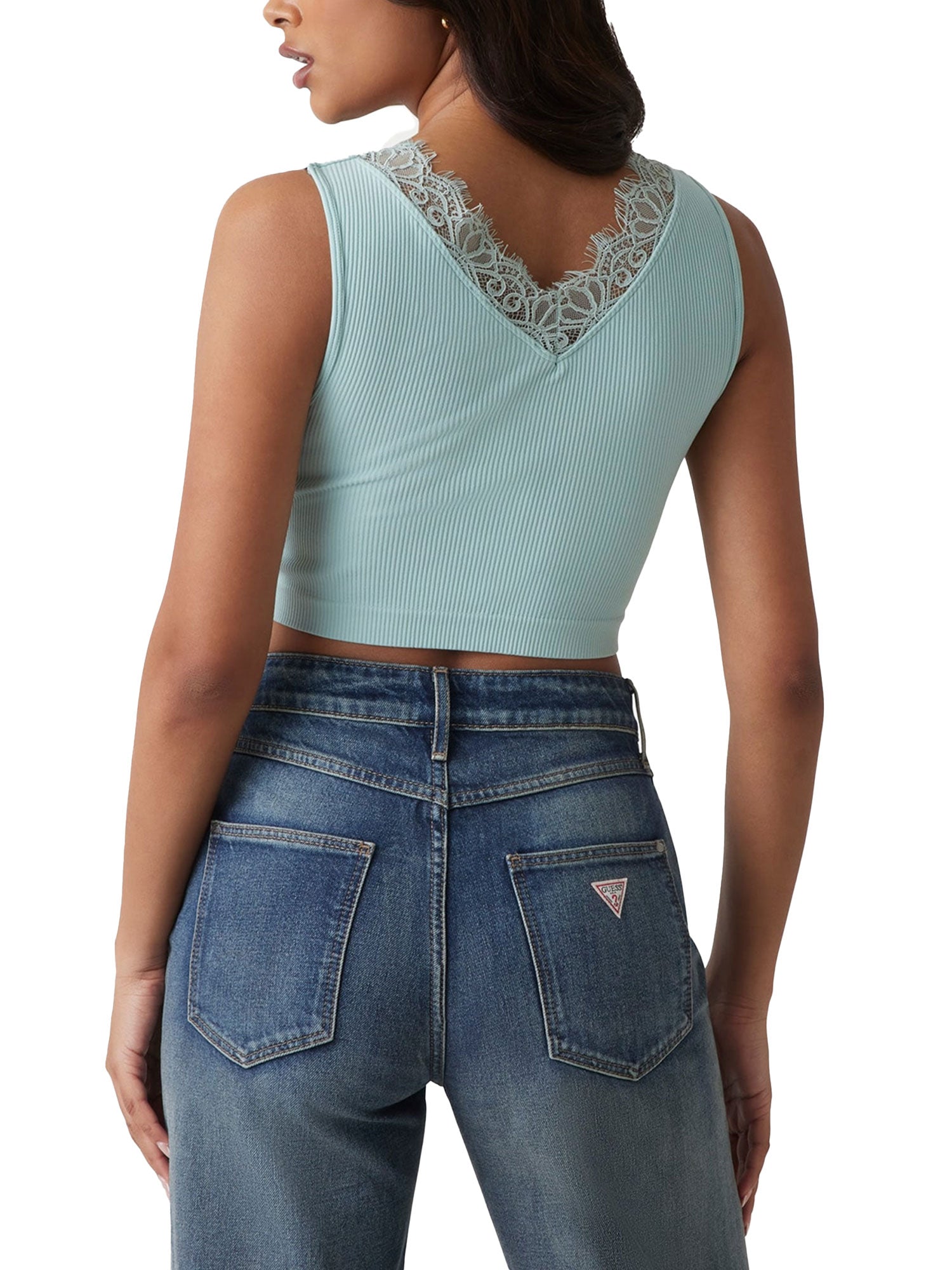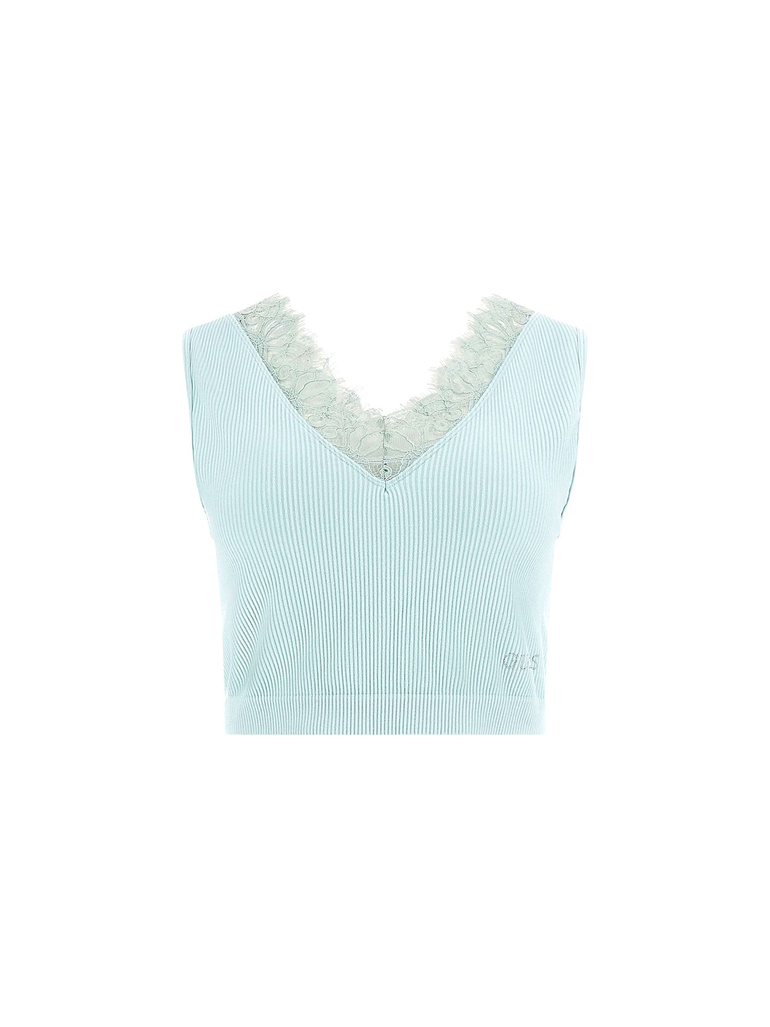 Top Guess dal taglio crop con scollatura a V. Il top presenta una lavorazione a costine dal materiale elasticizzato. Idelae da idossare conjeans o come sottogiacca.