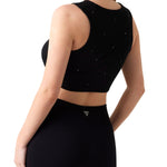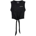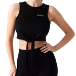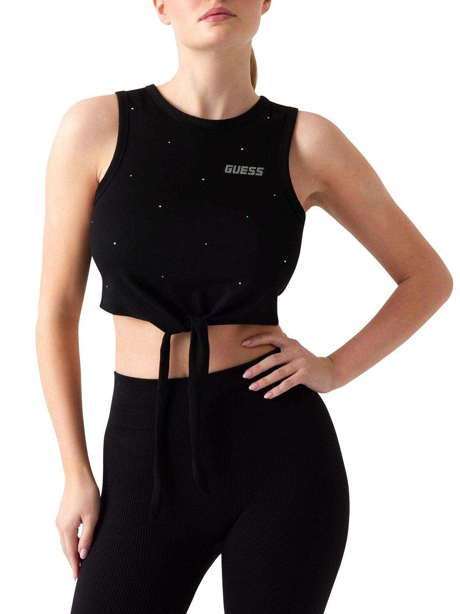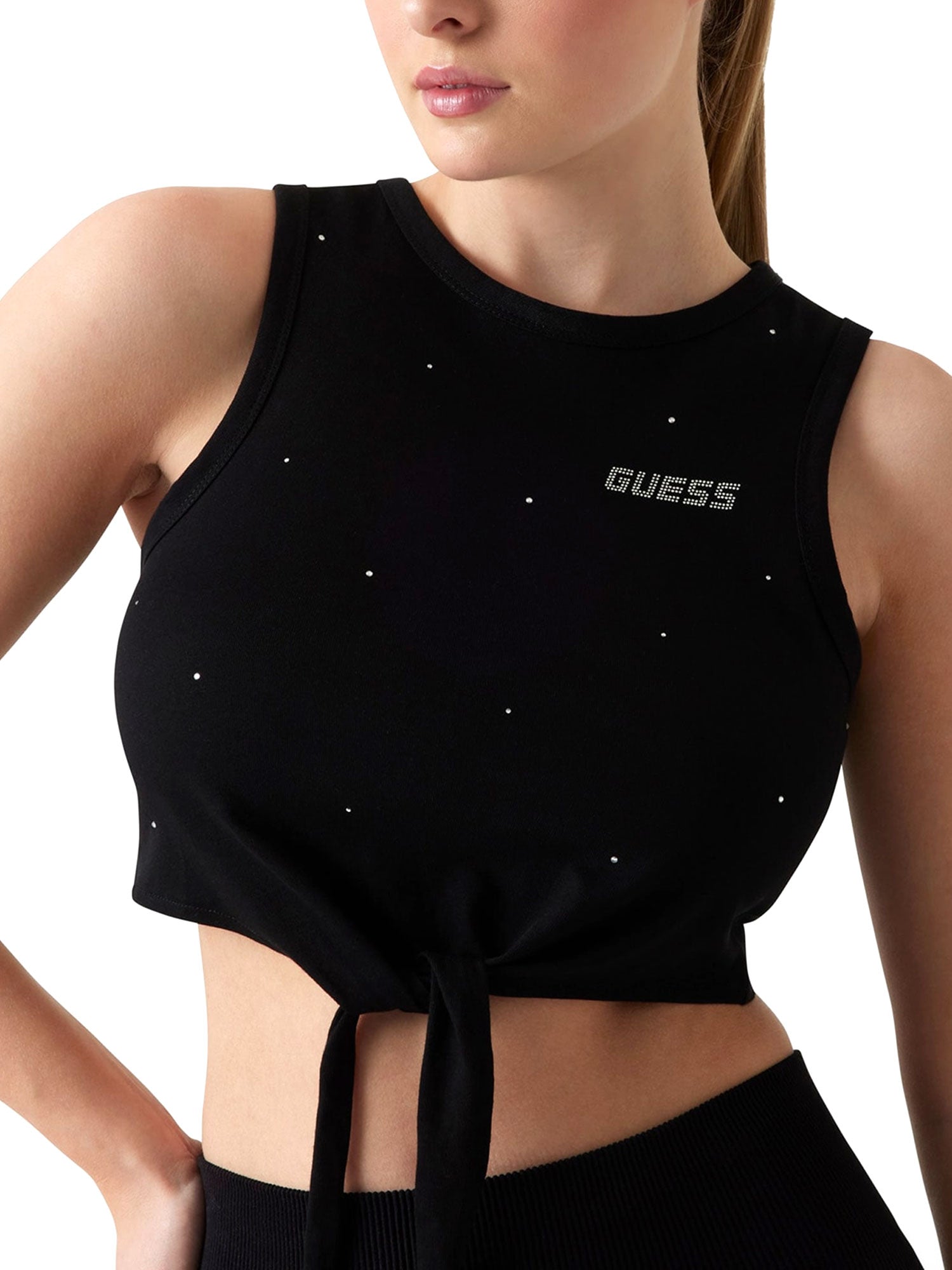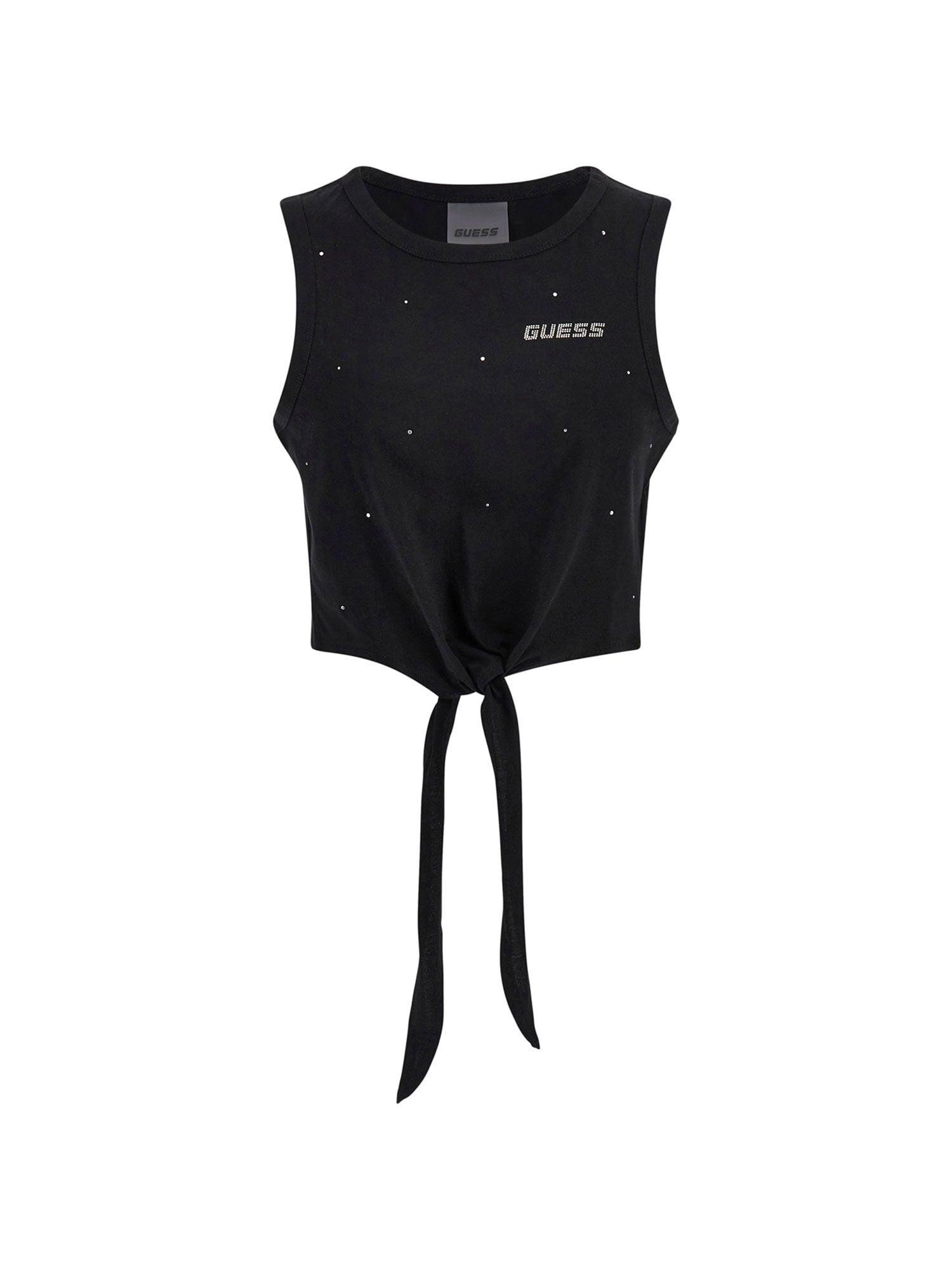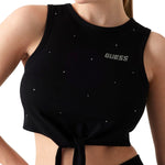Top senza maniche di Guess. Questa maglietta è decorata con sottili strass su tutta la superficie e presenta un logo con strass. Presenta un nodo all'estremità. Il suo tessuto è morbido, di cotone e la vestibilità è comoda.