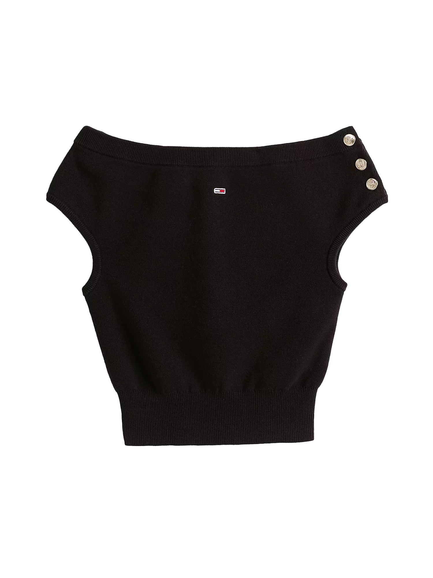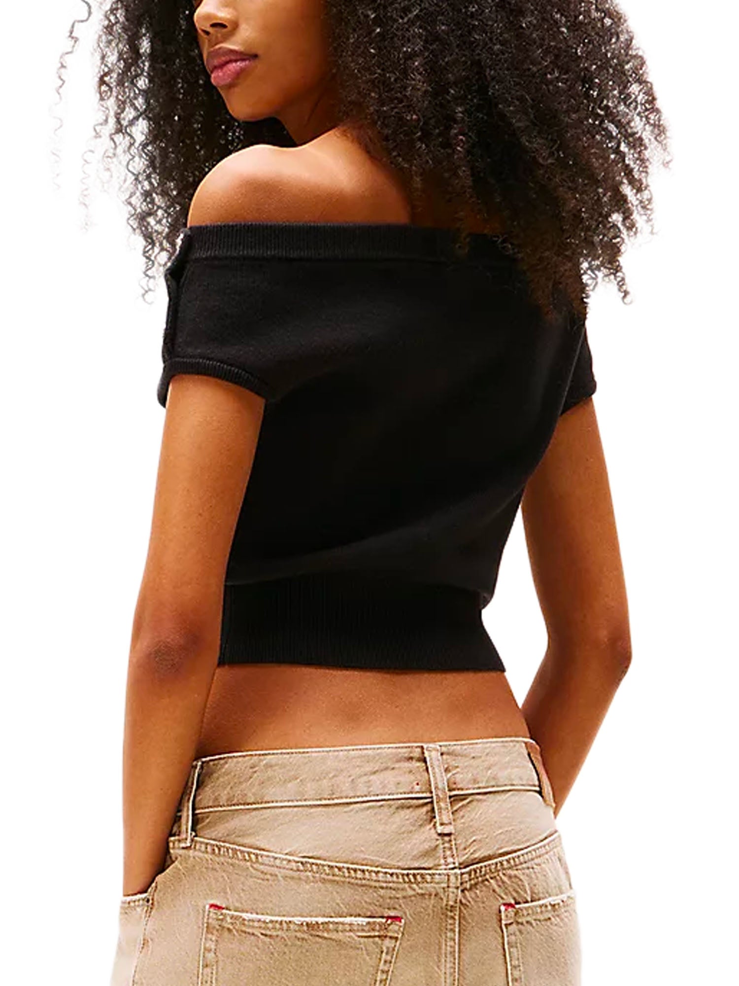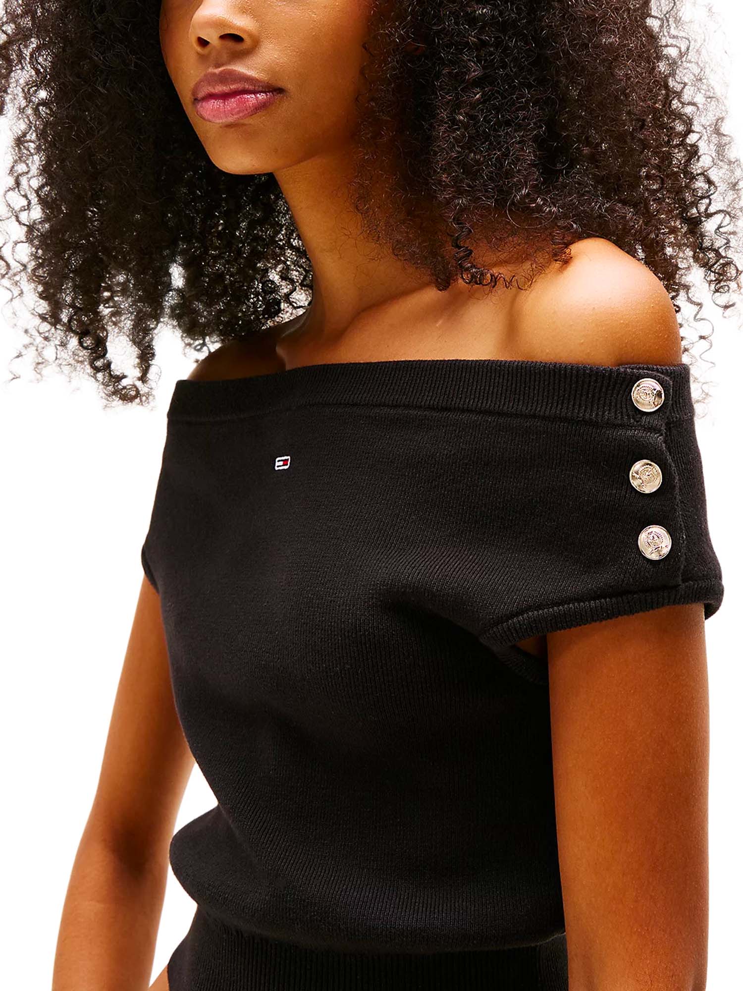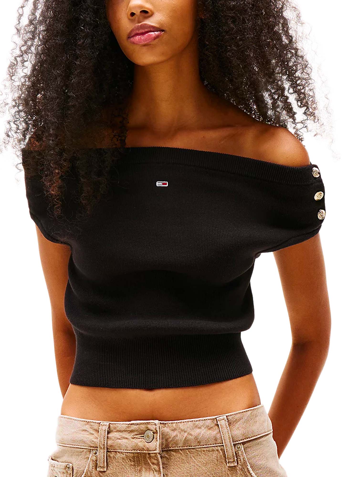 Maglia aderente Tommy Jeans, dall'originale taglio con spalle scoperte. Il capo arricchito dai bottoni dorati con logo in rilievo, esprime alla perfezione lo stile femminile.