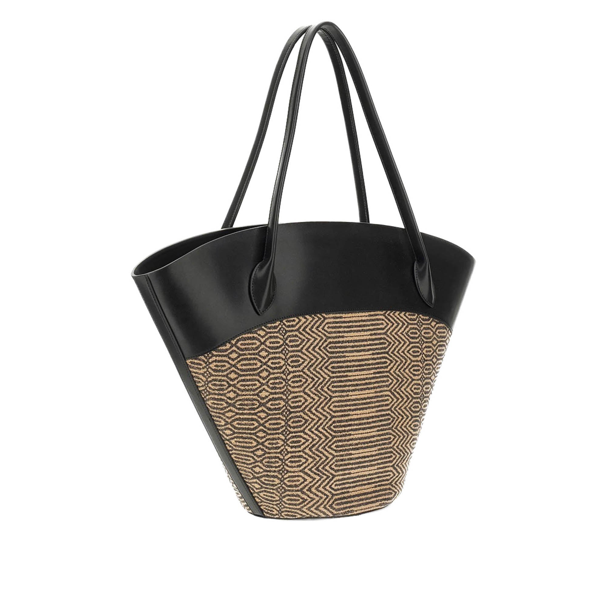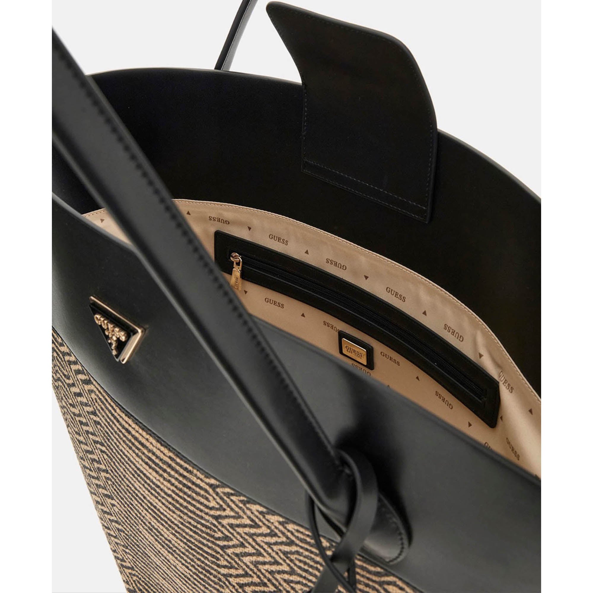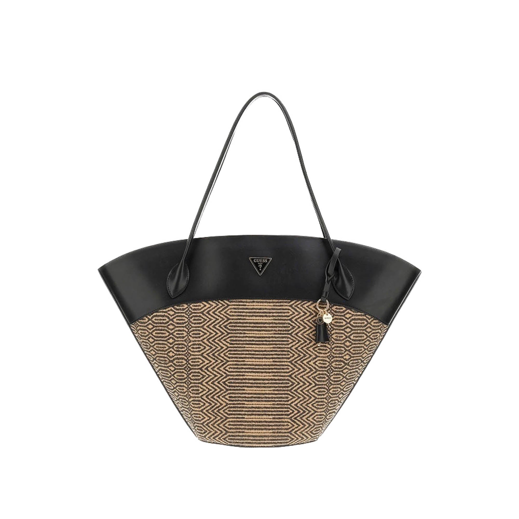 Borsa Guess donna in tessuto intrecciato con dettagli in similpelle nera. Il design a trapezio e i doppi manici la rendono moderna e capiente, ideale per l’uso quotidiano. L’interno è spazioso e organizzato, mentre il charm logato aggiunge un tocco elegante.