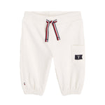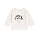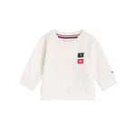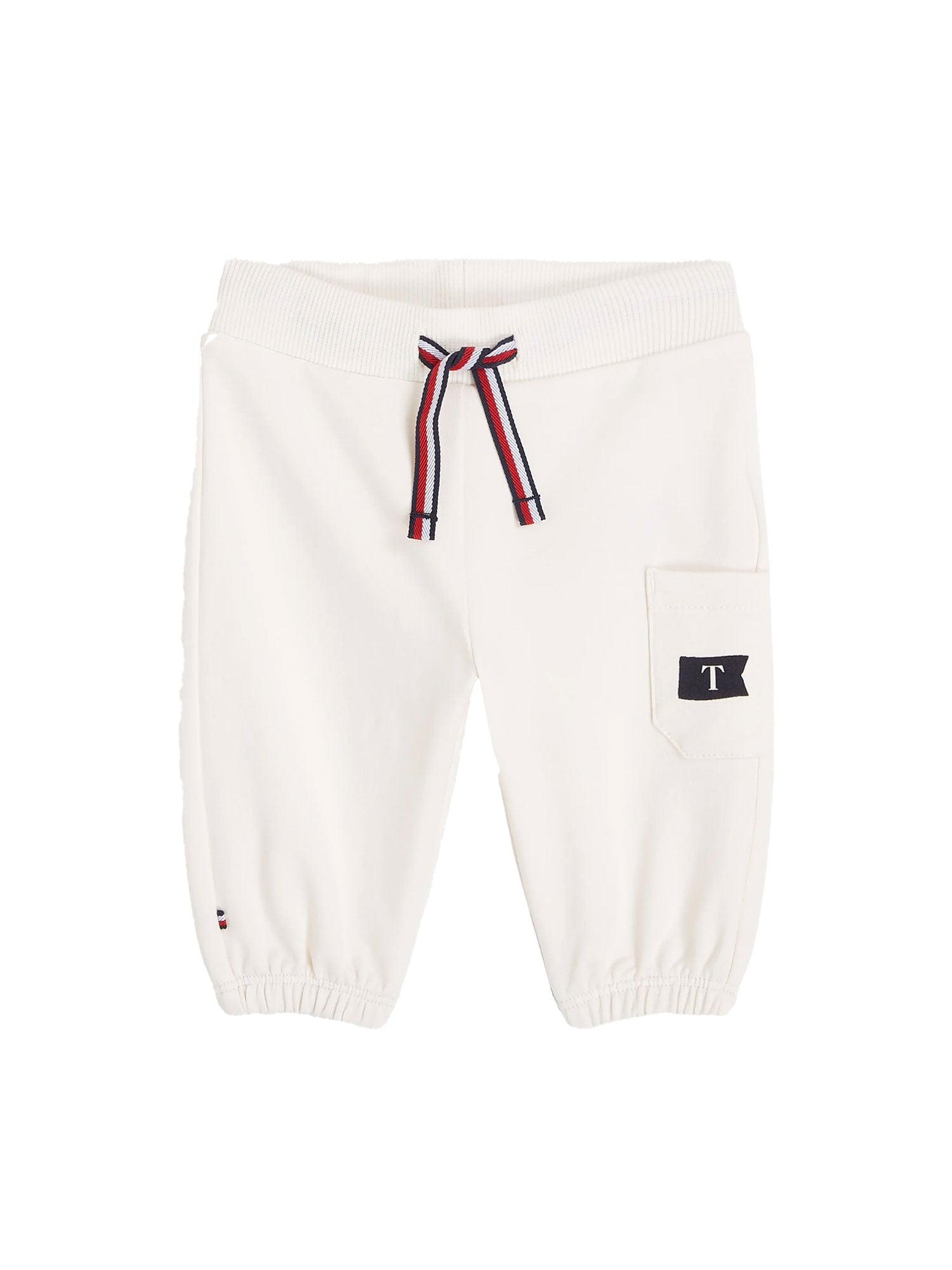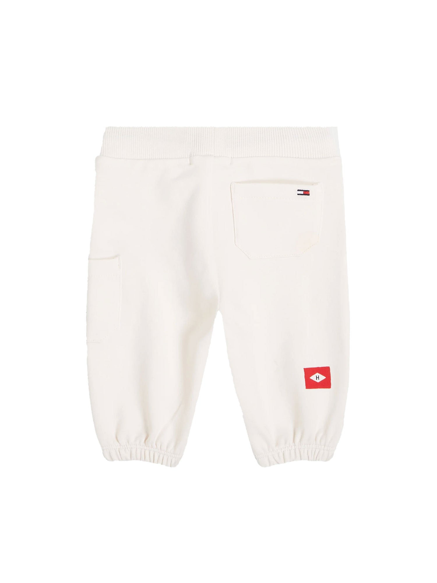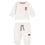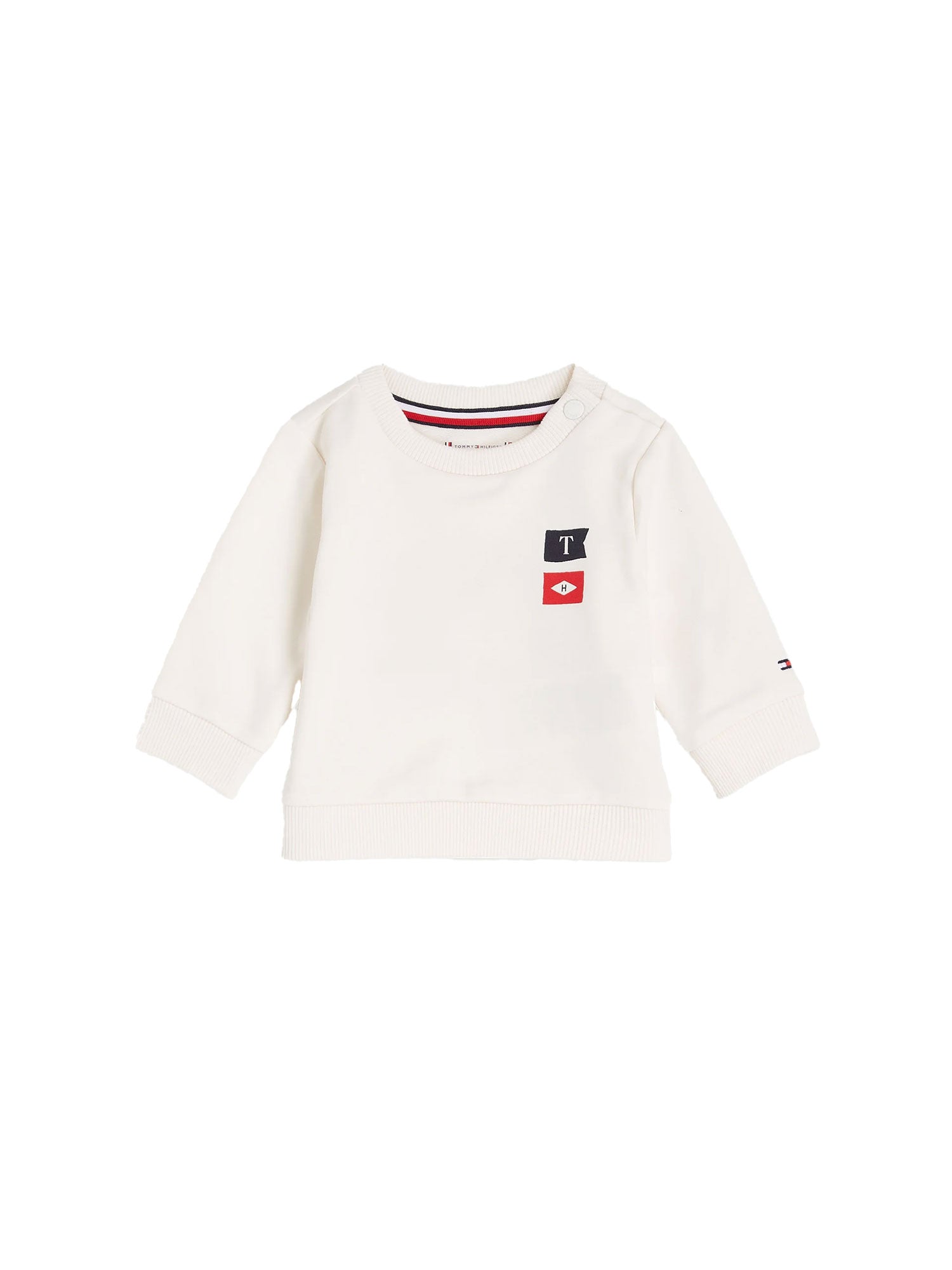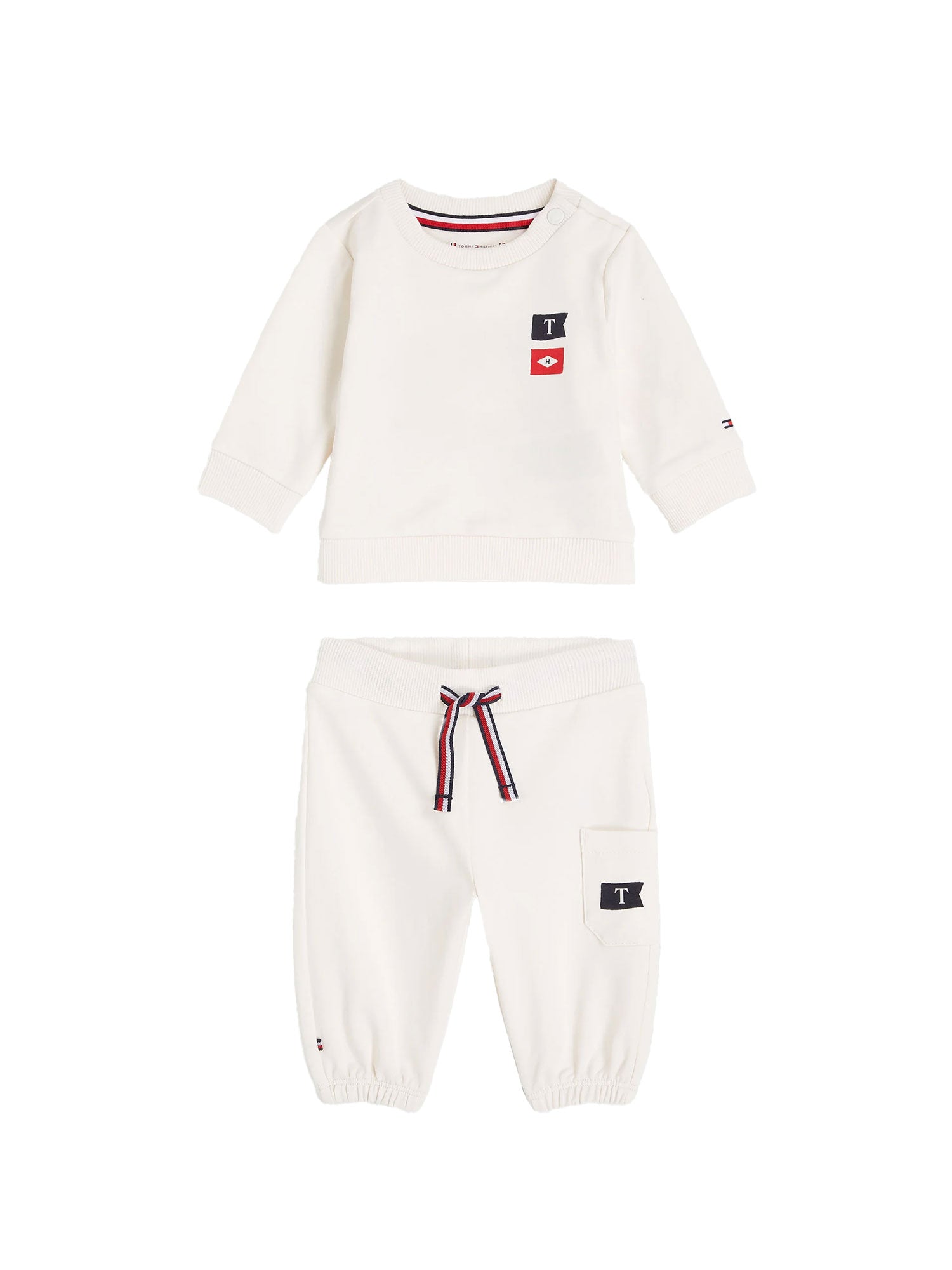Tuta da neonato Tommy Hilfiger composta da felpa e pantalone, entrambi realizzati in morbido tessuto di cotone biancio. La felpa presenta un design a girocollo con maniche lunghe e un'apertura a bottoni sulla spalla per facilitare la vestizione. Sul davanti e sul retro è decorata con una stampa di Tommy Hilfiger con bandierine ispirate allo stile nautical. I pantaloni abbinati hanno un elastico in vita regolabile con lacci bicolore, tasche laterali e una tasca posteriore con piccolo logo Tommy Hilfiger.