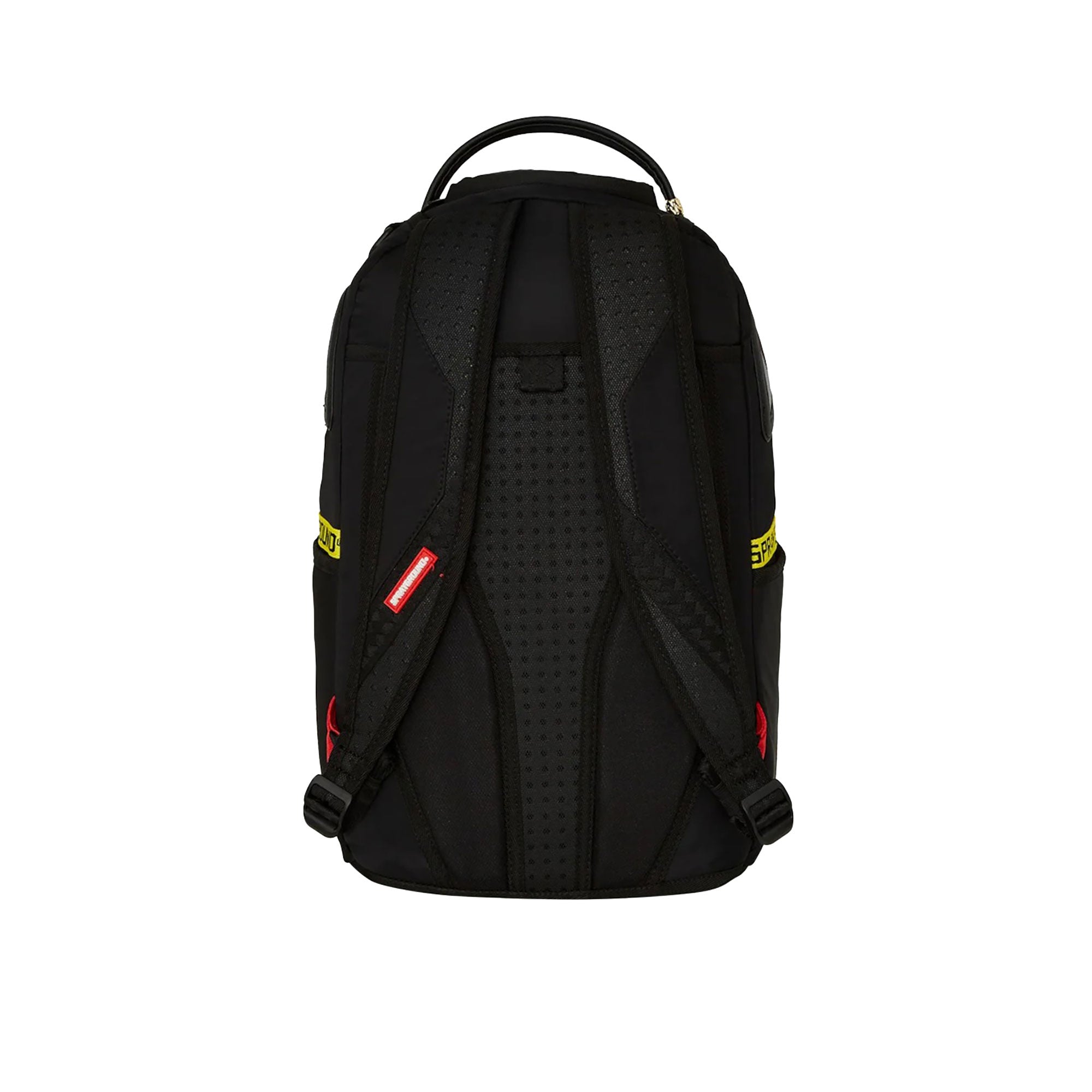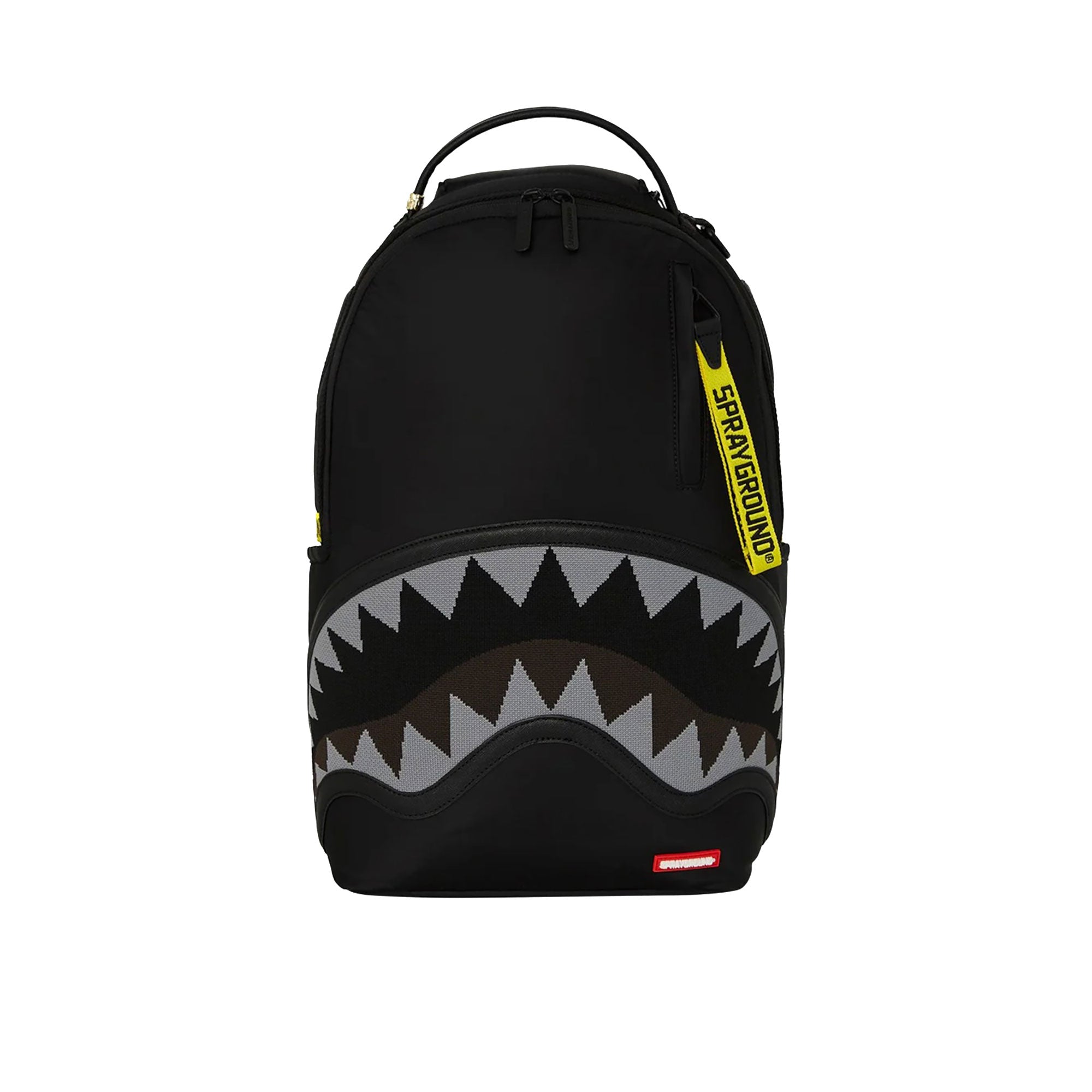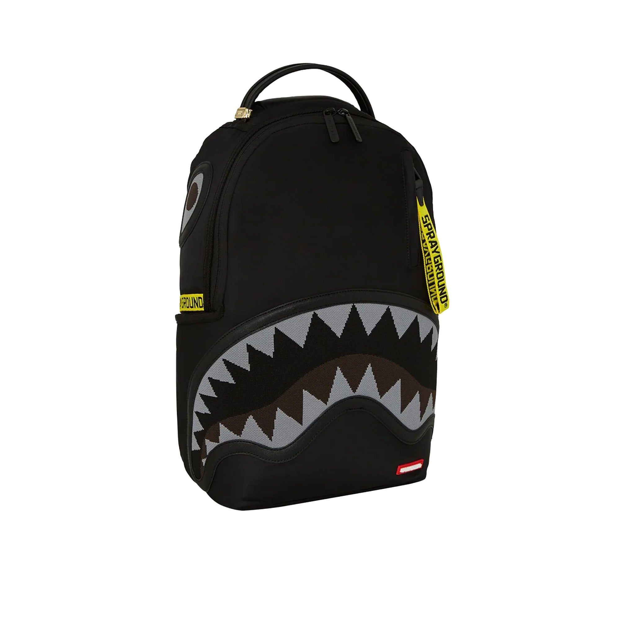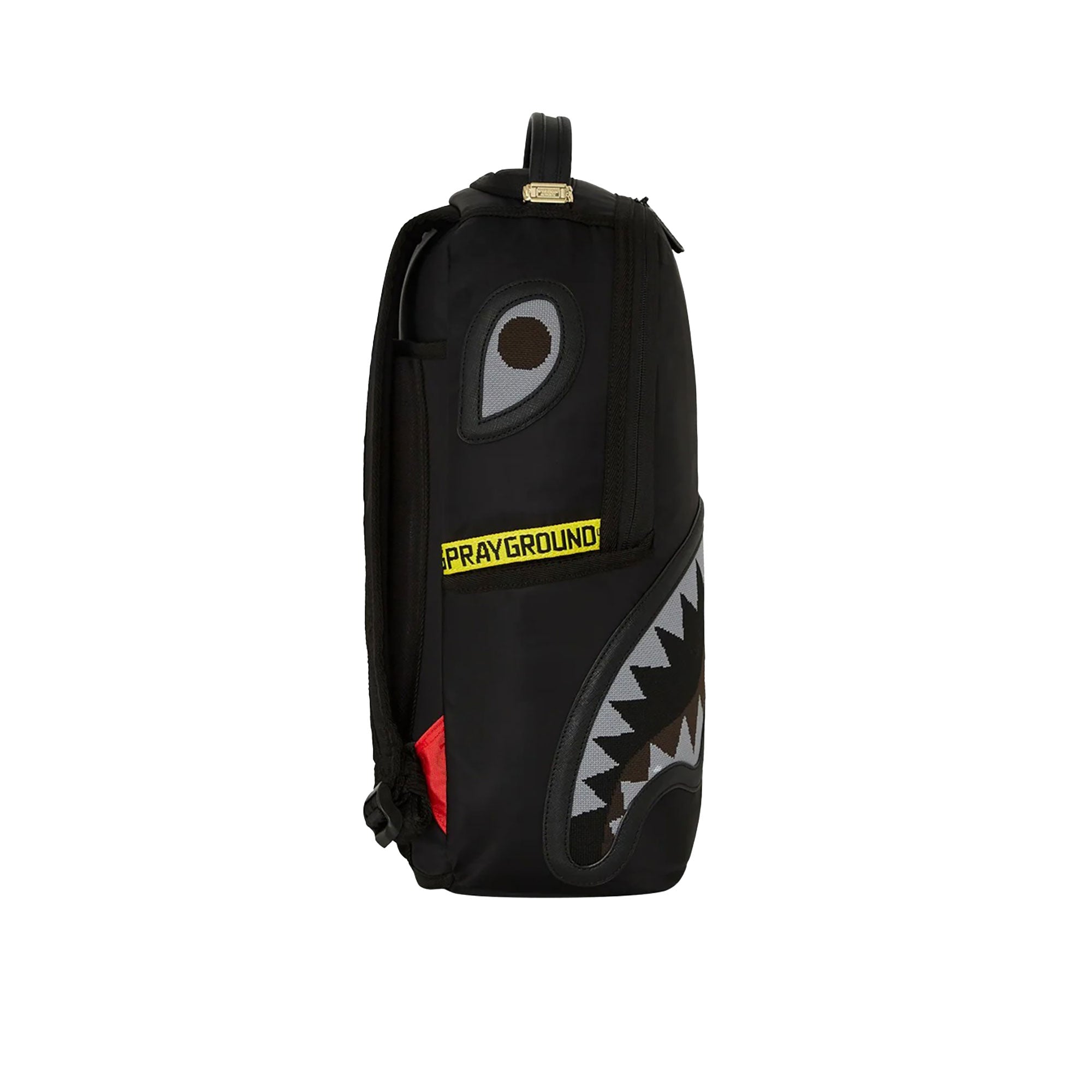 - Dettagli iconici Sprayground: stampa squalo pixelata, patch logo laterali, linguetta gialla