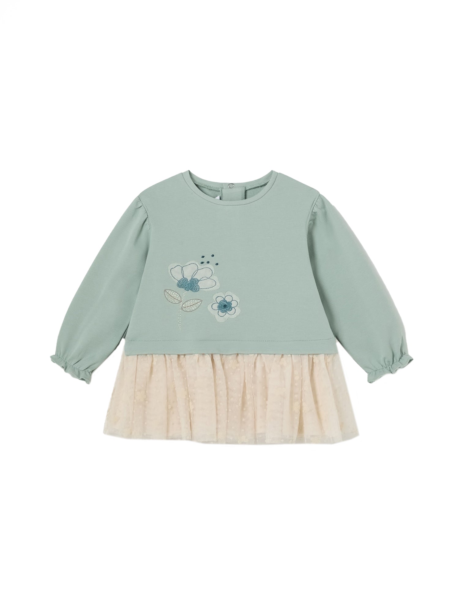 Delizioso abito da neonata Mayoral presenta una tonalità verde menta nella parte superiore, arricchita da un grazioso ricamo floreale che aggiunge un tocco di eleganza e delicatezza. La parte inferiore è composta da una gonna in tulle color panna, decorata con piccoli pois in rilievo, creando un effetto etereo e raffinato. Le maniche lunghe con polsini leggermente arricciati e l'apertura posteriore facilitano la vestizione, rendendolo un capo ideale per occasioni speciali o per una giornata chic.