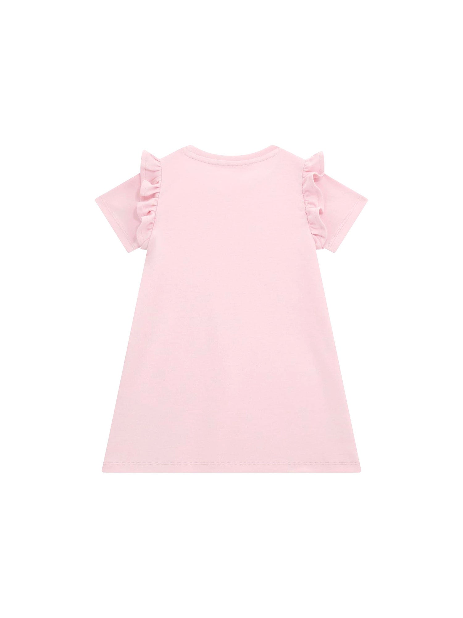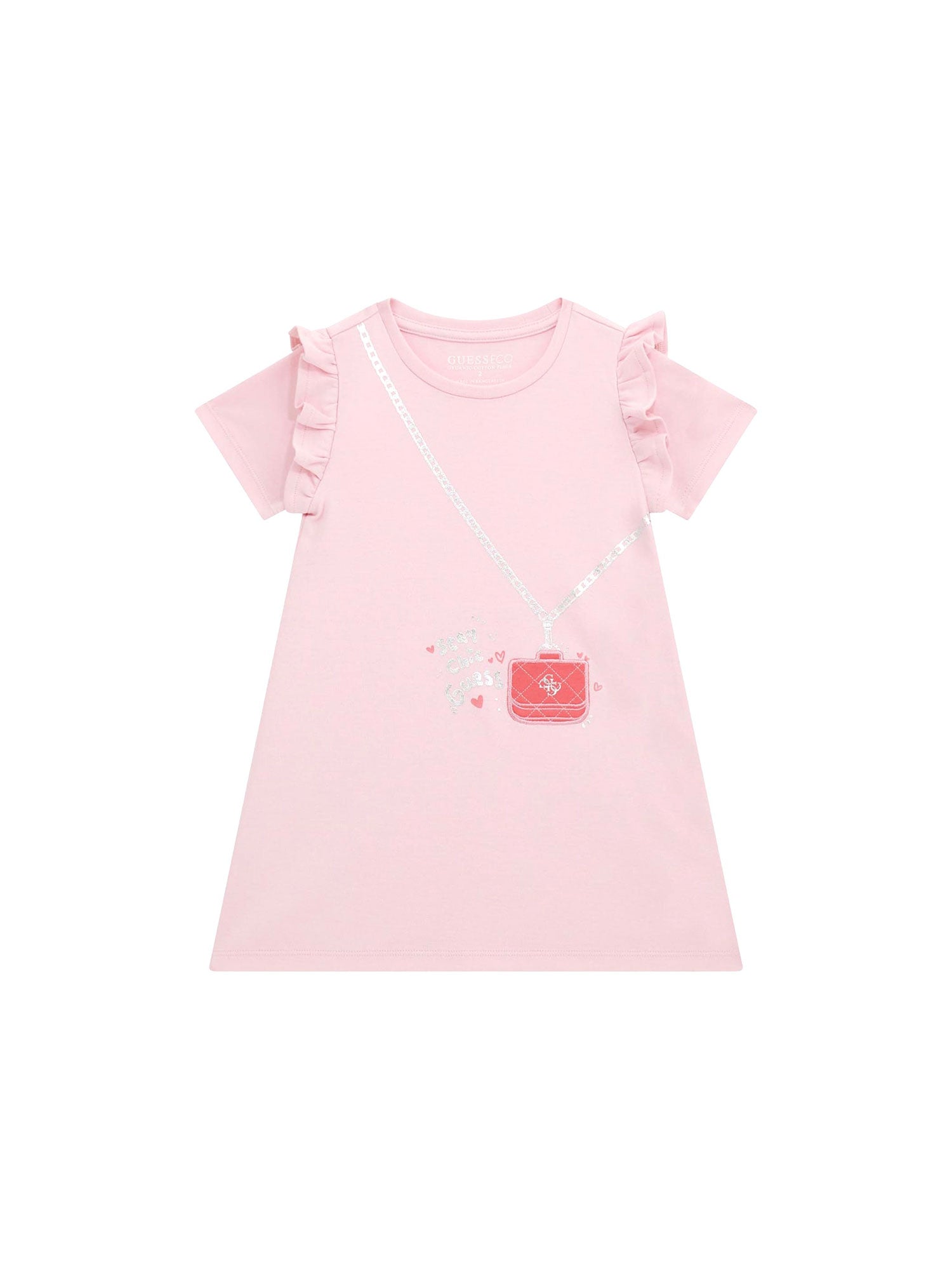 Delizioso e divertente, questo vestito firmato Guess è pensato per le bambine che amano giocare con la moda. Il design a trapezio garantisce libertà di movimento, mentre le maniche corte con rouches aggiungono un tocco romantico. La stampa effetto borsa a tracolla con dettagli glitterati rende questo capo unico e perfetto per ogni occasione, da una festa a una passeggiata con stile.