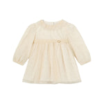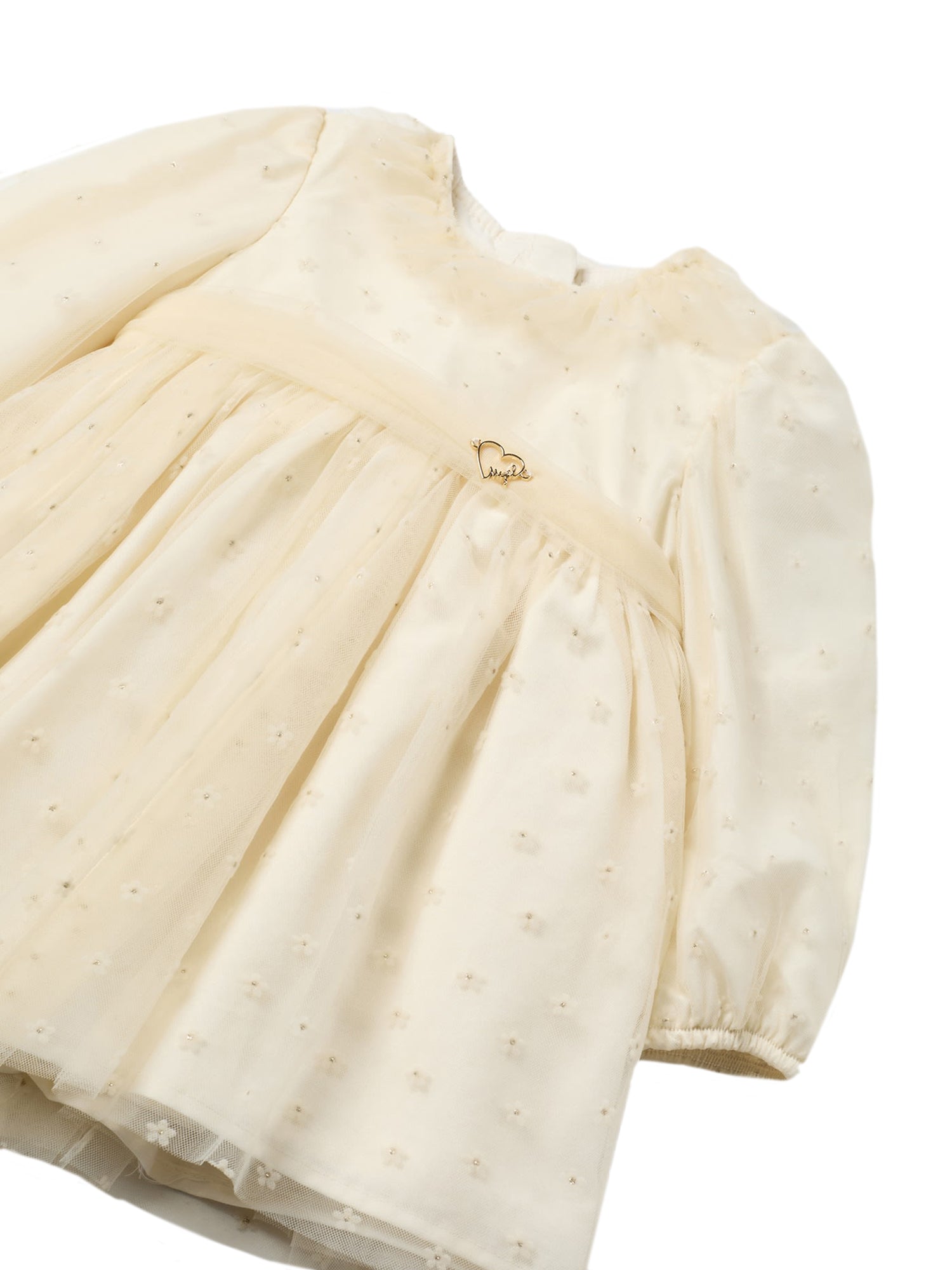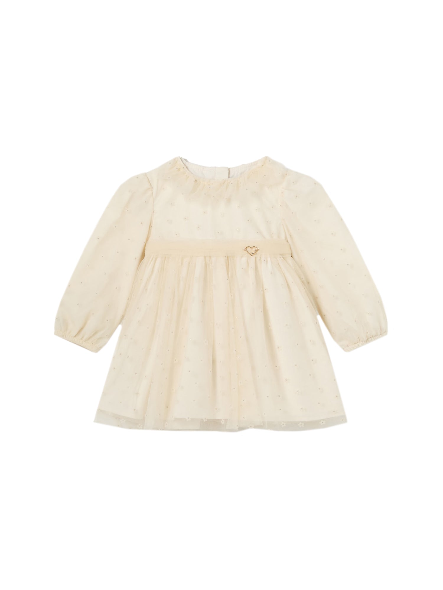 Adorabile vestito per neonata Mayoral realizzato in un delicato tessuto color crema, perfetto per un look elegante e raffinato. La parte superiore del vestito è caratterizzata da un corpetto in tulle leggero, decorato con piccoli motivi floreali in rilievo che aggiungono un tocco di dolcezza e femminilità. Le maniche lunghe e leggermente arricciate ai polsi garantiscono comfort e protezione nelle giornate più fresche. La gonna, anch’essa in tulle, dona volume e movimento, creando un effetto vaporoso e incantevole. Un piccolo dettaglio a forma di cuore dorato sulla vita completa il design, conferendo un ulteriore elemento di charme. Questo capo è ideale per occasioni speciali, aggiungendo una nota di eleganza al guardaroba delle più piccole.