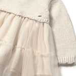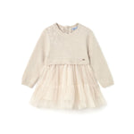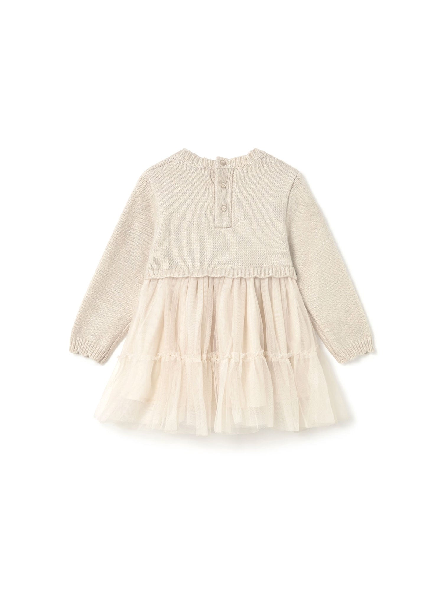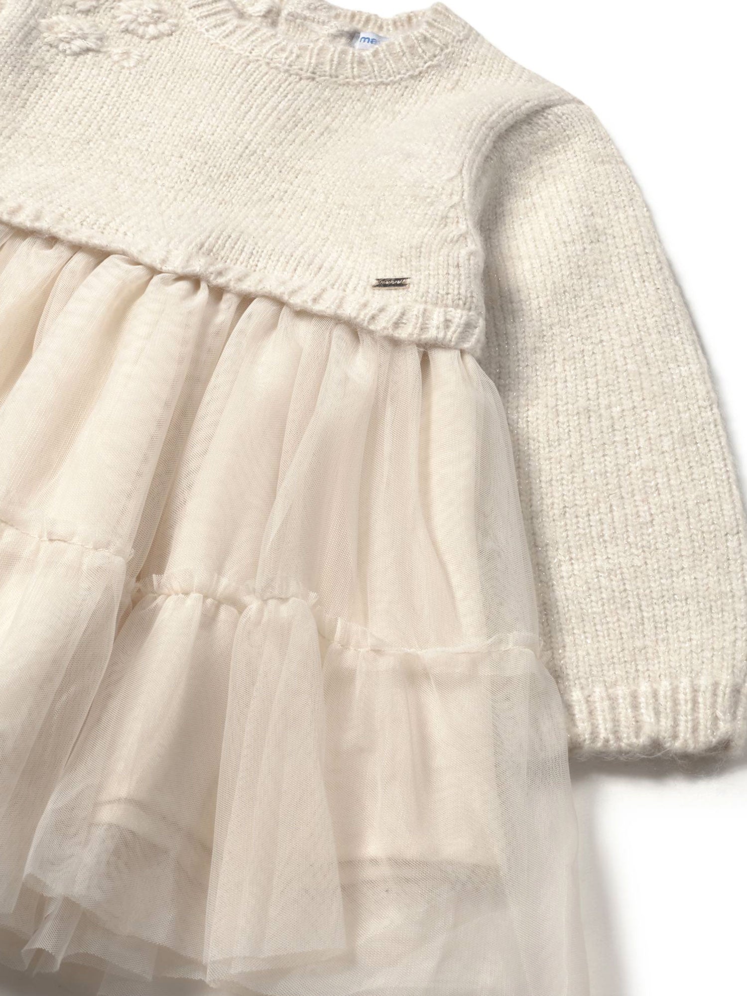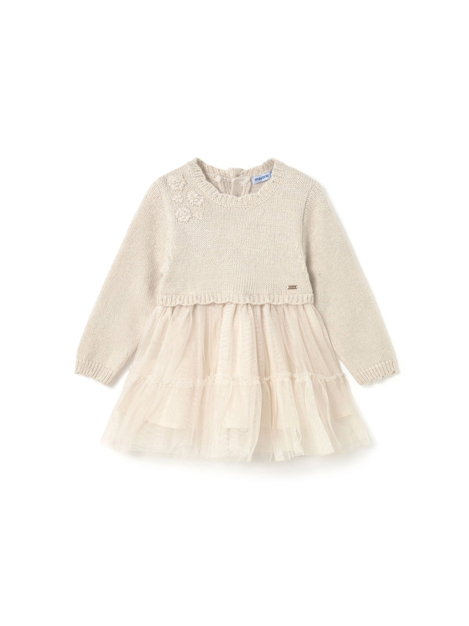 Abito neonata Mayoral newborn con gonna in tulle color panna. Un vestito elegante e romantico, perfetto per le occasioni speciali della tua piccola. Il design unisce il calore della maglia lavorata con la leggerezza del tulle, creando un look sofisticato e confortevole.