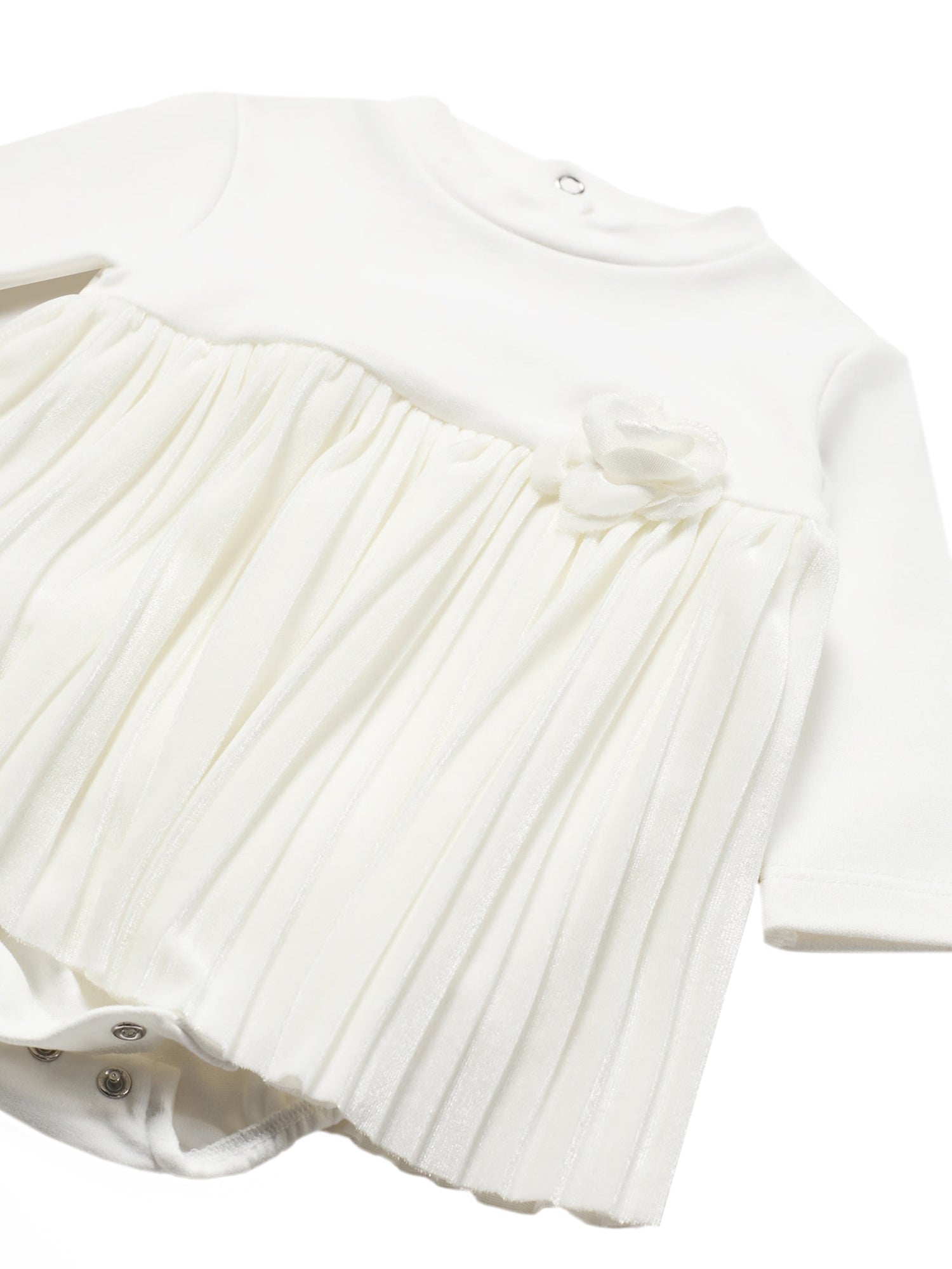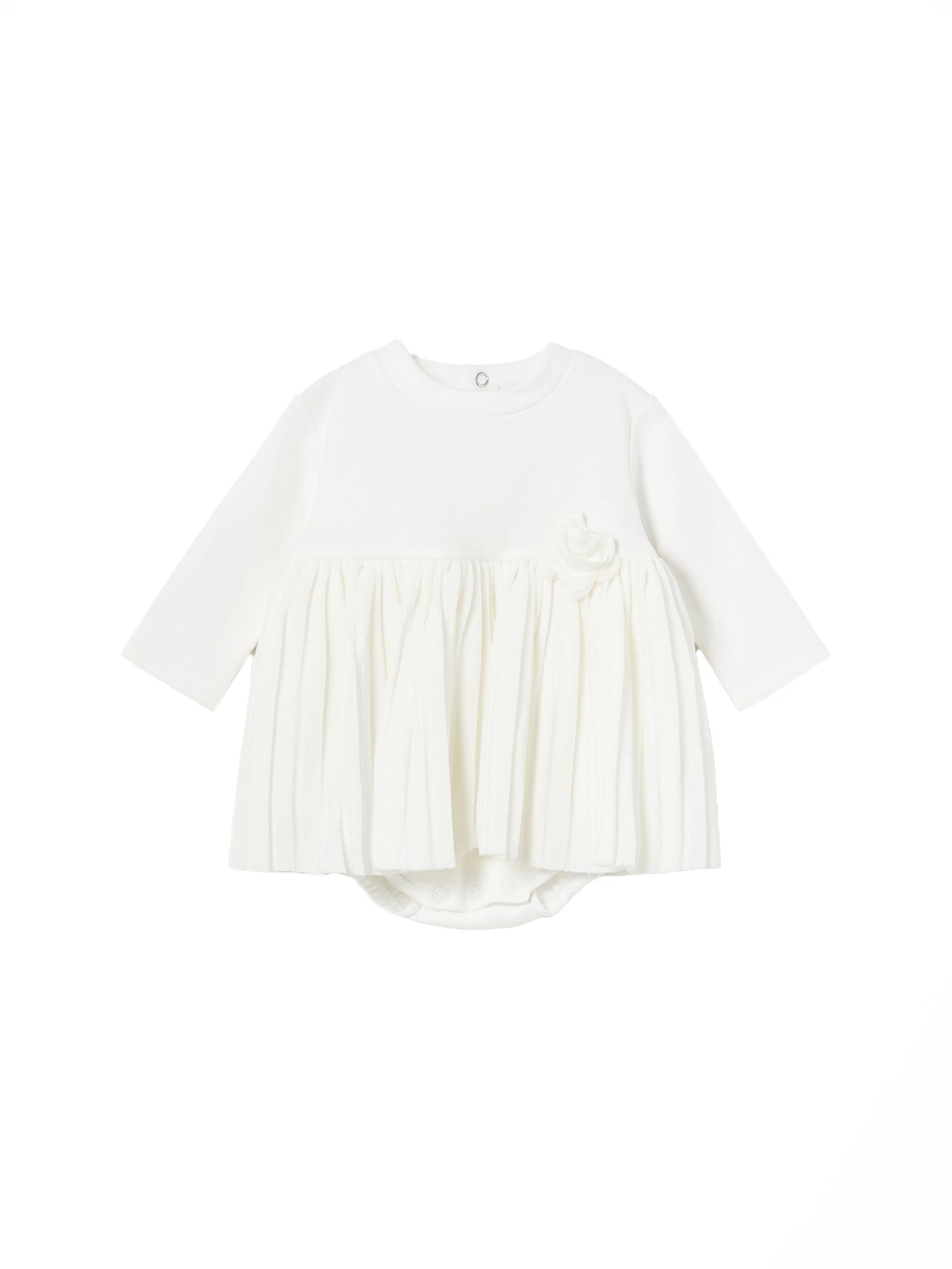 Abito Mayoral per neonata, un capo deliziosamente elegante, caratterizzato da una tonalità panna e dettagli raffinati. La parte superiore è semplice e morbida, mentre la gonna presenta pieghe delicate che creano un effetto lucente e armonioso. Un dettaglio floreale applicato sul petto aggiunge un tocco di dolcezza e femminilità. La chiusura con bottoni a pressione sul cavallo facilita il cambio, rendendo questo outfit ideale per occasioni speciali e per garantire il massimo comfort alla tua piccola.