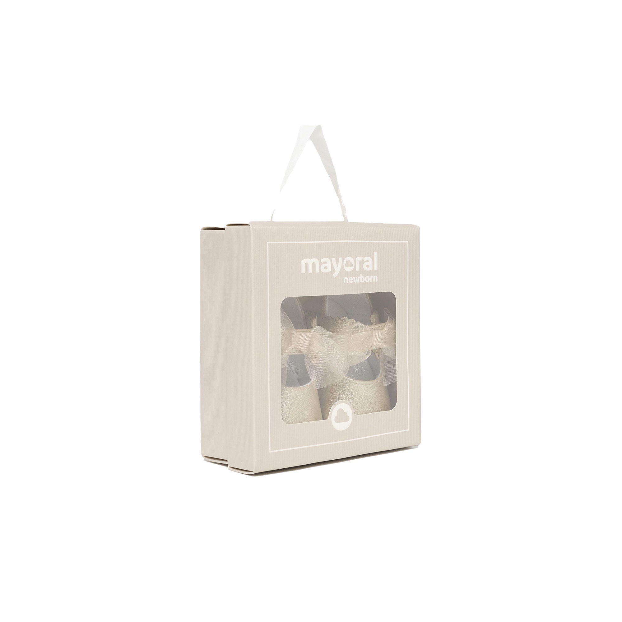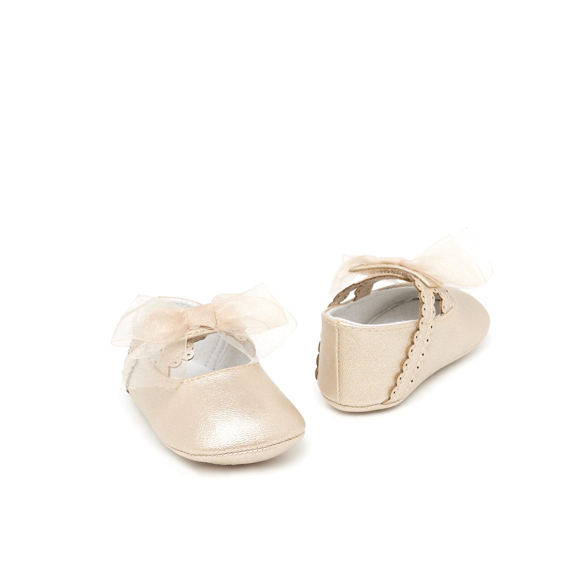 Ballerina Mayoral da neonata, perfette per occasioni speciali o per aggiungere un tocco elegante al look della tua piccola. Realizzate con un morbido materiale, presentano un grazioso fiocchetto in organza sulla parte superiore e un design con dettagli traforati lungo i bordi. Queste scarpine sono leggere e confortevoli, ideali per i piedini delicati dei neonate.