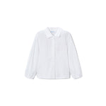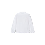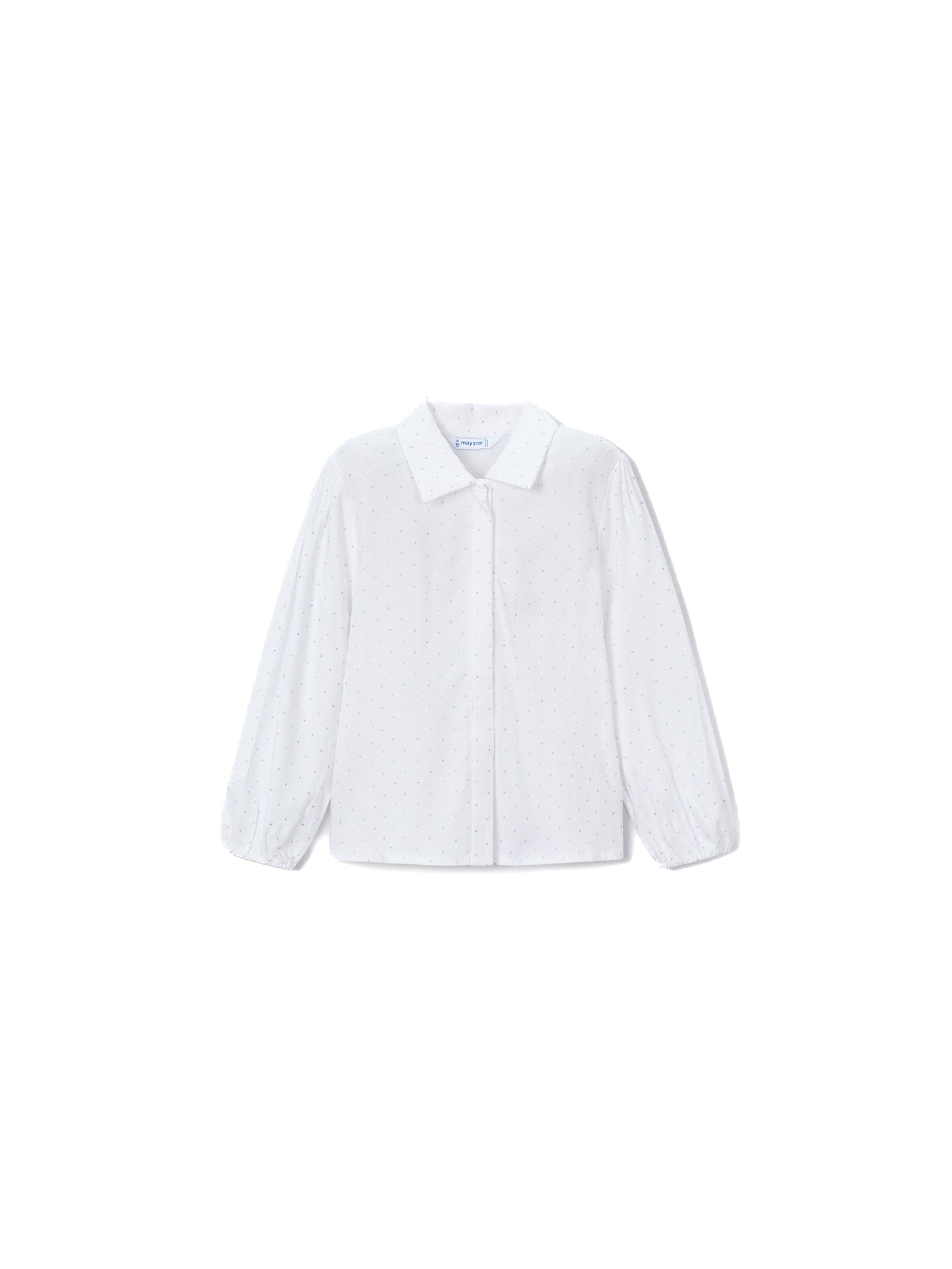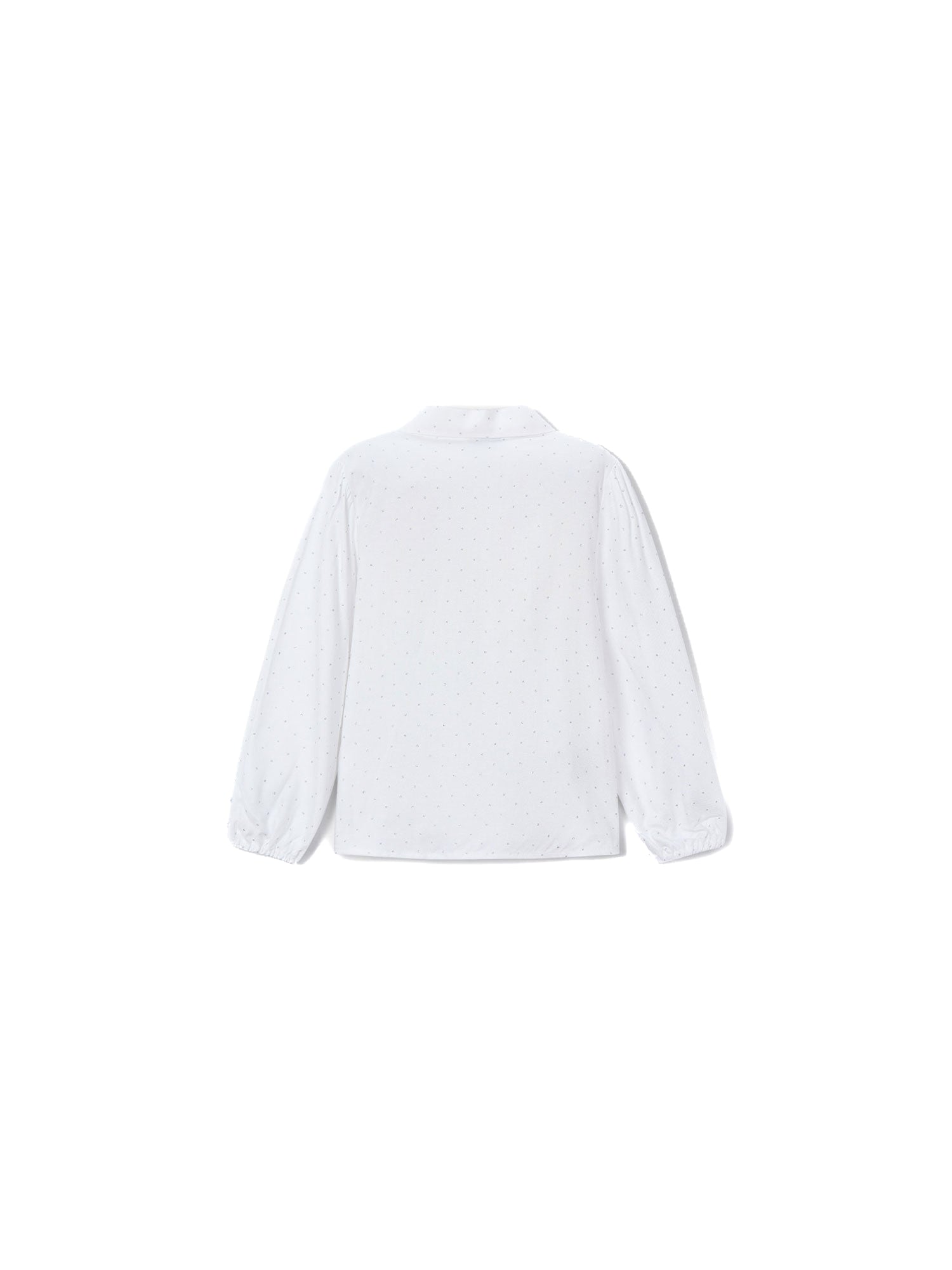 Un tocco elegante e discreto per i look delle grandi occasioni. Questa blusa a maniche lunghe è realizzata in tessuto leggero e impreziosita da una raffinata lavorazione a micro pois che dona luce e delicatezza. Il colletto classico e l’abbottonatura nascosta completano uno stile sobrio e raffinato, perfetto da abbinare a gonne, pantaloni eleganti o outfit cerimoniali.
