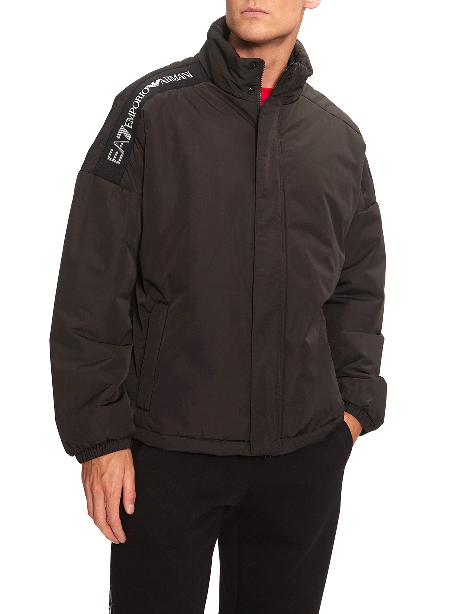 Giacca EA7 Emporio Armani dal design sportivo e moderno, ideale per la stagione invernale. Realizzata in tessuto tecnico nero, presenta una linea minimalista arricchita dal dettaglio del logo EA7 Emporio Armani sulla spalla sinistra, donando un tocco distintivo. Dotata di collo alto e chiusura frontale con zip coperta da patta, questa giacca garantisce protezione dal freddo e comfort. Le maniche sono elasticizzate per una vestibilità avvolgente e pratica, perfetta per look casual e sportivi.