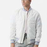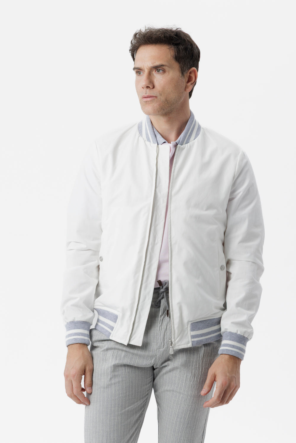 Bomber in stile college dalla vestibilità slim, realizzato in pregiato cotone tecnico. I dettagli in maglina strech a contrasto sul colletto, fondo e polsini completano il mood sportivo del capo, mentre la chiusura con zip a scomparsa assicura una vestibilità perfetta.