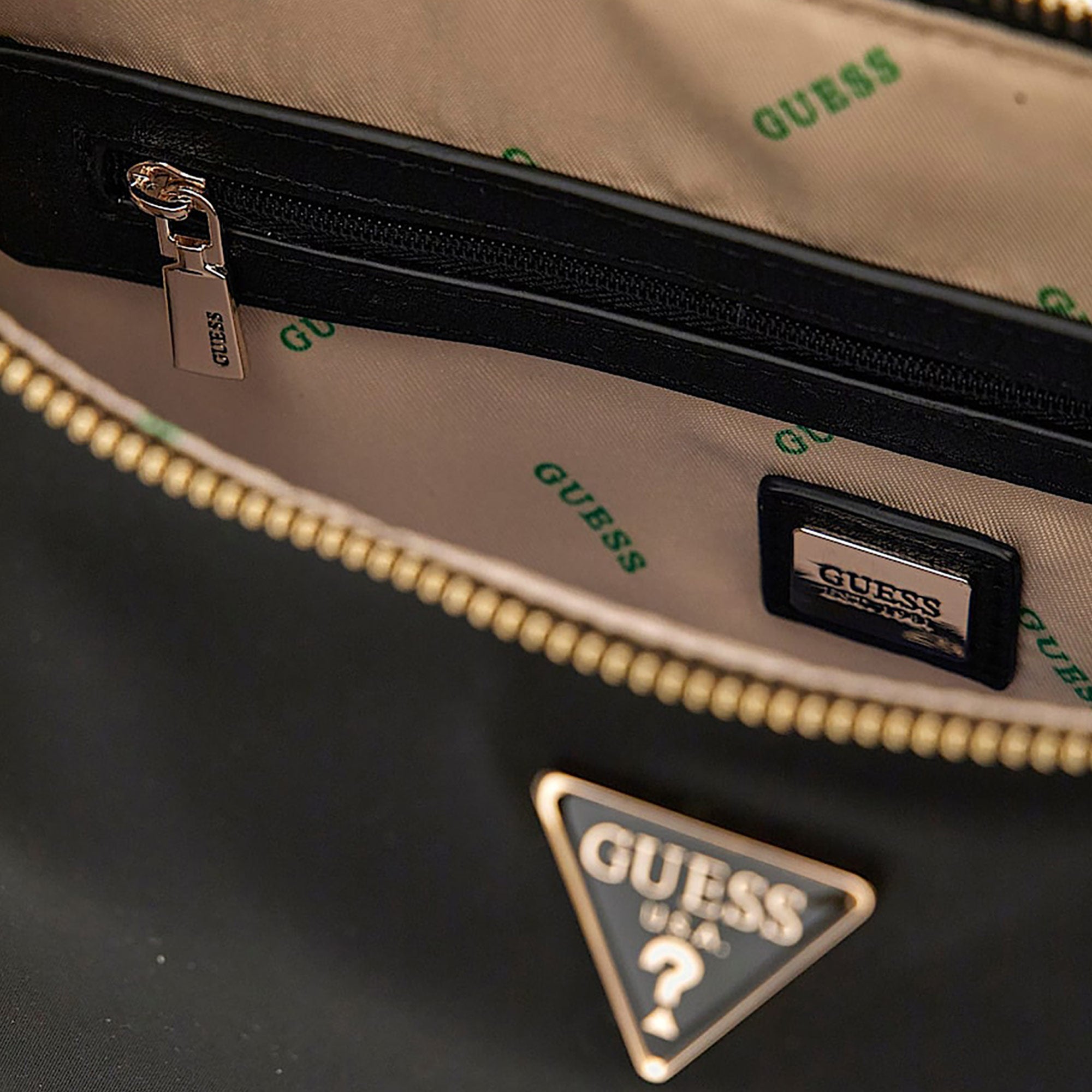 - Dettaglio del logo triangolare GUESS in metallo sulla parte frontale