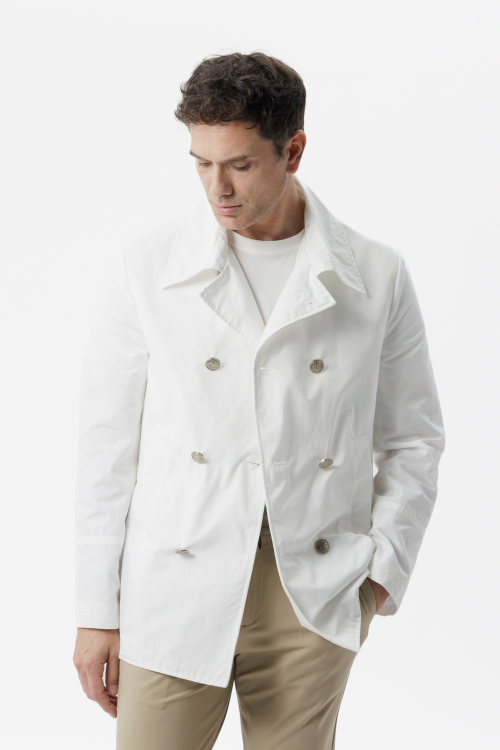 Caban doppiopetto realizzato in pregiato cotone tecnico, che garantisce leggerezza e comfort senza rinunciare alla protezione dalle prime brezze primaverili. La sua silhouette elegante e slanciata è esaltata dalla doppia fila di bottoni in galvanica, che aggiungono un tocco di personalità. Completano il capo i dettagli sartoriali evidenziati dal sottocollo trapuntato e dalle finiture interne.