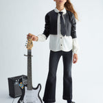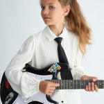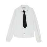 Camicia per bambina LiuJo che unisce eleganza e modernità grazie alla combinazione di colori classici e dettagli raffinati. Realizzata in tessuto bianco, presenta un colletto a punta e maniche lunghe leggermente arricciate sui polsi. Il tocco distintivo è la cravatta nera abbinata, che aggiunge un elemento di stile e contrasto. La cravatta presenta un piccolo ricamo del logo Liu Jo, completando il look con un dettaglio discreto ma sofisticato.