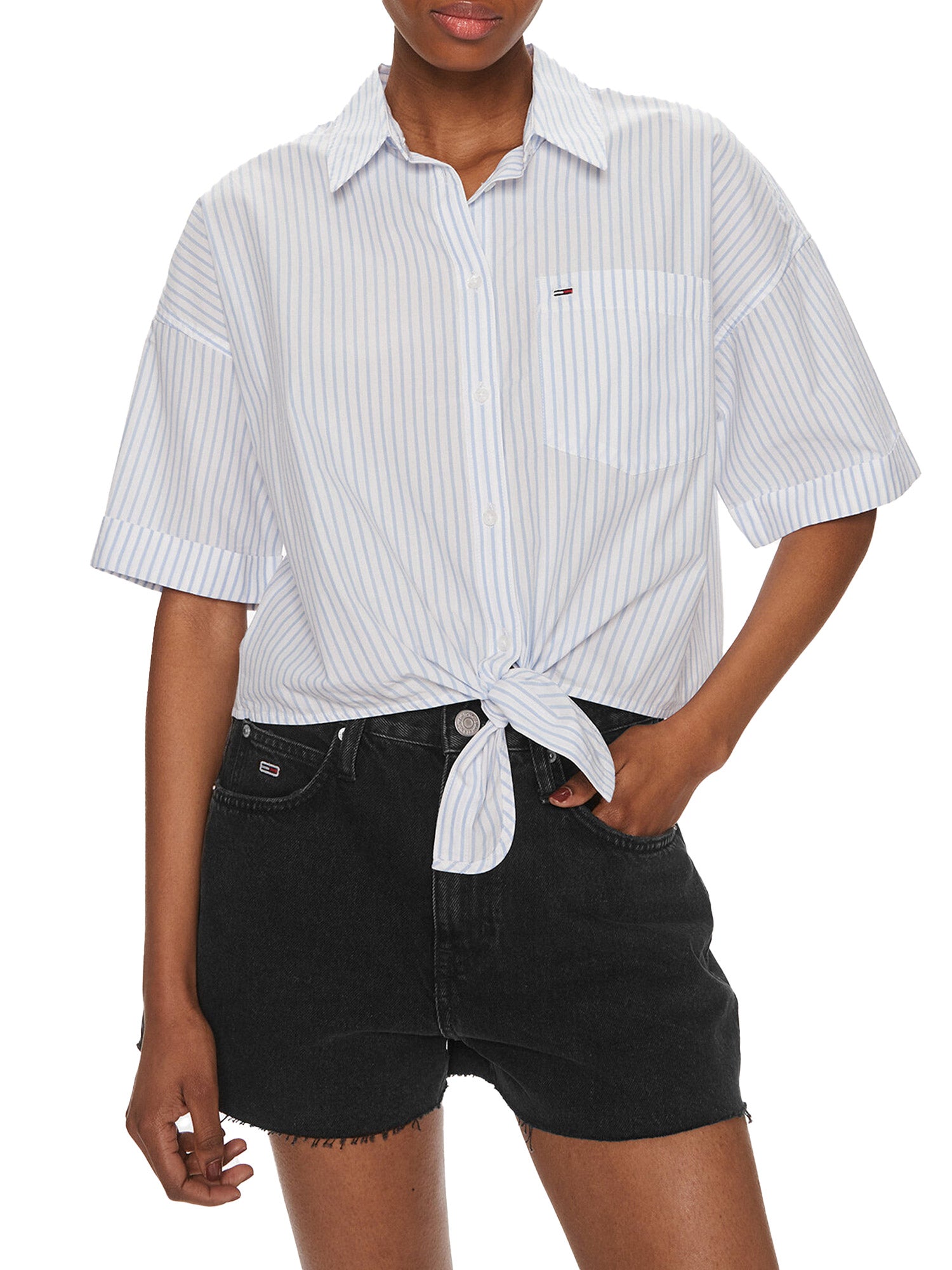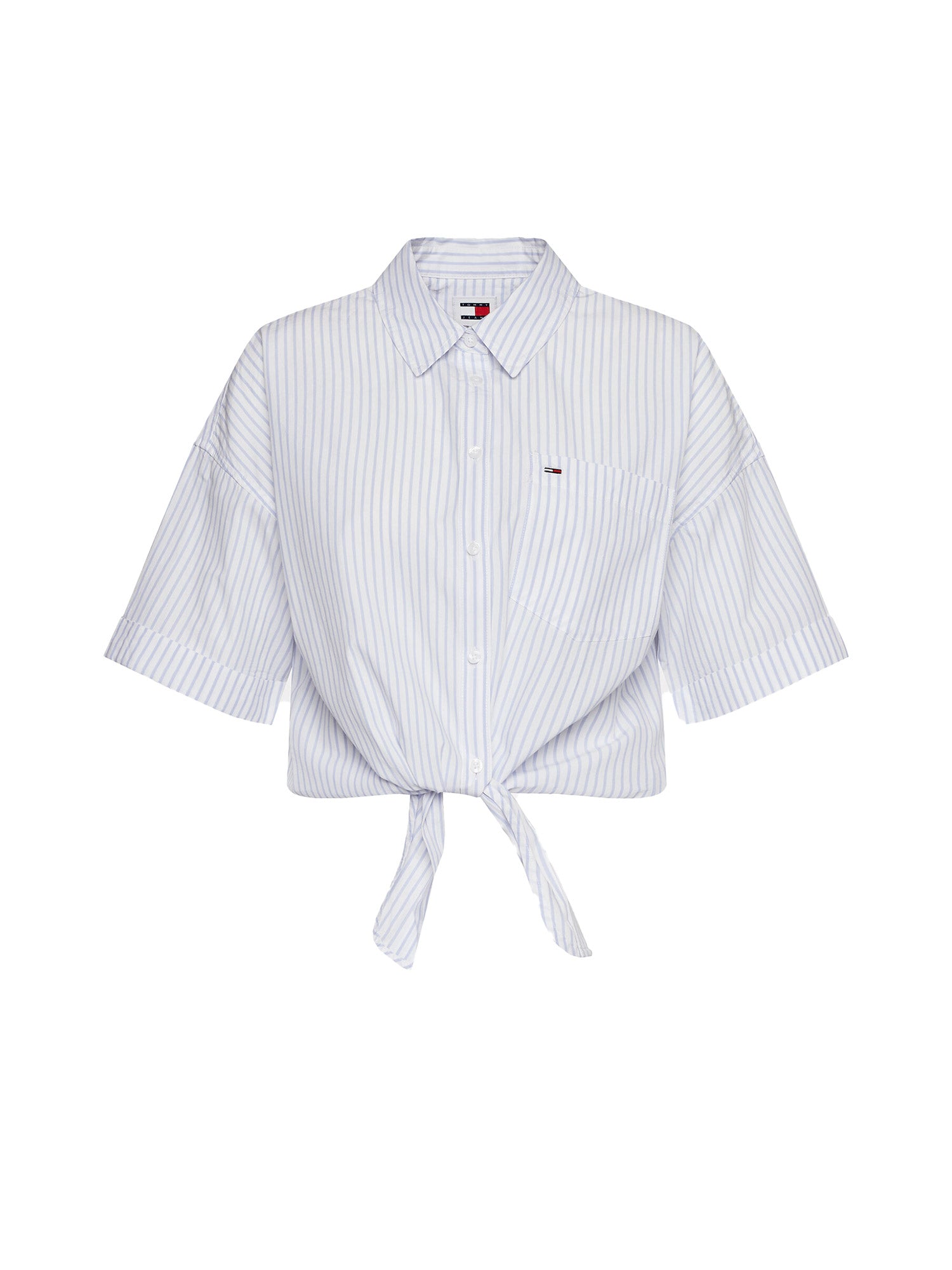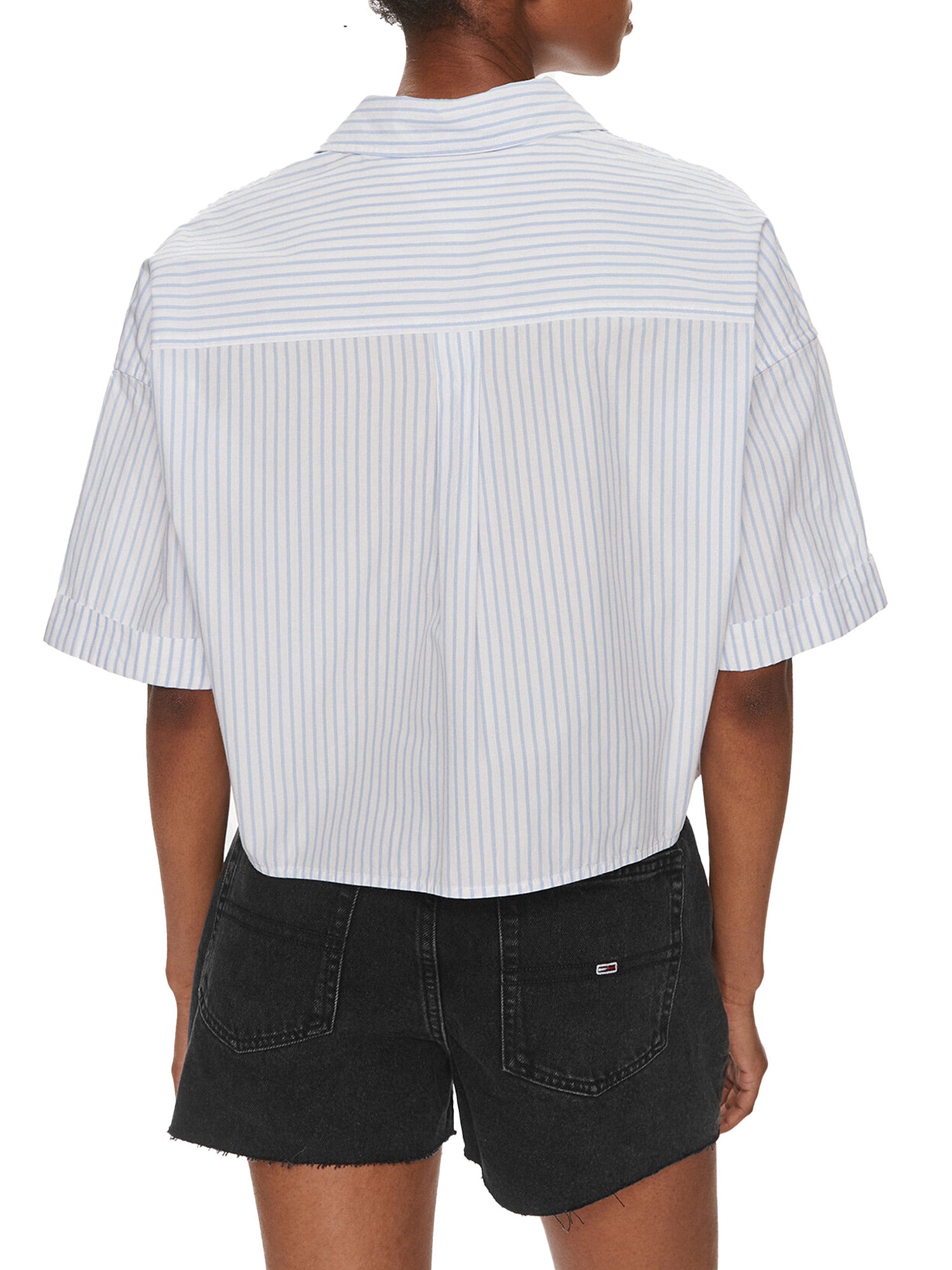 Camicia crop a righe con manica 3/4 e fiocco celeste