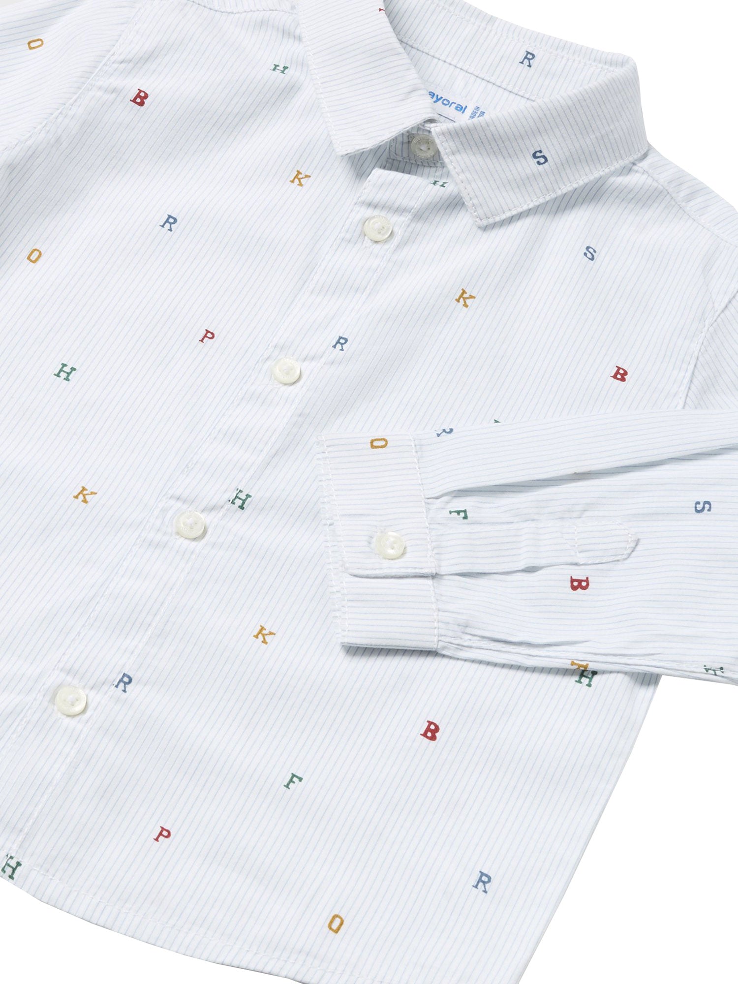Camicia Mayoral neonato a maniche lunghe dal design fresco e divertente. La camicia è di colore bianco con sottili righe verticali e presenta una stampa sparsa di lettere colorate in tonalità vivaci come giallo, blu, arancione e verde.
