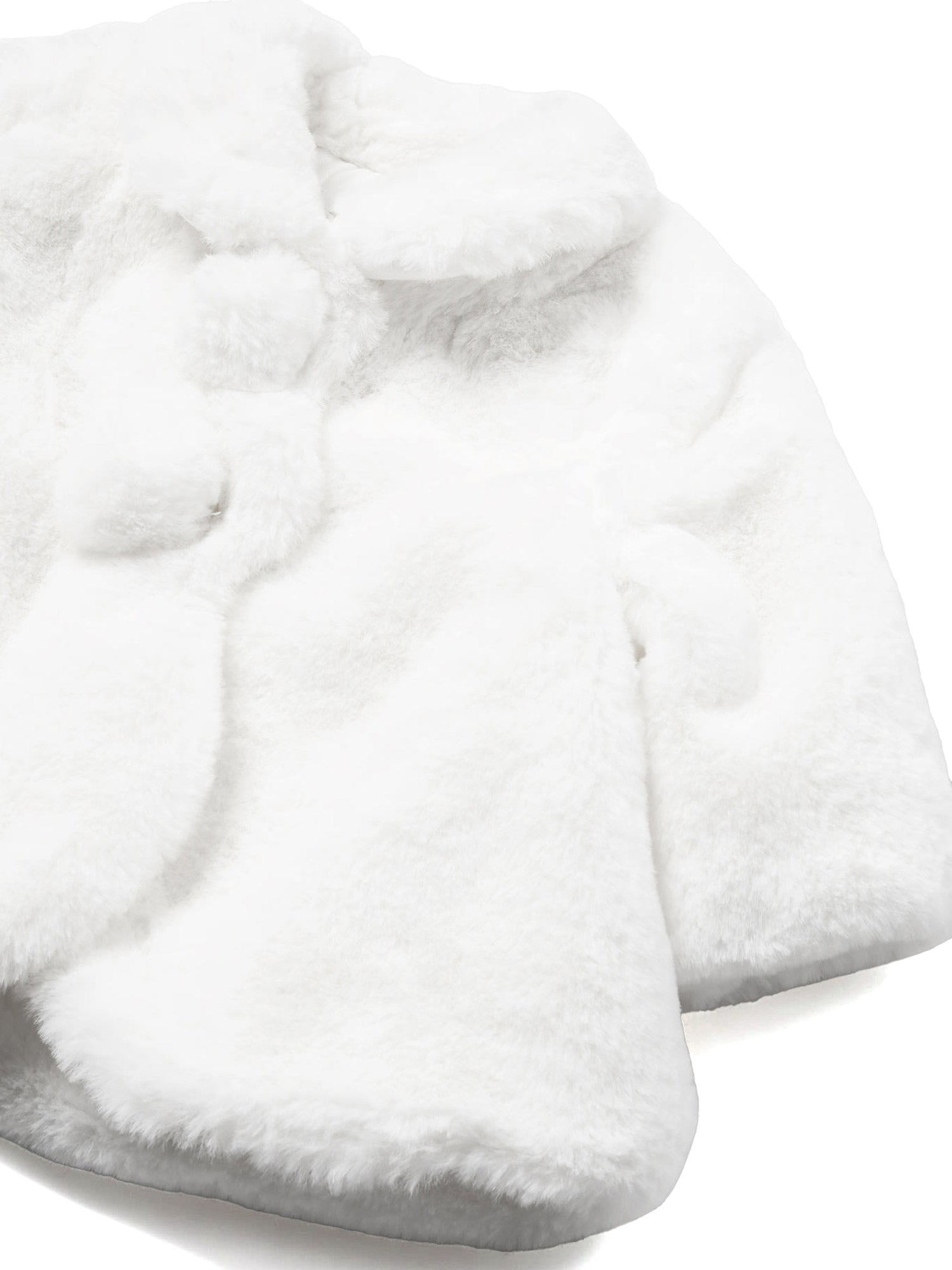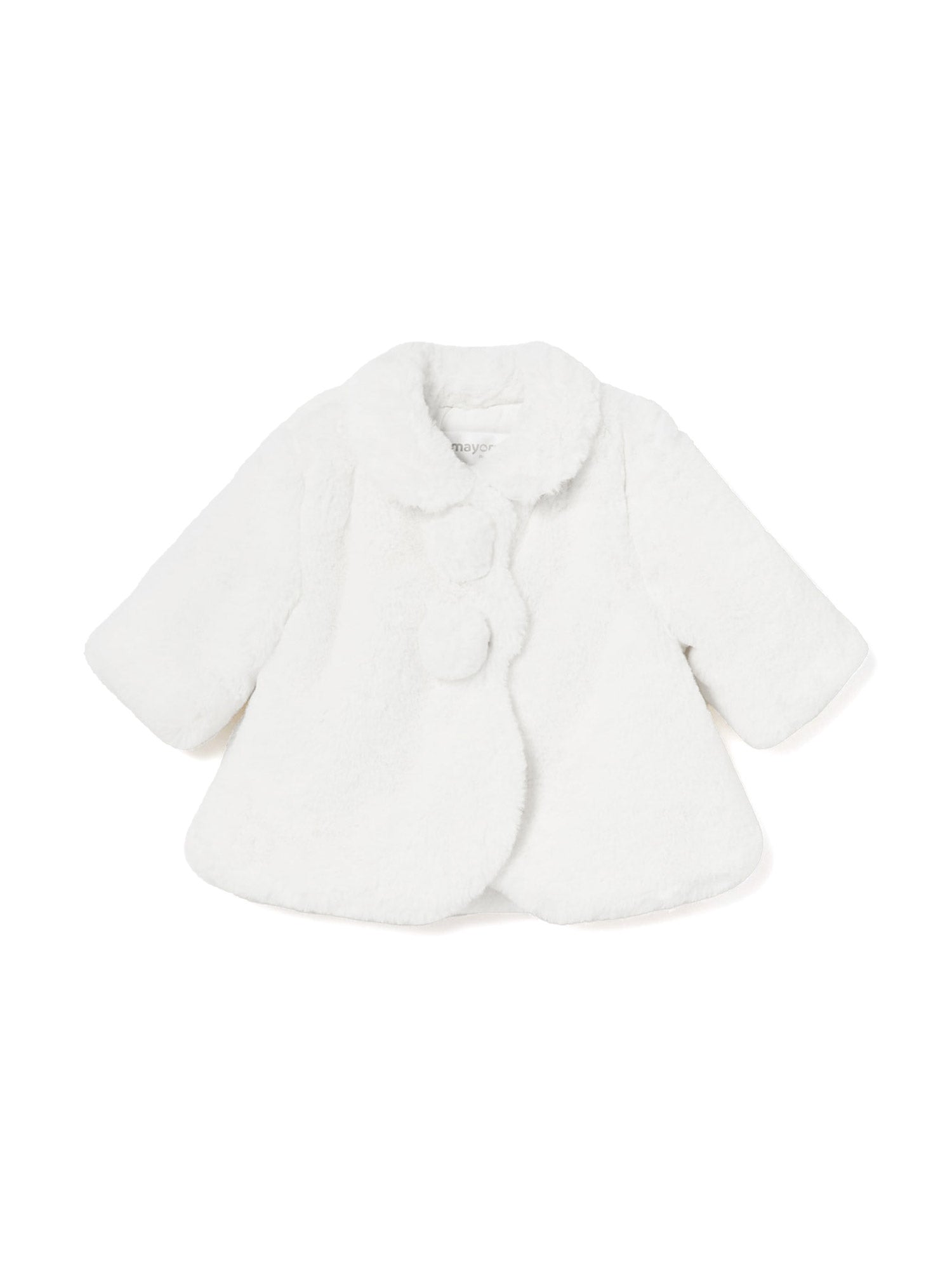 Cappotto in pelliccia sintetica neonata Mayoral di colore bianco. Il design è elegante e morbido, con un ampio colletto e maniche lunghe. La chiusura frontale presenta due grandi bottoni ricoperti di pelliccia, che aggiungono un tocco di dolcezza al capo.