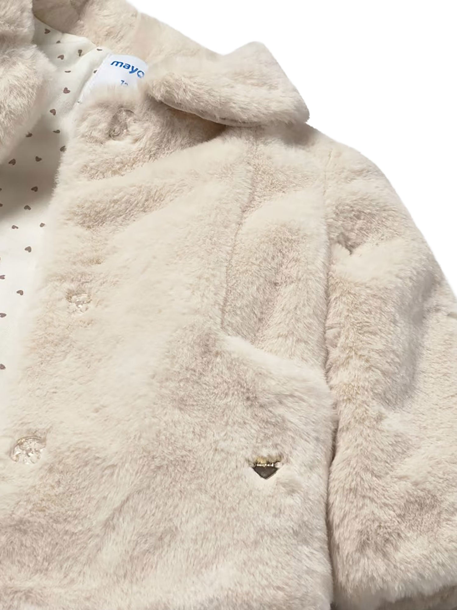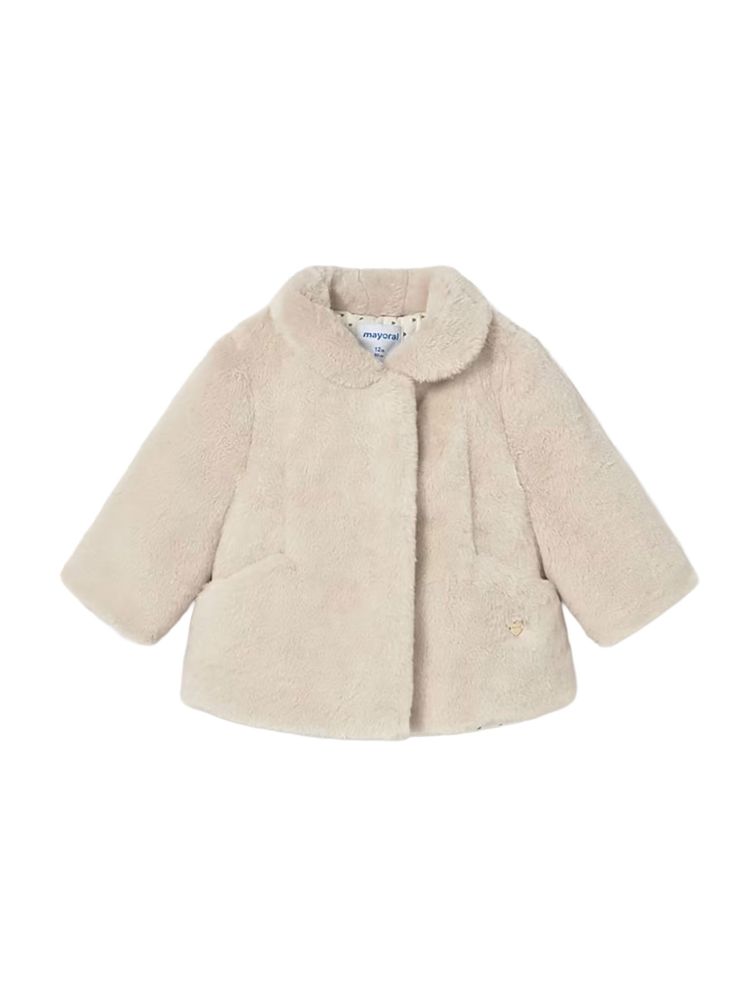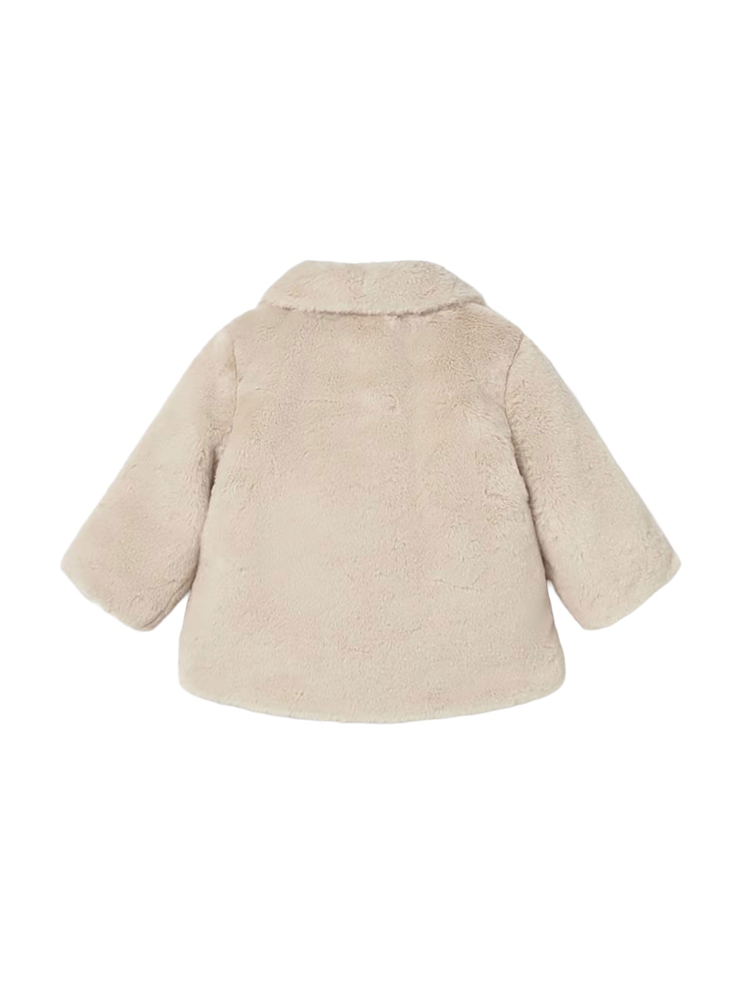 Cappotto pelliccia Mayoral neonata a manica lunga. Realizzato in morbido tessuto effetto pelliccia, pensato per offrire calore e comfort durante le stagioni più fredde.