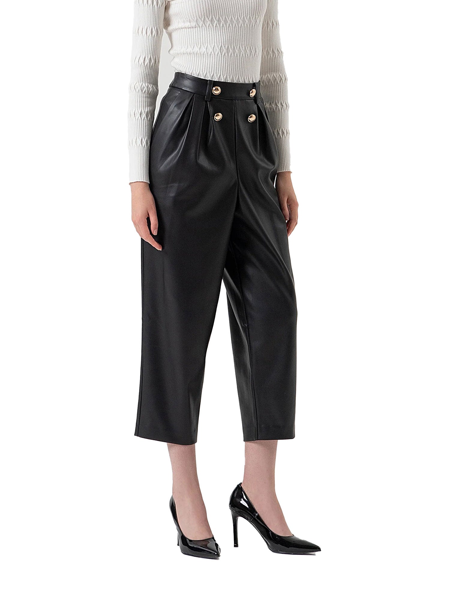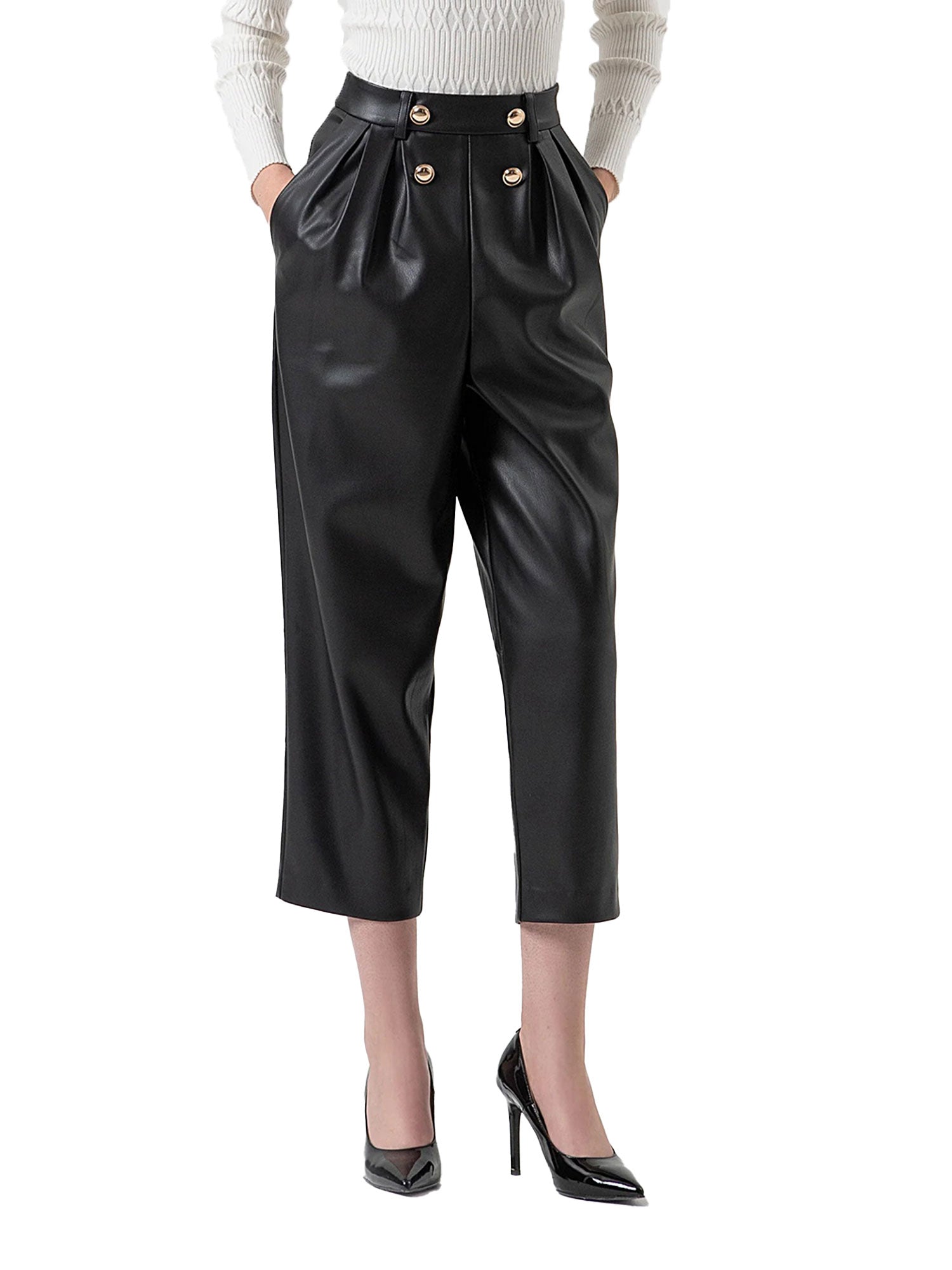 Pantalone Fracomina donna in ecopelle nera a vita alta. Un capo deciso e raffinato, perfetto per look contemporanei dal carattere sofisticato. Realizzato in morbida ecopelle, questo pantalone Fracomina presenta una linea cropped con pinces e vita alta valorizzata da bottoni dorati a contrasto, che aggiungono un tocco di luce e personalità.