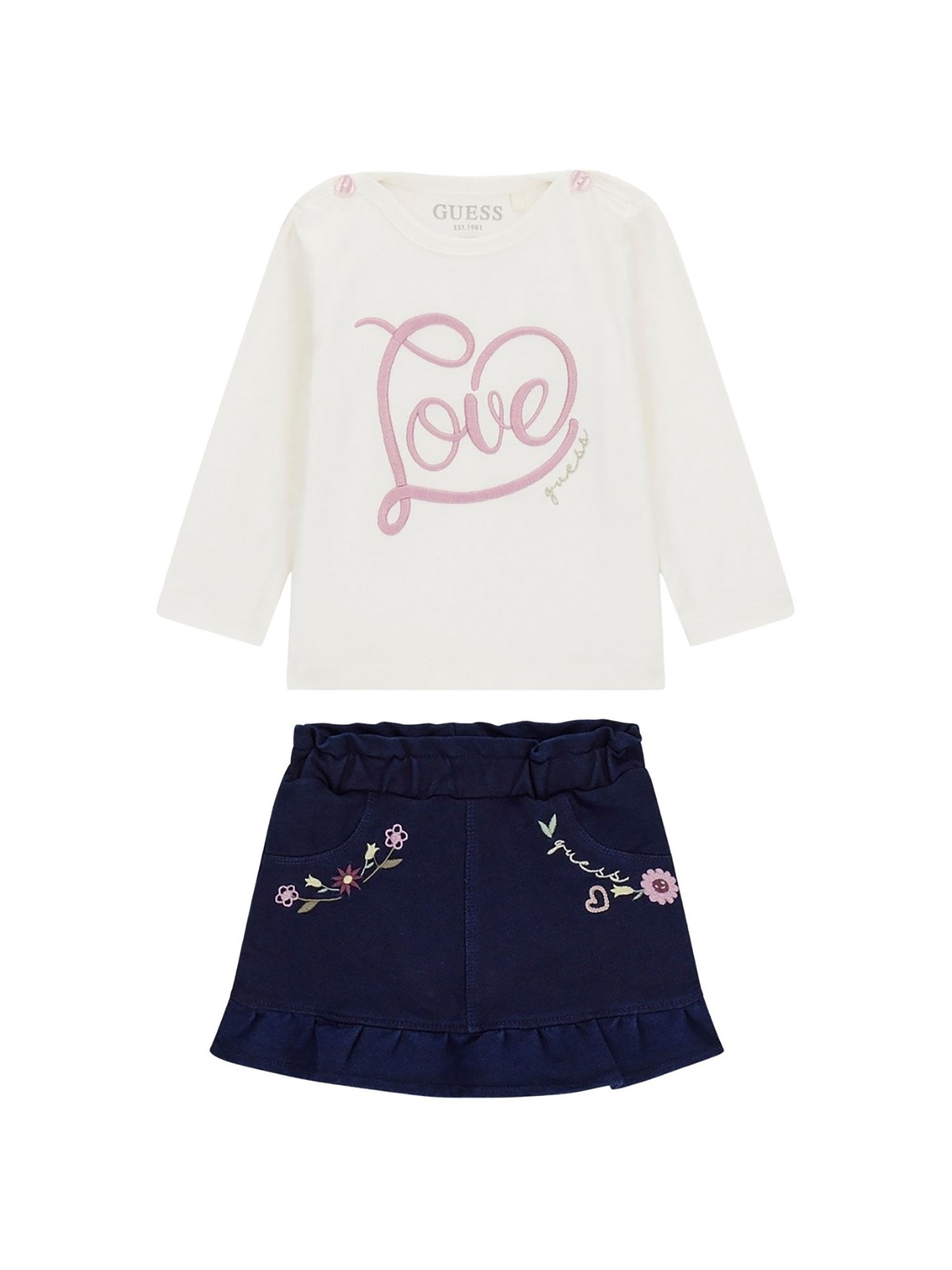 Completo due pezzi Guess per neonata, dal gusto romantico e delicato, ideale per un look curato e confortevole.