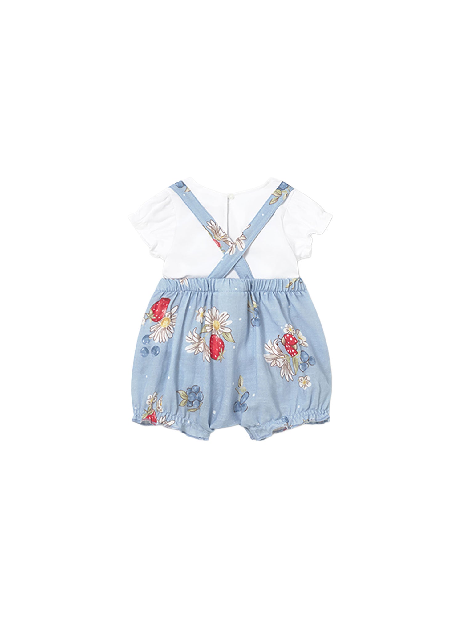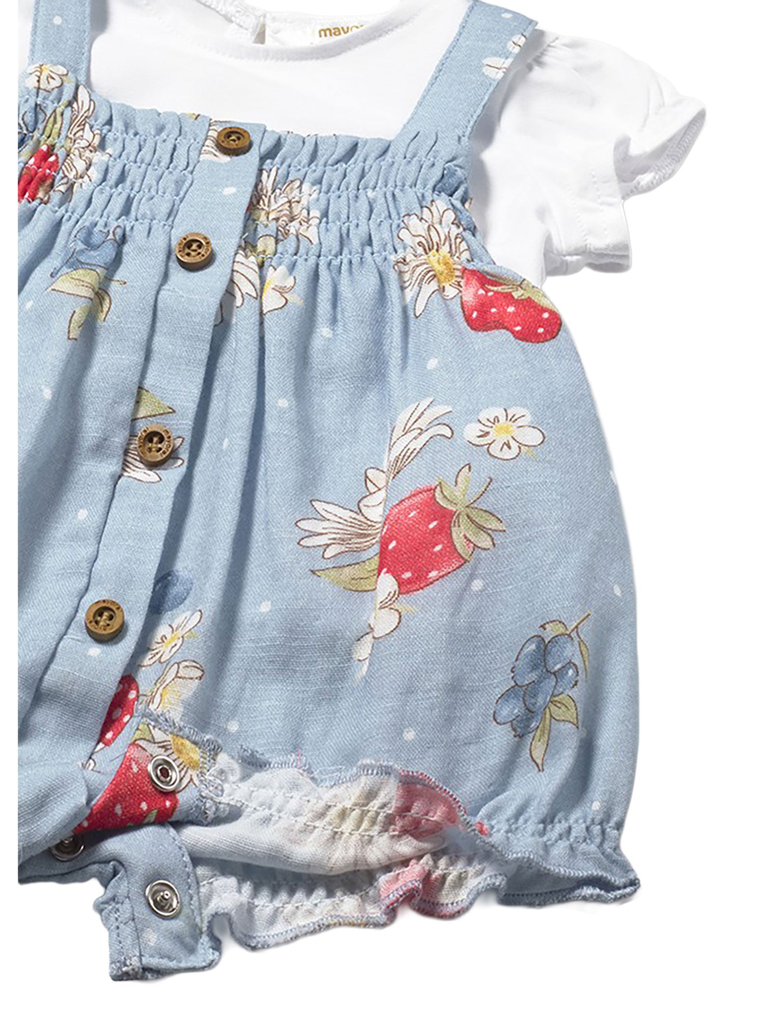 Pagliaccetto con stampa floreale e fragole su fondo azzurro