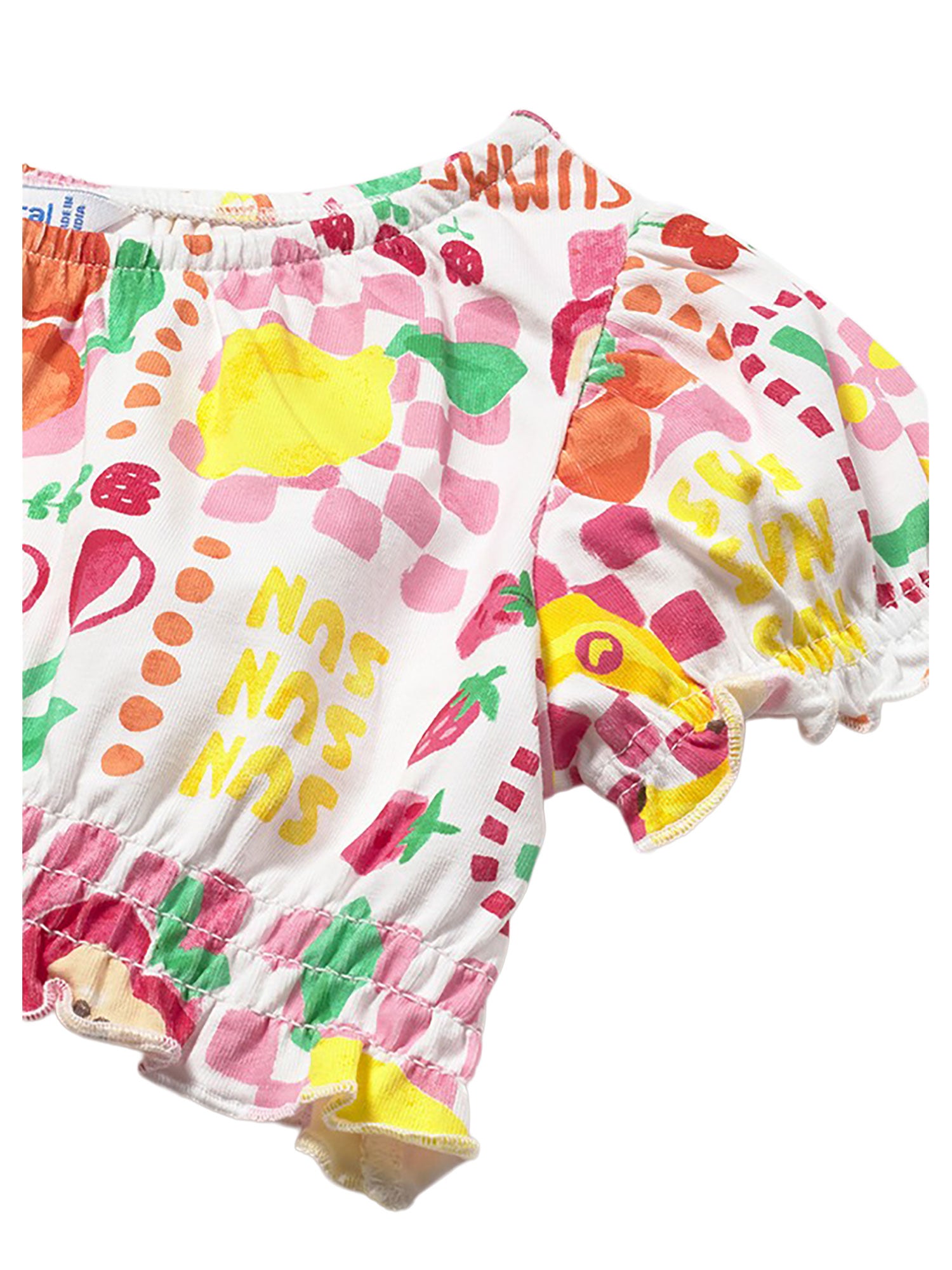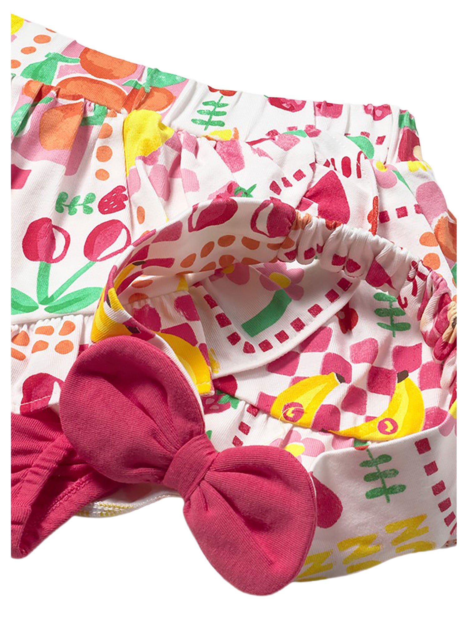 Completo estivo vivace e allegro, perfetto per vestire la neonata con stile durante le giornate più calde. La fantasia colorata con frutta e motivi estivi dona all’outfit un look fresco e giocoso, ideale per l’estate.