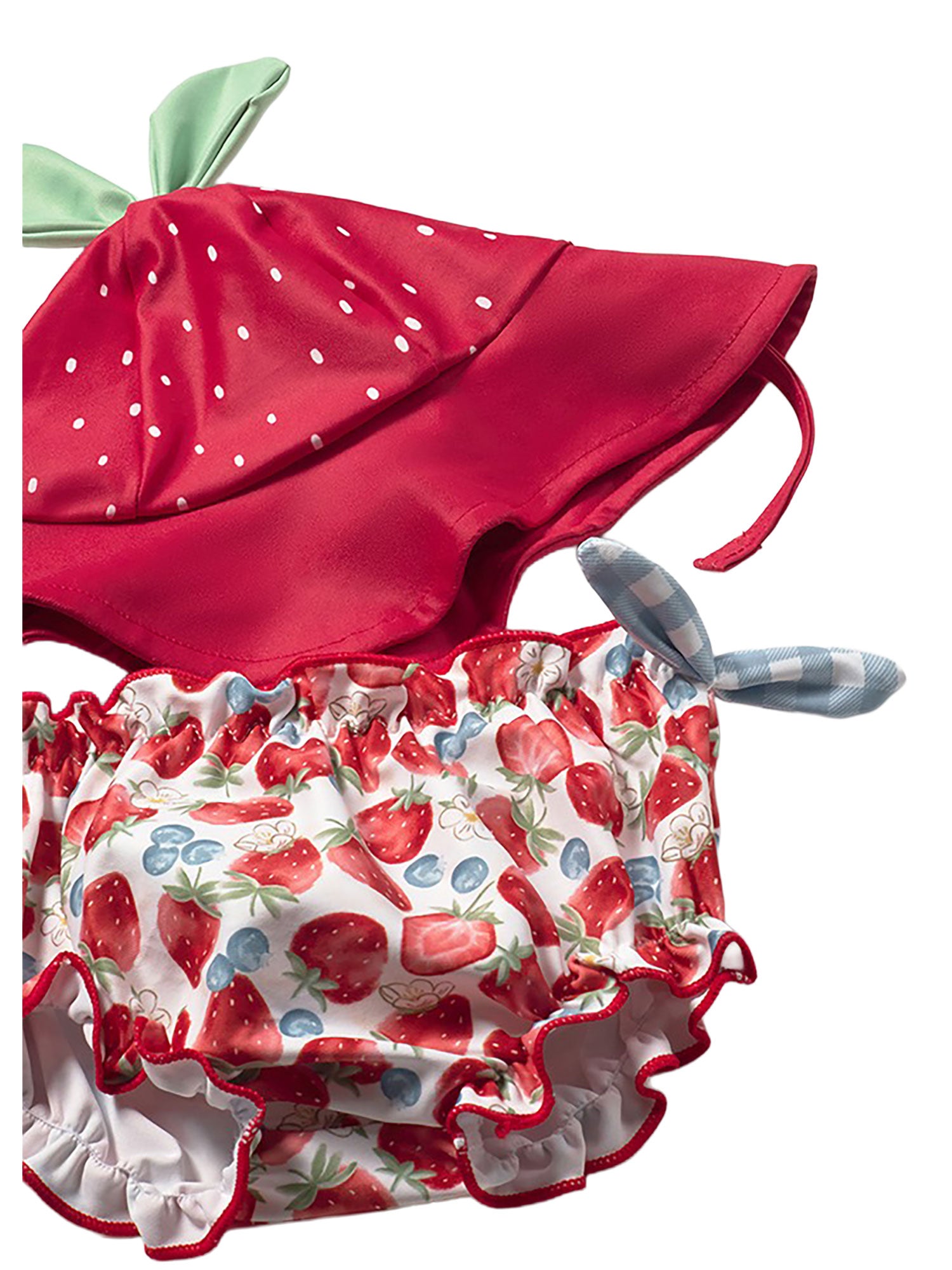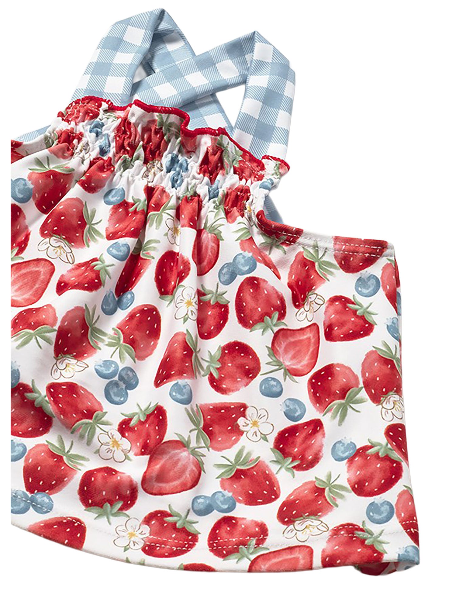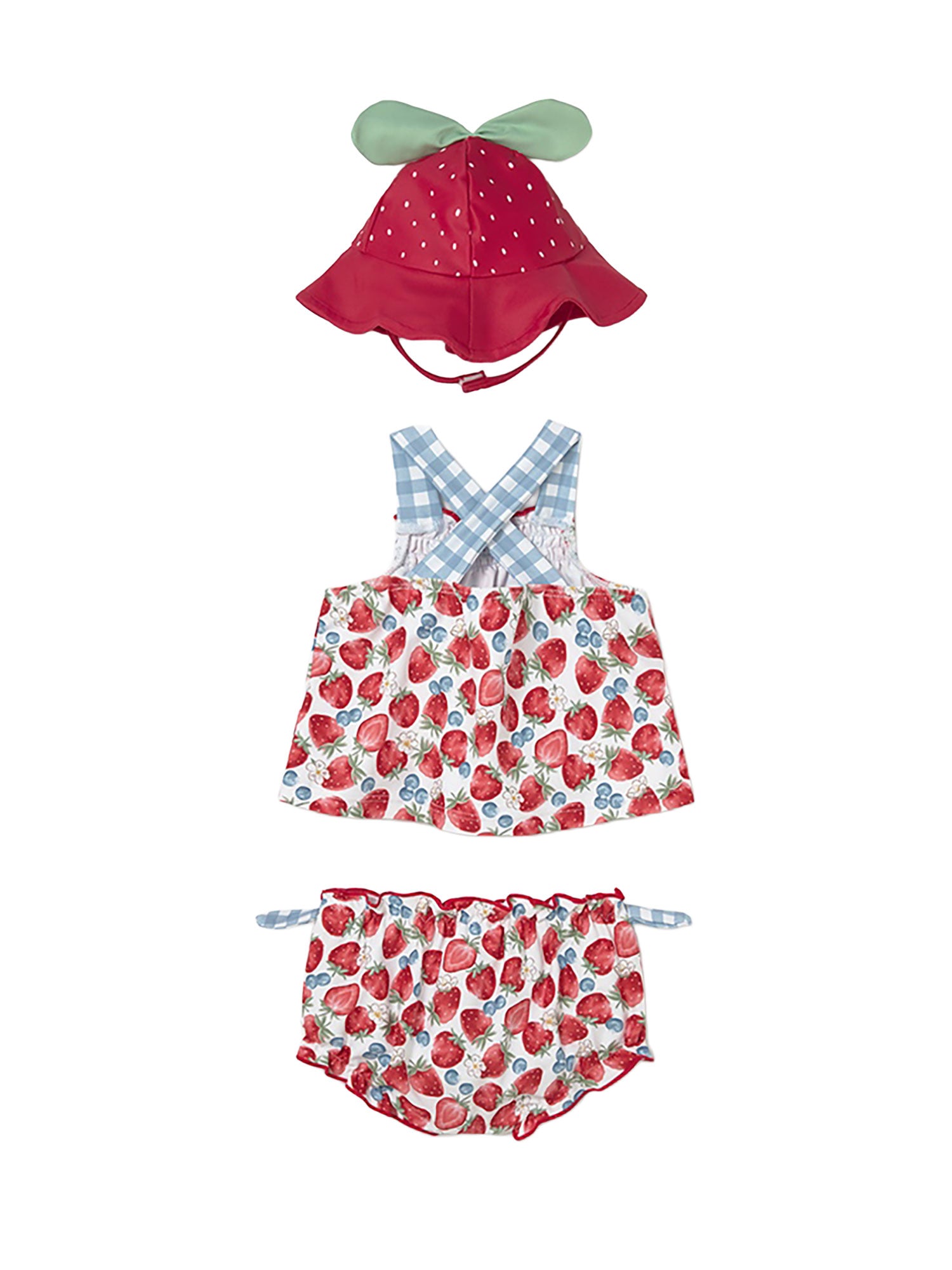 Completo Mayoral estivo dolce e colorato, perfetto per vestire la neonata con freschezza e allegria. La vivace fantasia con fragole e i dettagli coordinati rendono questo outfit ideale per le giornate di sole e per un look tenero e curato.