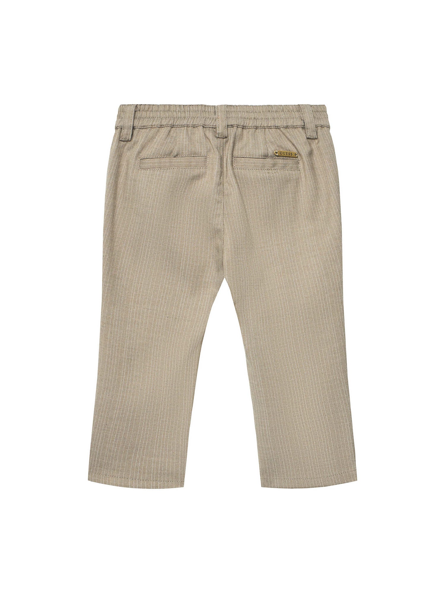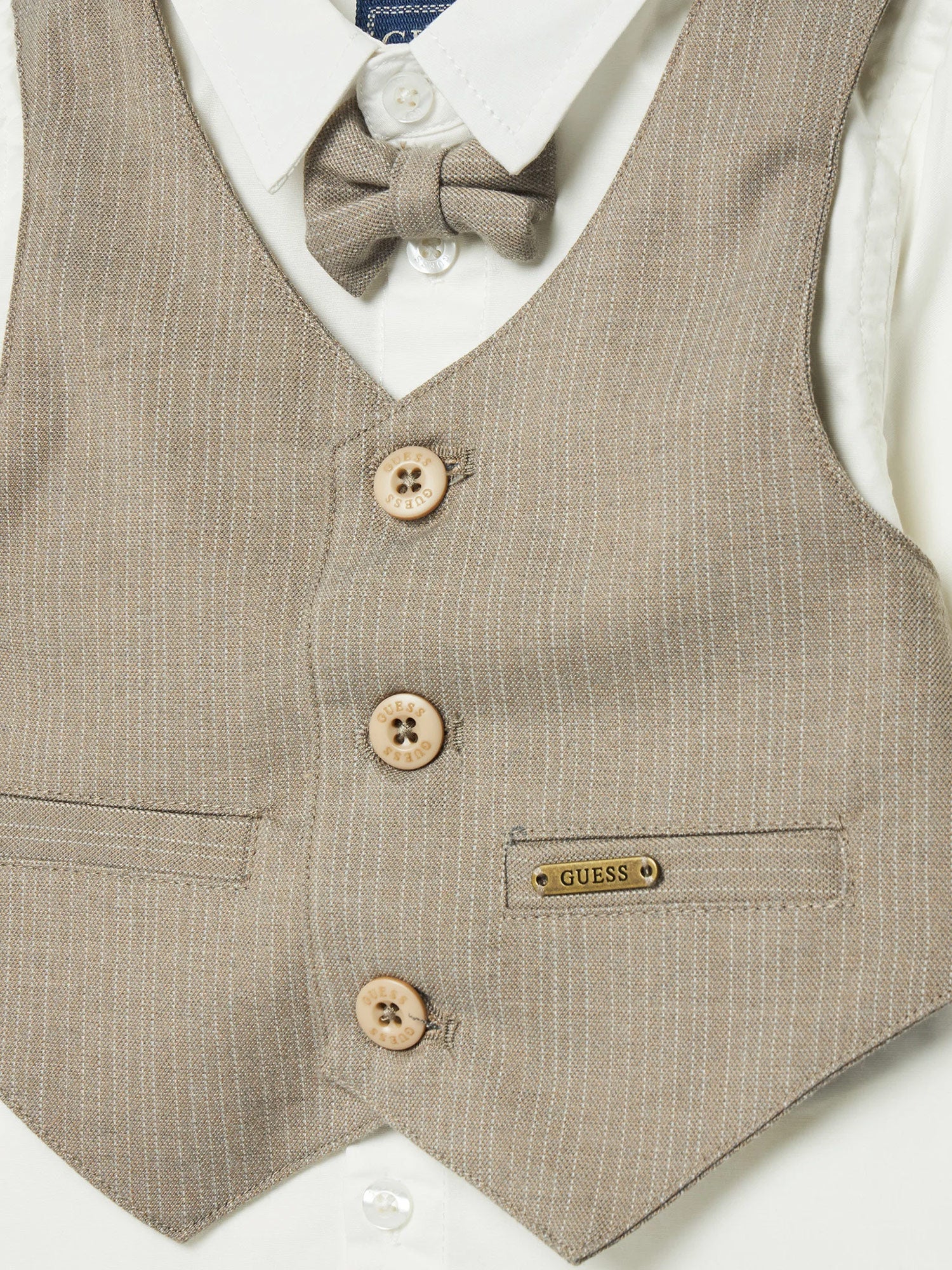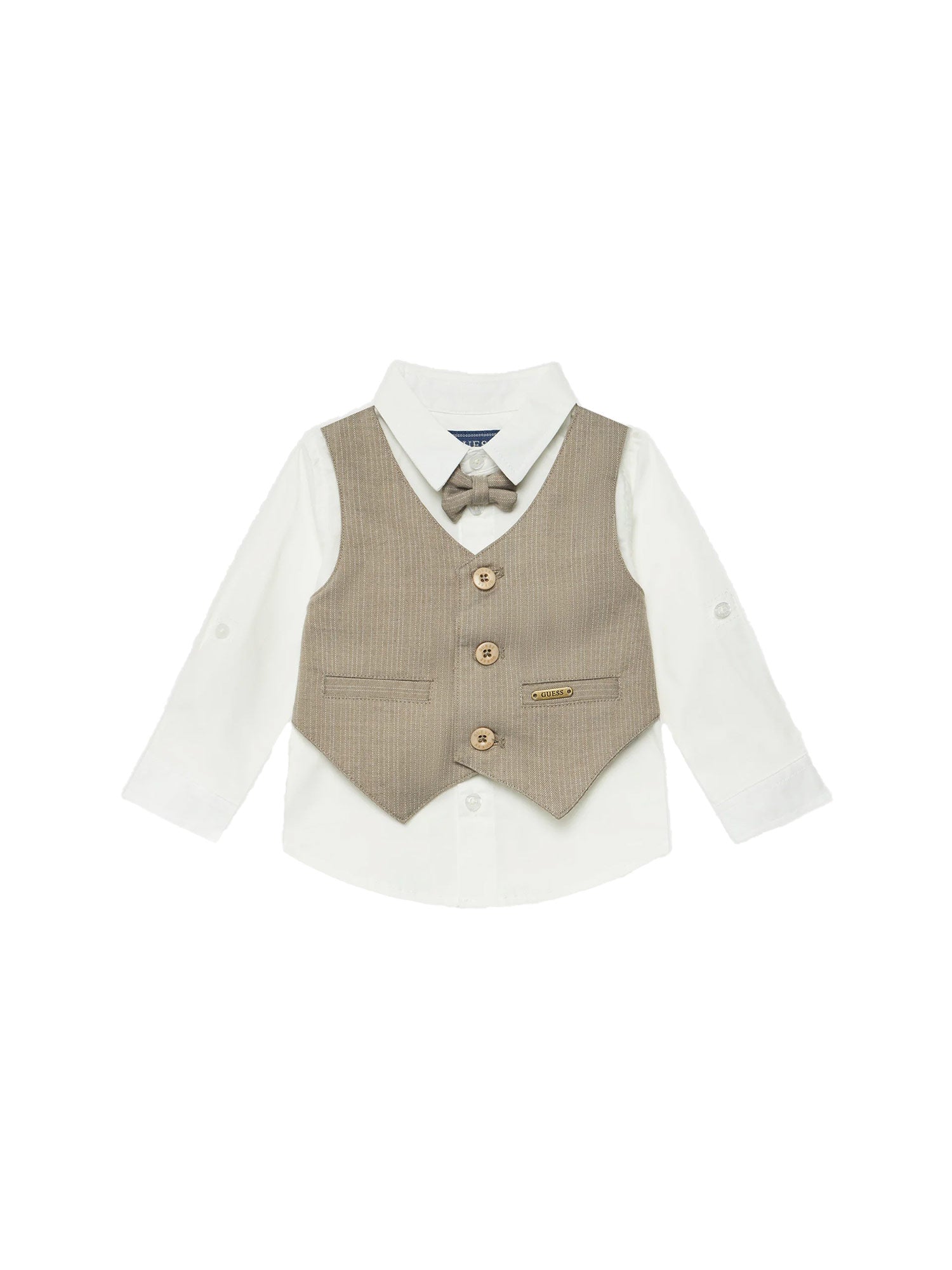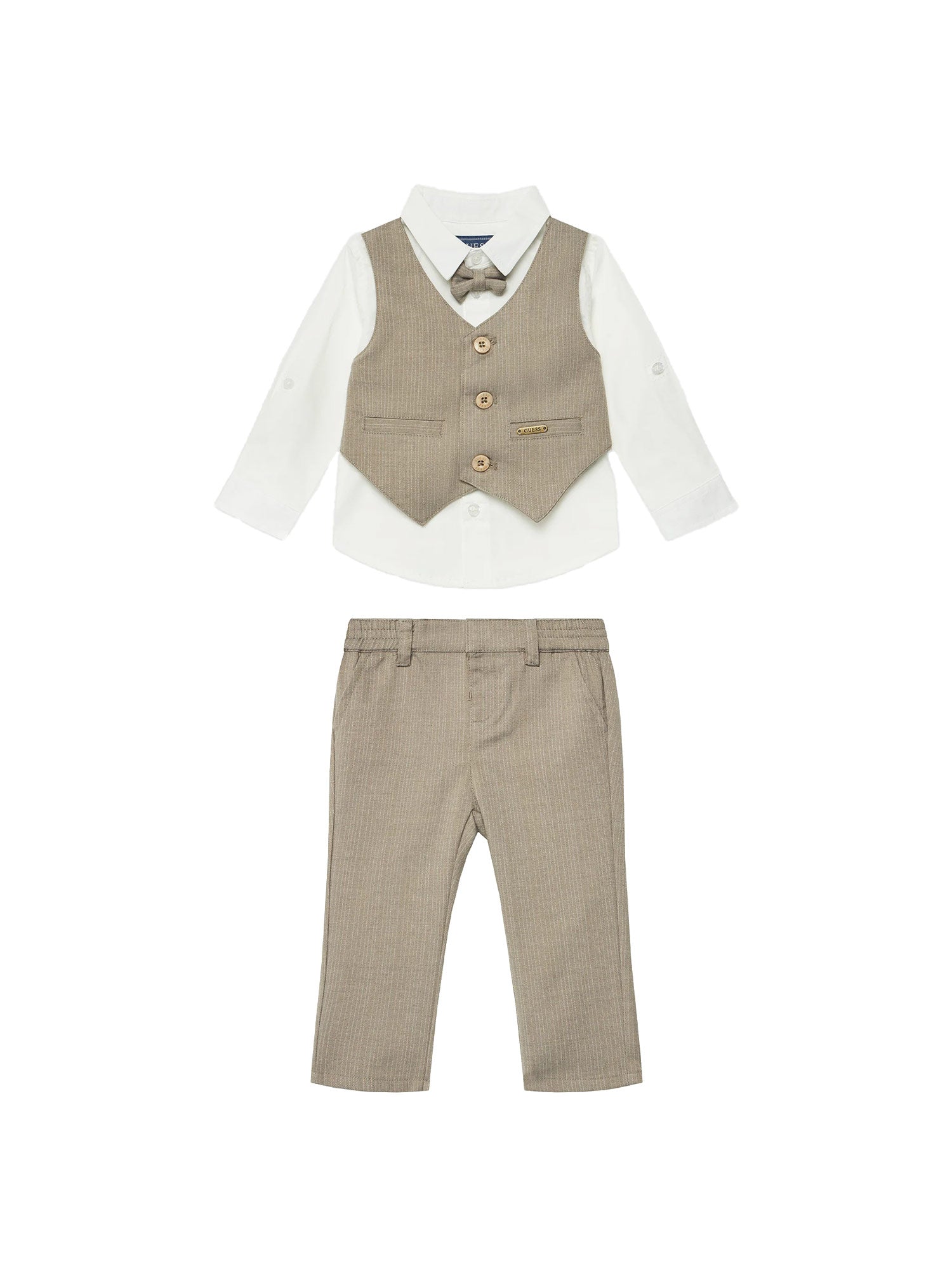 Completo Guess per neonato, un outfit elegante e raffinato, ideale per occasioni speciali. La composizione include una camicia con maniche lunghe, accompagnata da un gilet con un delicato motivo a righe e da un papillon in tinta unita, che aggiunge un tocco di stile formale. I pantaloni coordinati, presentano una vestibilità comoda grazie alla cintura elastica, ma senza rinunciare a un aspetto elegante con il design a righe sottili. Un piccolo logo Guess sulla parte inferiore dei pantaloni e sulla tasca del gilet completa il look, con un dettaglio di classe.
