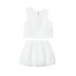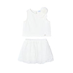 Un completo fresco e ricercato firmato Mayoral, pensato per accompagnare la tua bimba nelle giornate estive con stile e leggerezza. Il top con fiore applicato sulla spalla si abbina perfettamente alla gonnellina ballon in coordinato, per un look elegante e delicato, perfetto per occasioni speciali e momenti di festa.