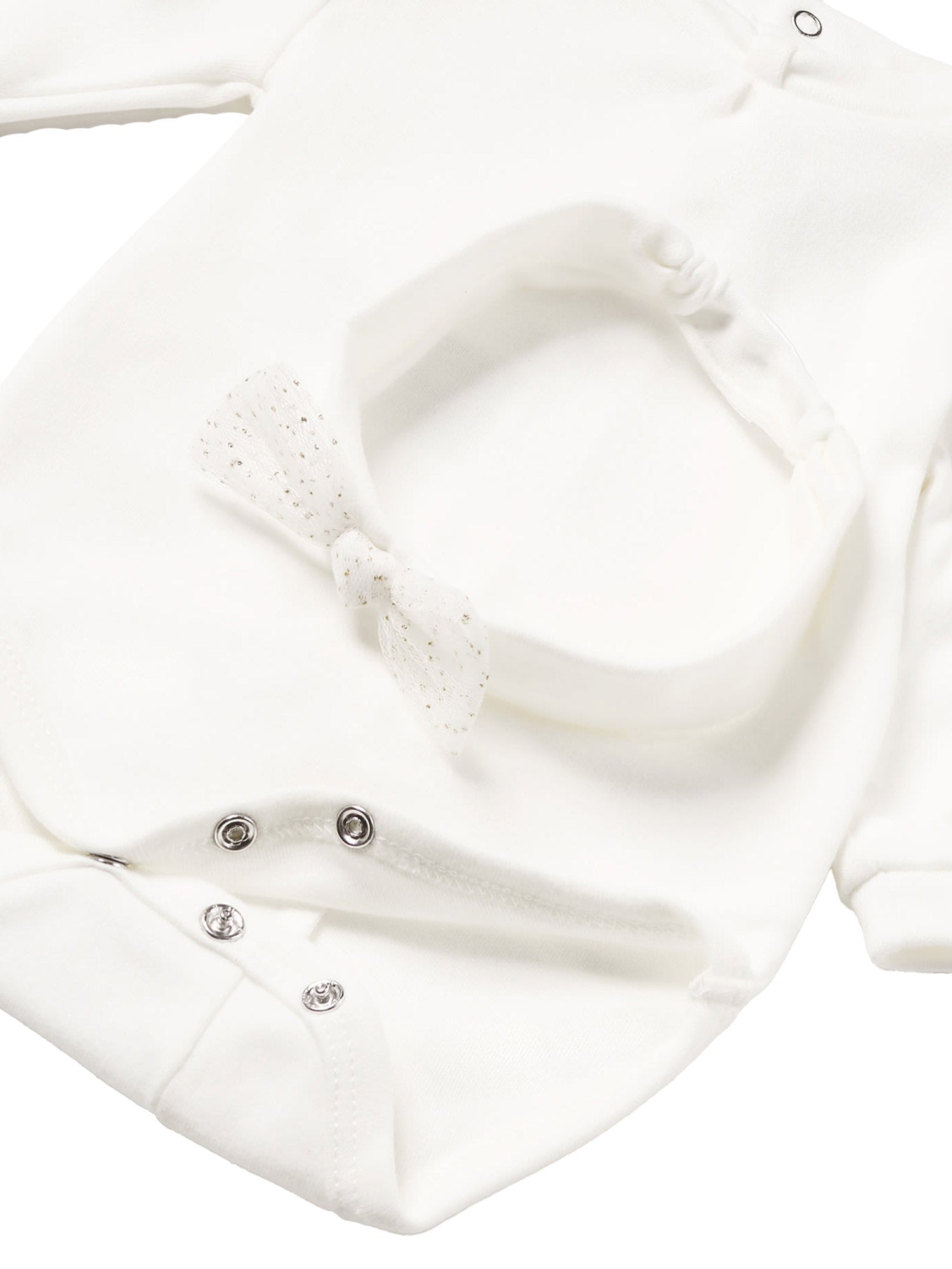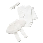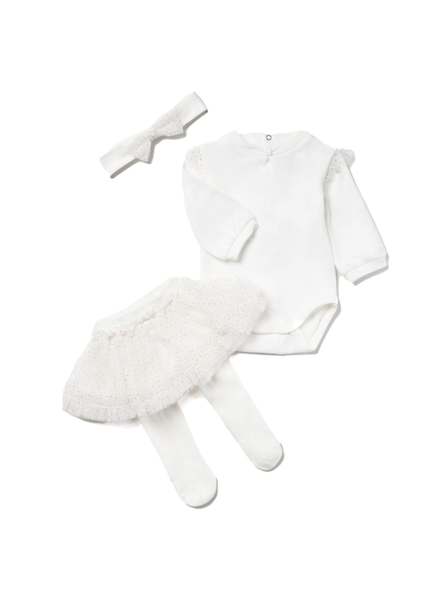 Questo set da neonata Mayoral è composto da tre pezzi coordinati in bianco: fascia, body e collant con tutù. L'intero completo ha uno stile delicato e romantico, ideale per vestire la bambina in modo elegante e confortevole.