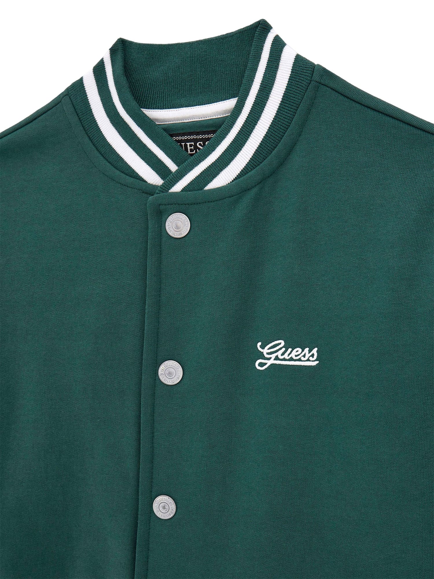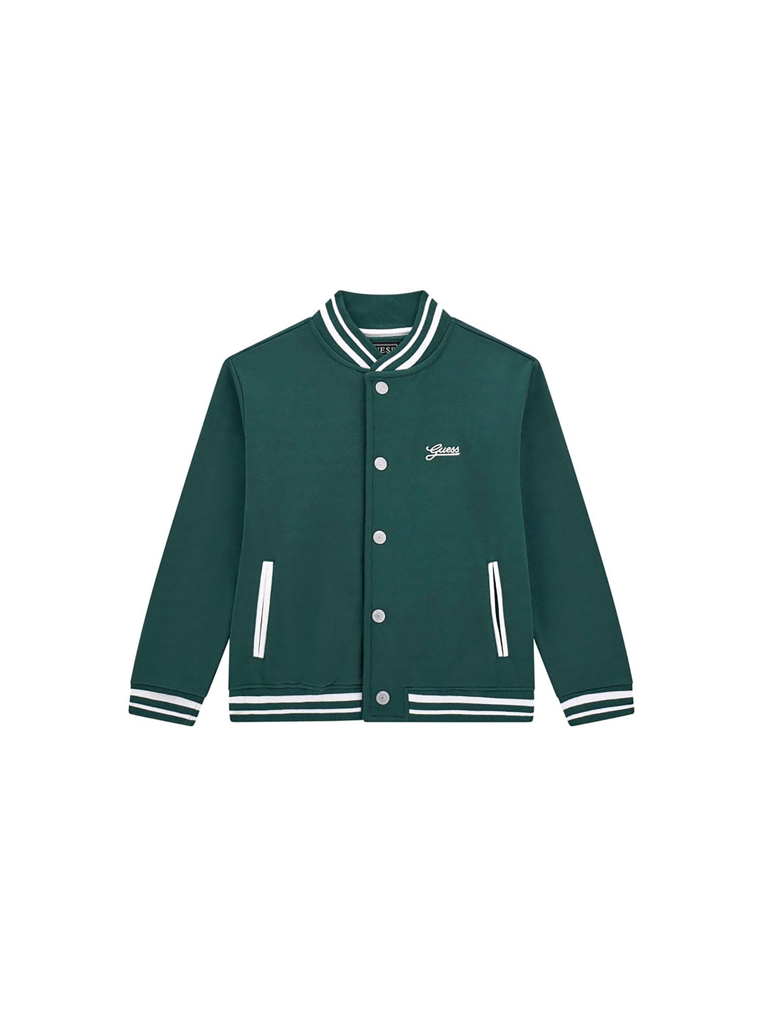 Giacca college Guess ragazzo dal fascino sportivo e intramontabile. Realizzata in morbido cotone, presenta chiusura con bottoni automatici e dettagli a righe sul colletto, sui polsini e sul fondo per un look varsity autentico.
