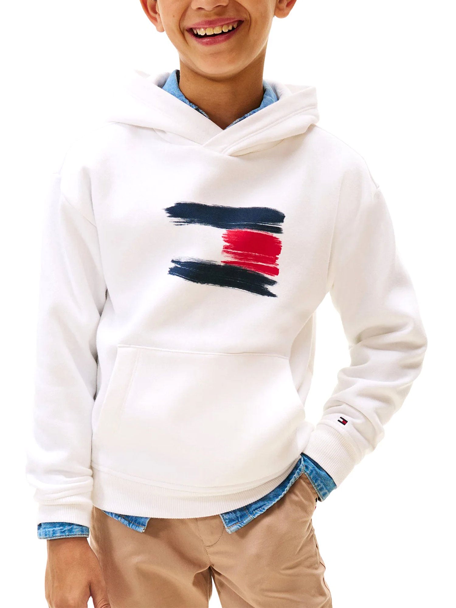 Felpa con cappuccio Tommy Hilfiger bimbo con bandiera frontale. Un modello iconico e confortevole, perfetto per il quotidiano grazie al suo design semplice ma ricco di personalità. La grafica effetto pennellata richiama la celebre bandiera del brand in una versione moderna e divertente.