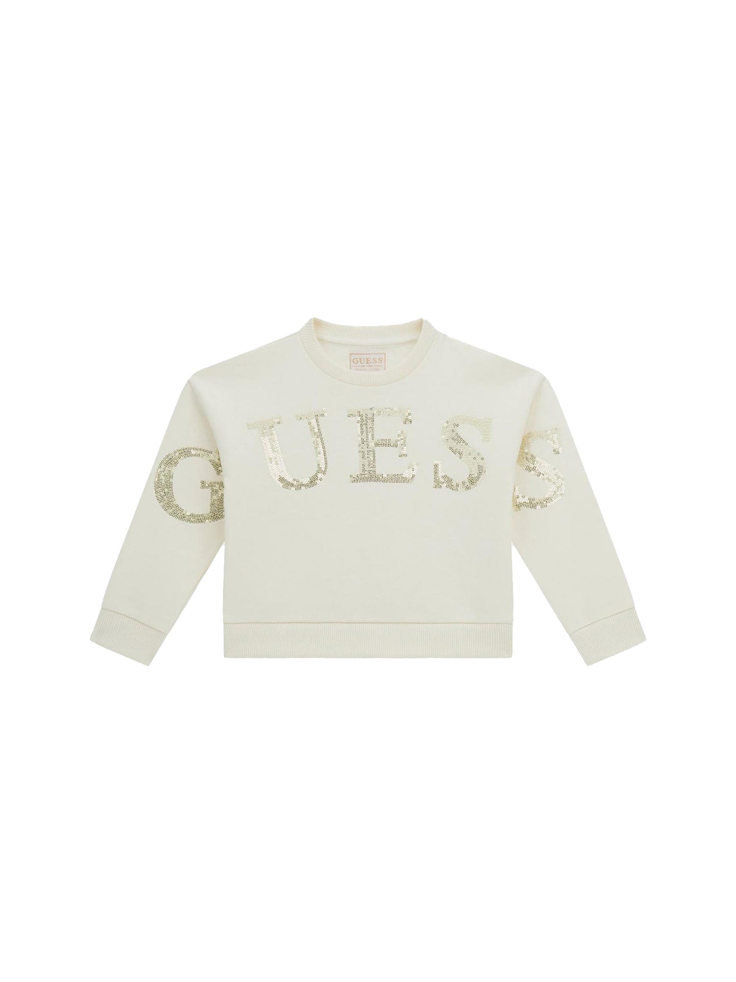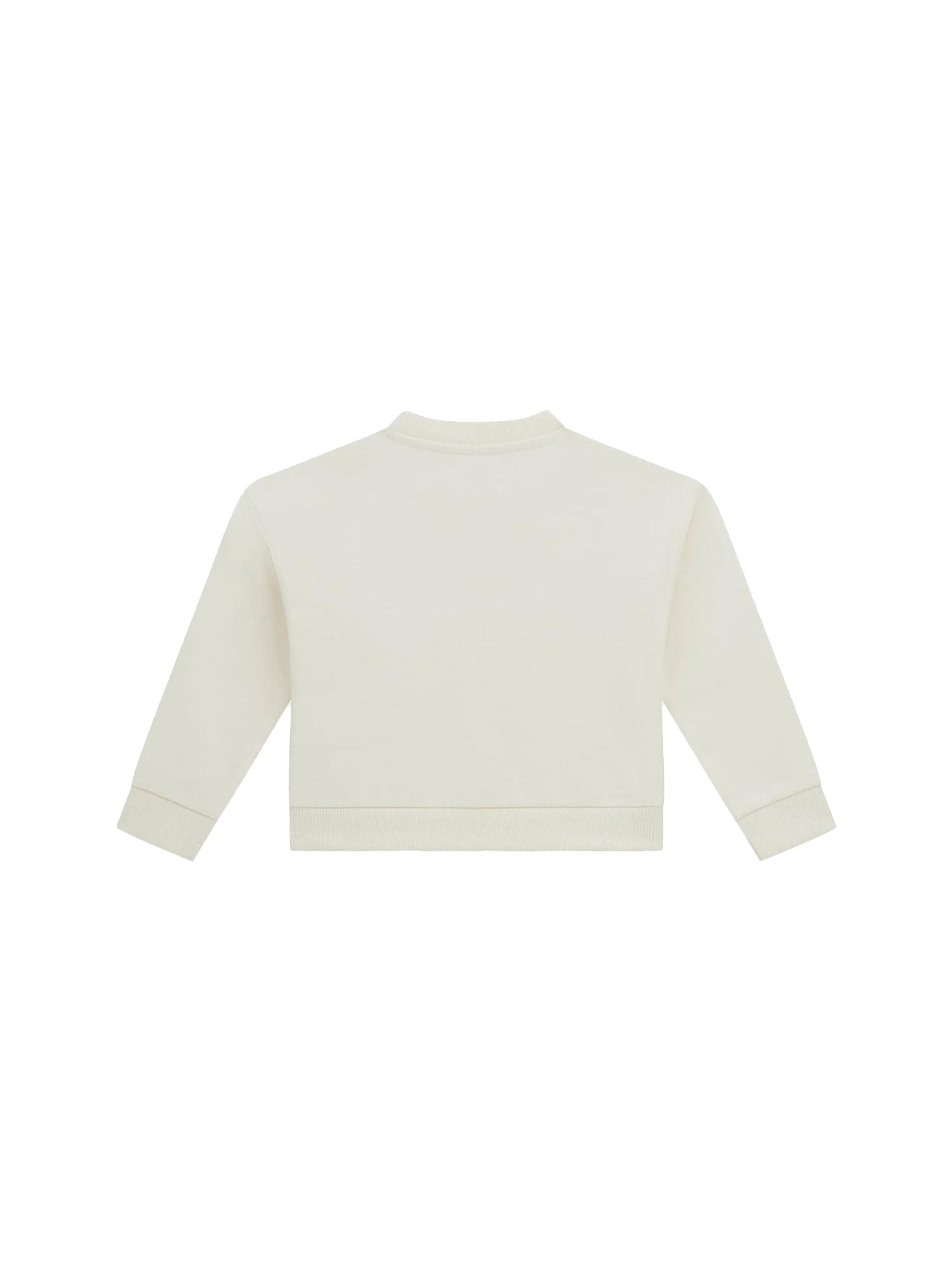 Felpa girocollo Guess per neonata, dal design minimal e raffinato. Realizzata in morbido cotone, presenta il maxi logo “GUESS” impreziosito da strass luminosi che donano un tocco brillante al look casual.