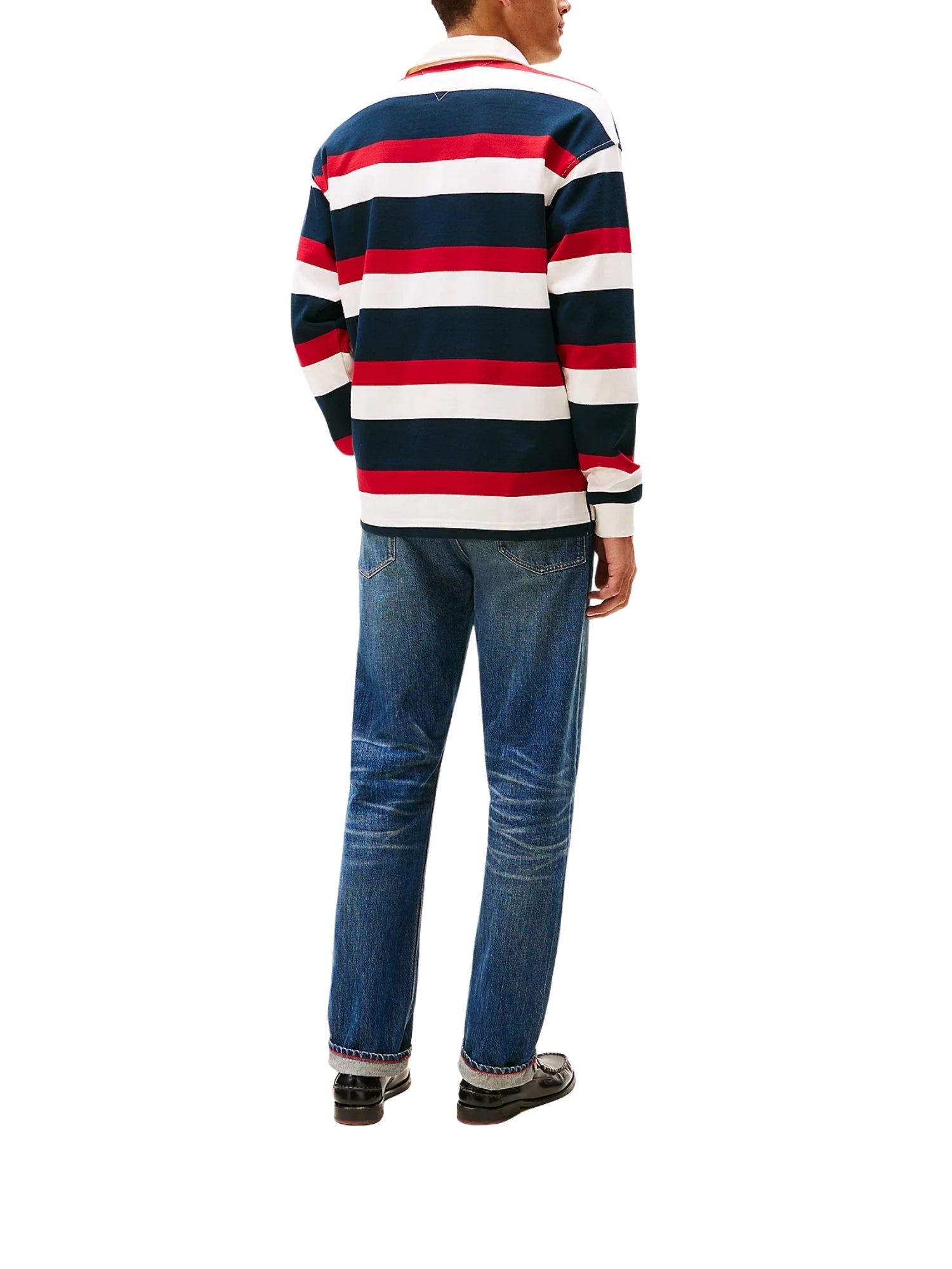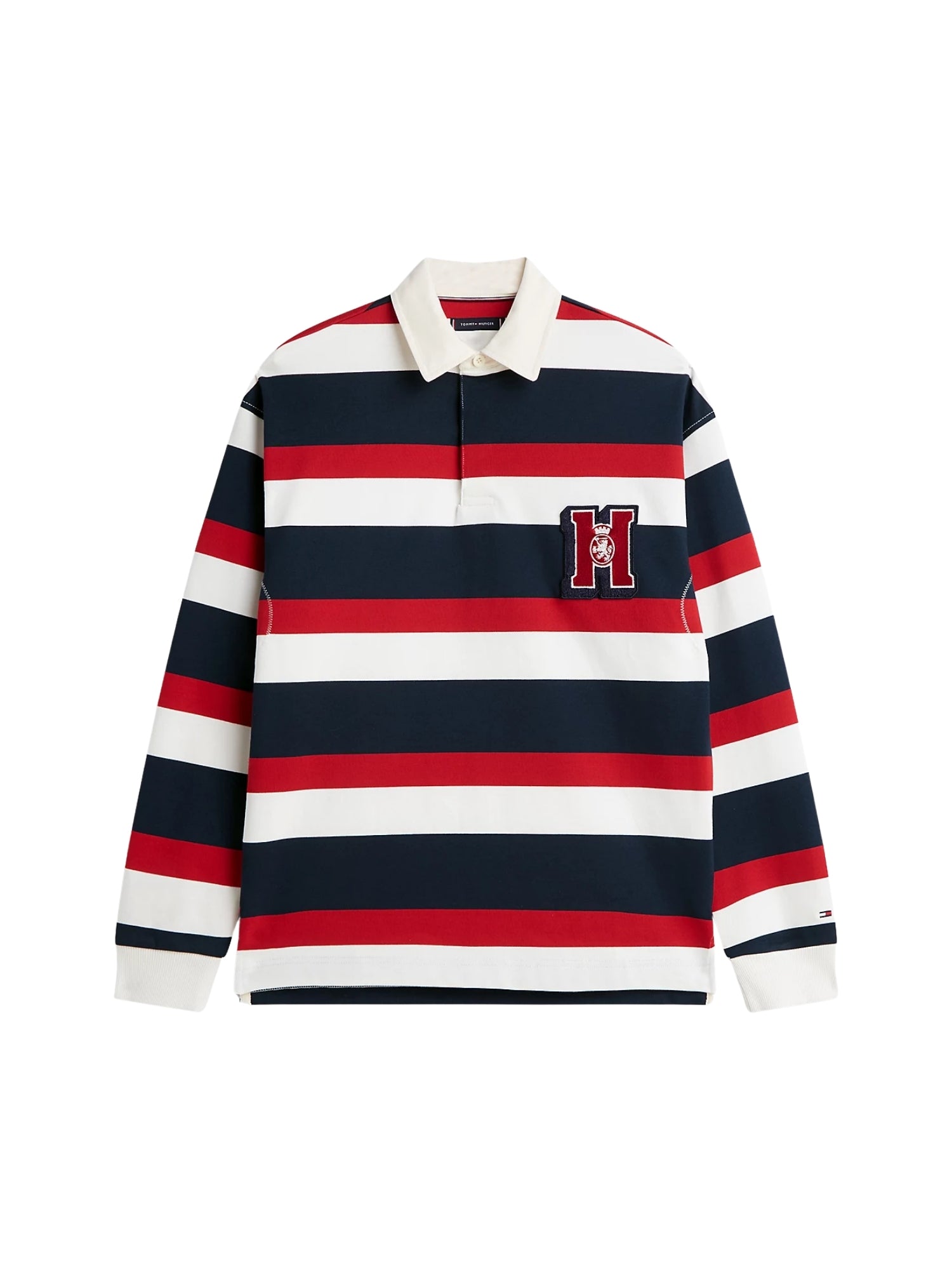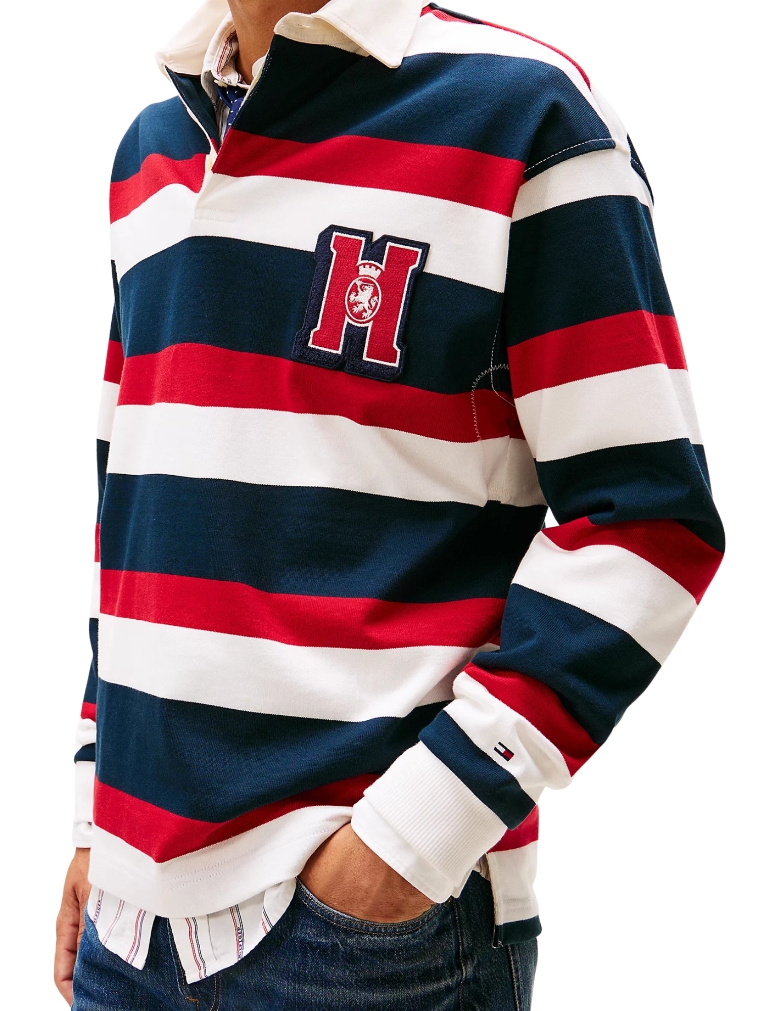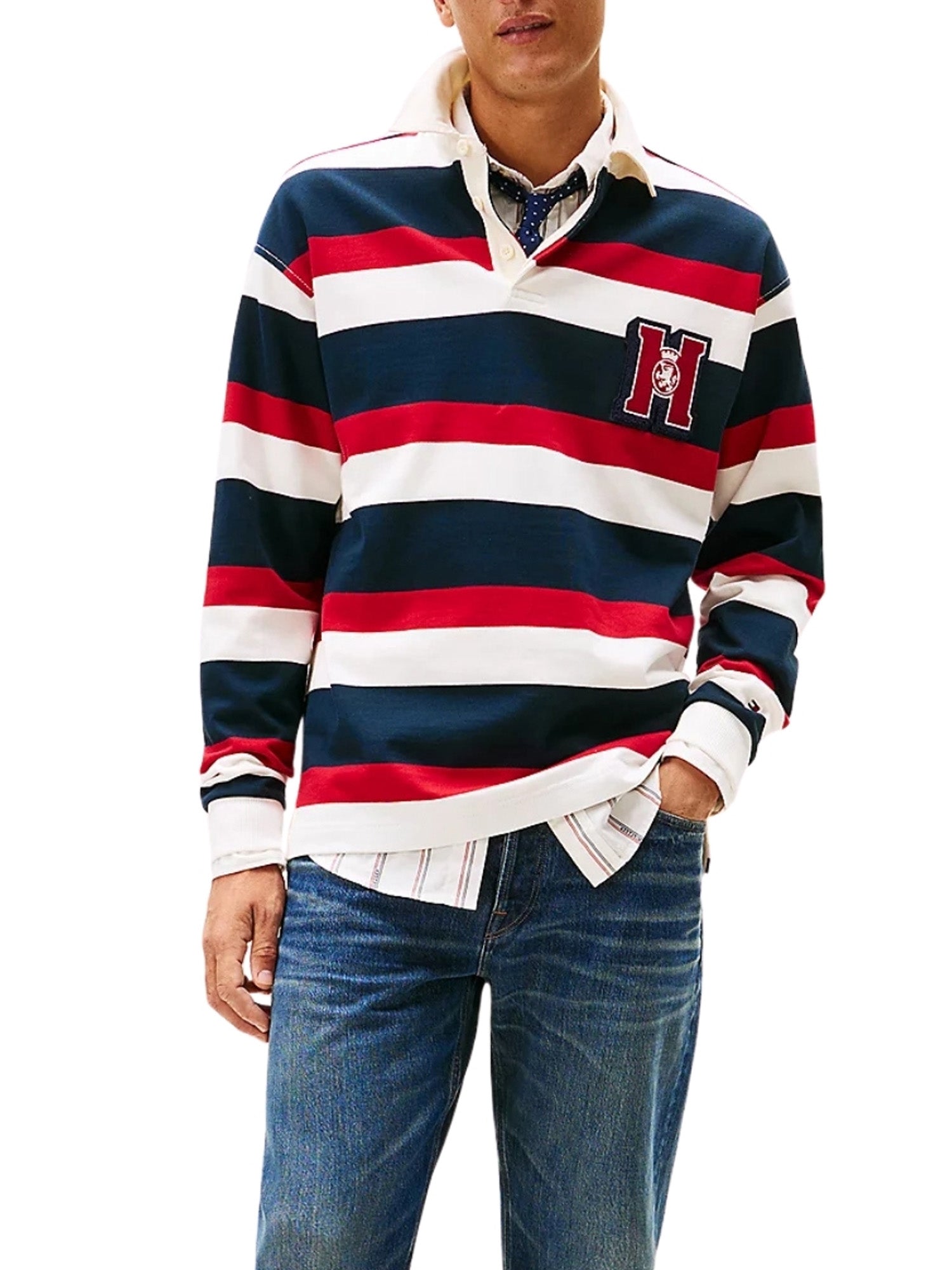 Felpa rugby con maniche lunghe Tommy Hilfiger modello crest striped ecru’ multi La polo rugby a righe, ornata dall'applique del logo sul petto, è il capo ideale per aggiungere un tocco esclusivo agli outfit casual.