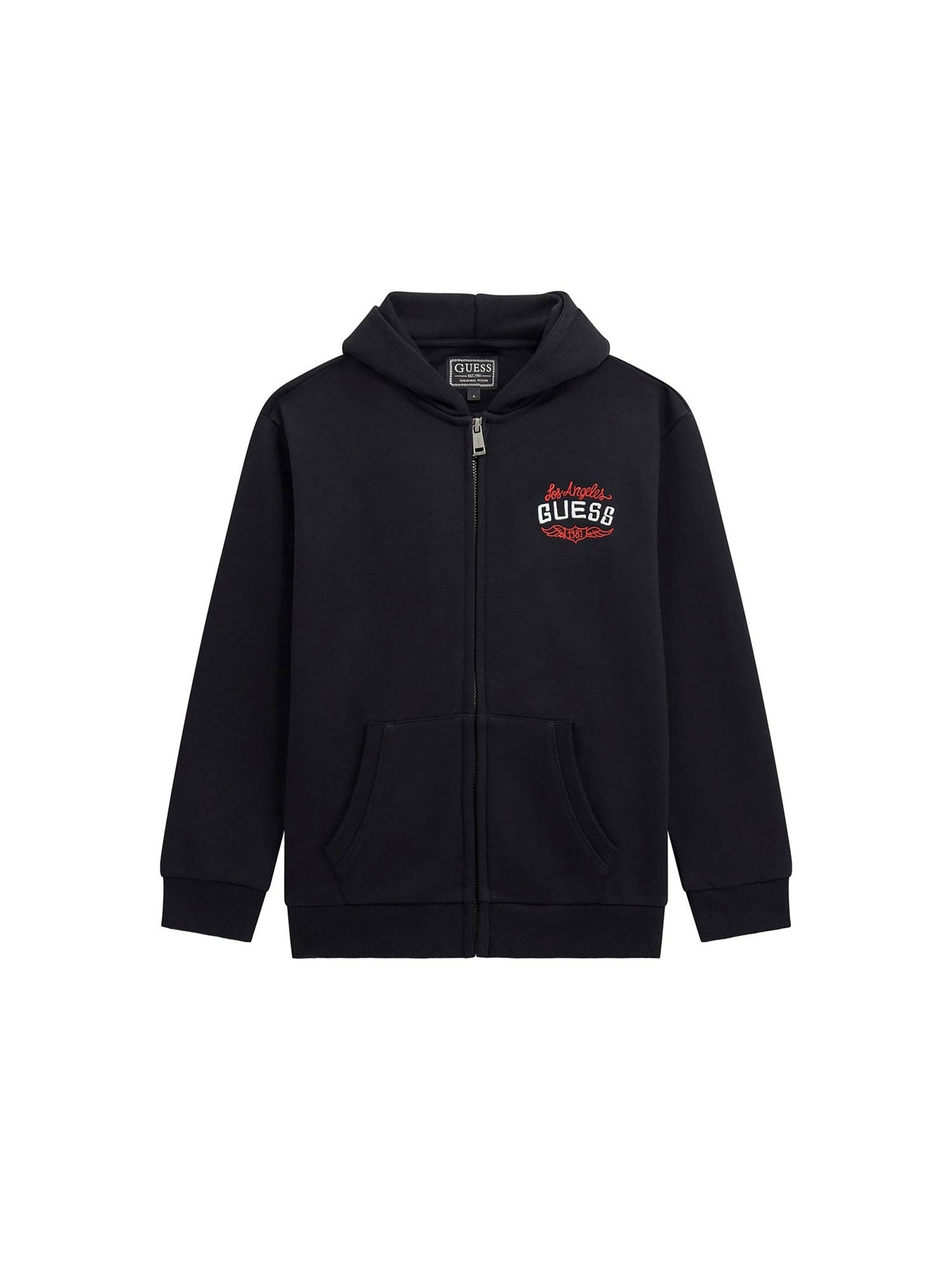 Felpa Guess ragazzo con cappuccio e zip, dal design casual e dal carattere deciso. Il modello presenta il logo ricamato “Los Angeles Guess” sul petto e una maxi versione sulla schiena, con dettagli effetto college che richiamano lo stile sportivo americano.